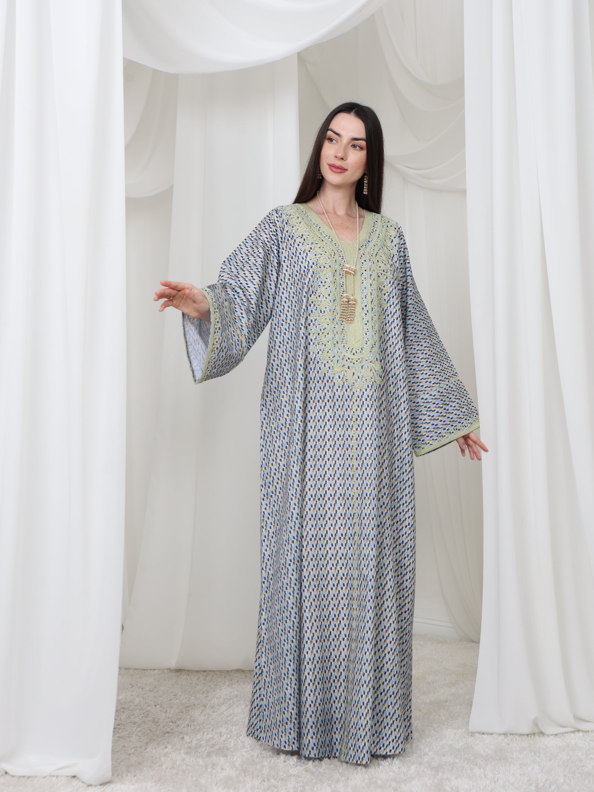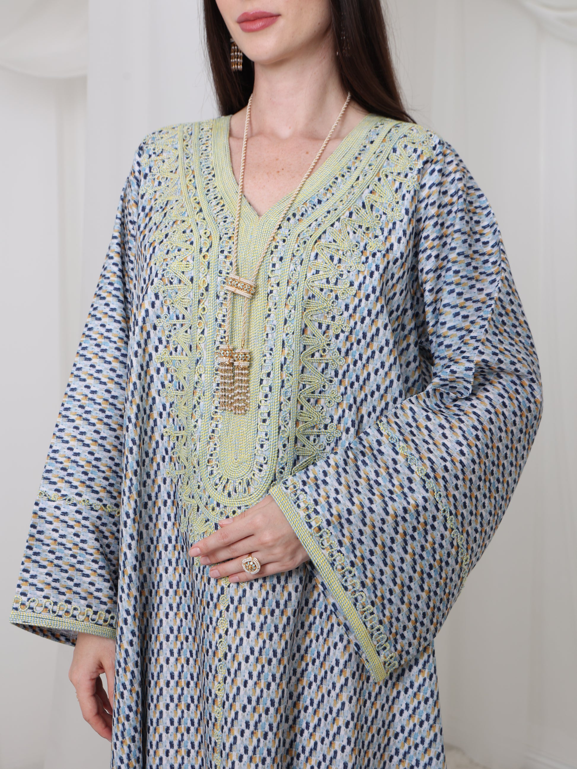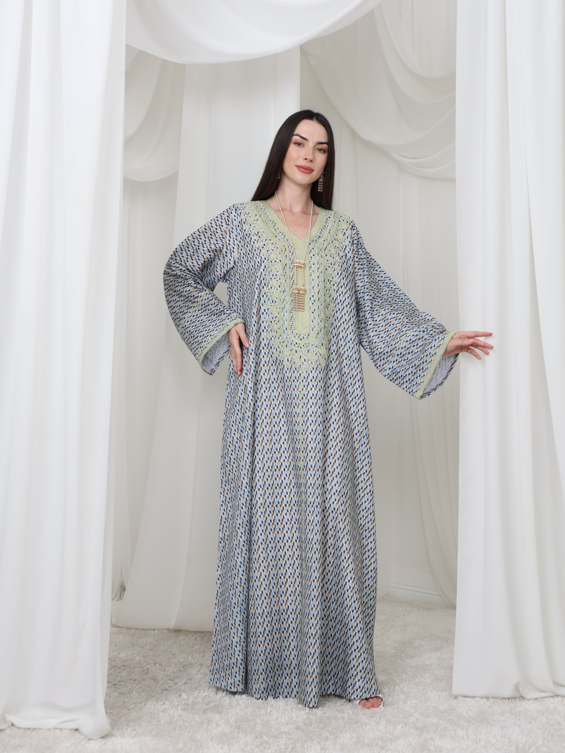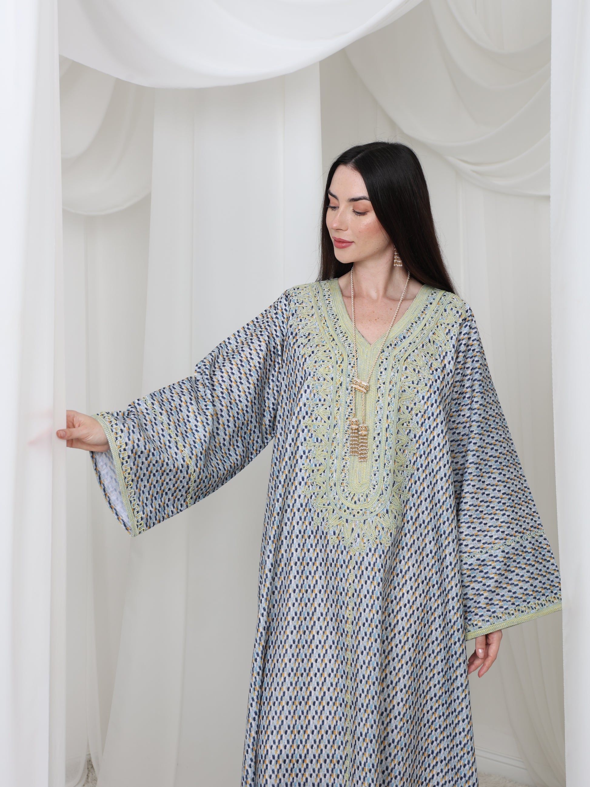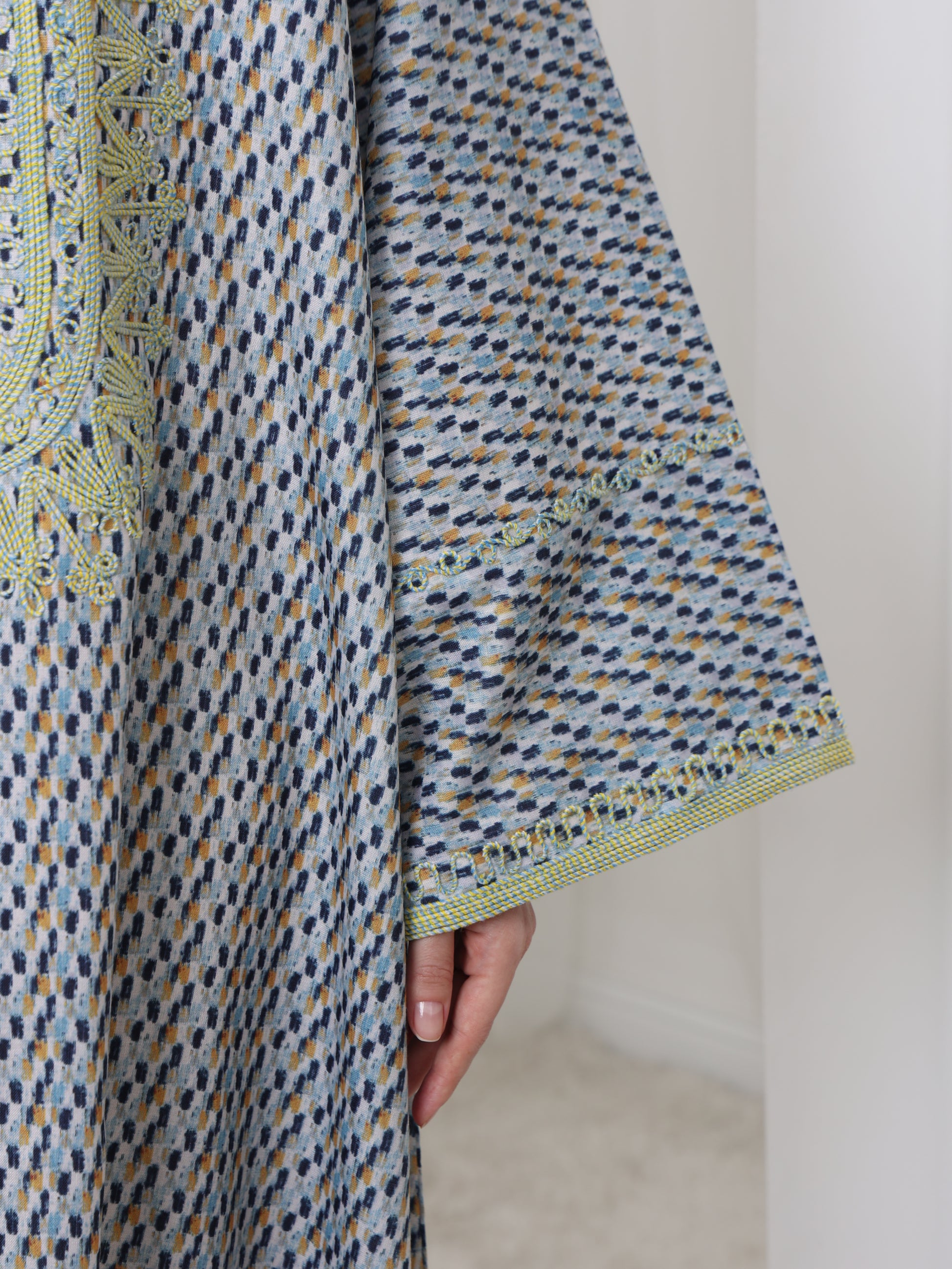 يتميز هذا القفطان الرائع بقاعدة زرقاء ناعمة بنقش هندسي متقن، يتناقض بشكل مثالي مع خط عنق مطرز باللون الأصفر الفاتح. تصميمه الفضفاض والمنسدل يوفر سهولة الحركة وراحة طوال اليوم، بينما تضفي الحرفية الدقيقة عند الصدر سحرًا رقيقًا وأنيقًا. مصنوع من قماش يسمح بمرور الهواء، هذه القطعة مثالية للأيام الدافئة والأمسيات الدافئة. متوفر بمقاس واحد عالمي (الصدر ٢٣ بوصة، الطول ٥٨ بوصة)، ويسعدنا تقديم تعديلات مجانية لإضفاء لمسة شخصية.