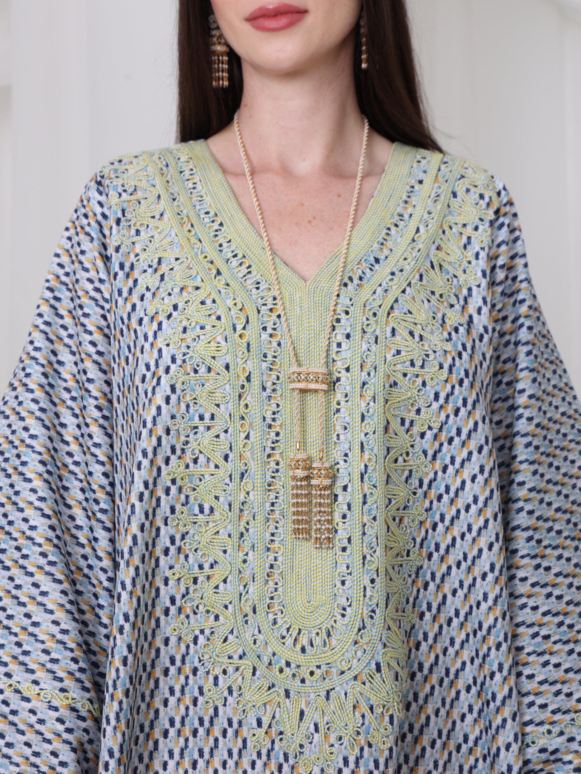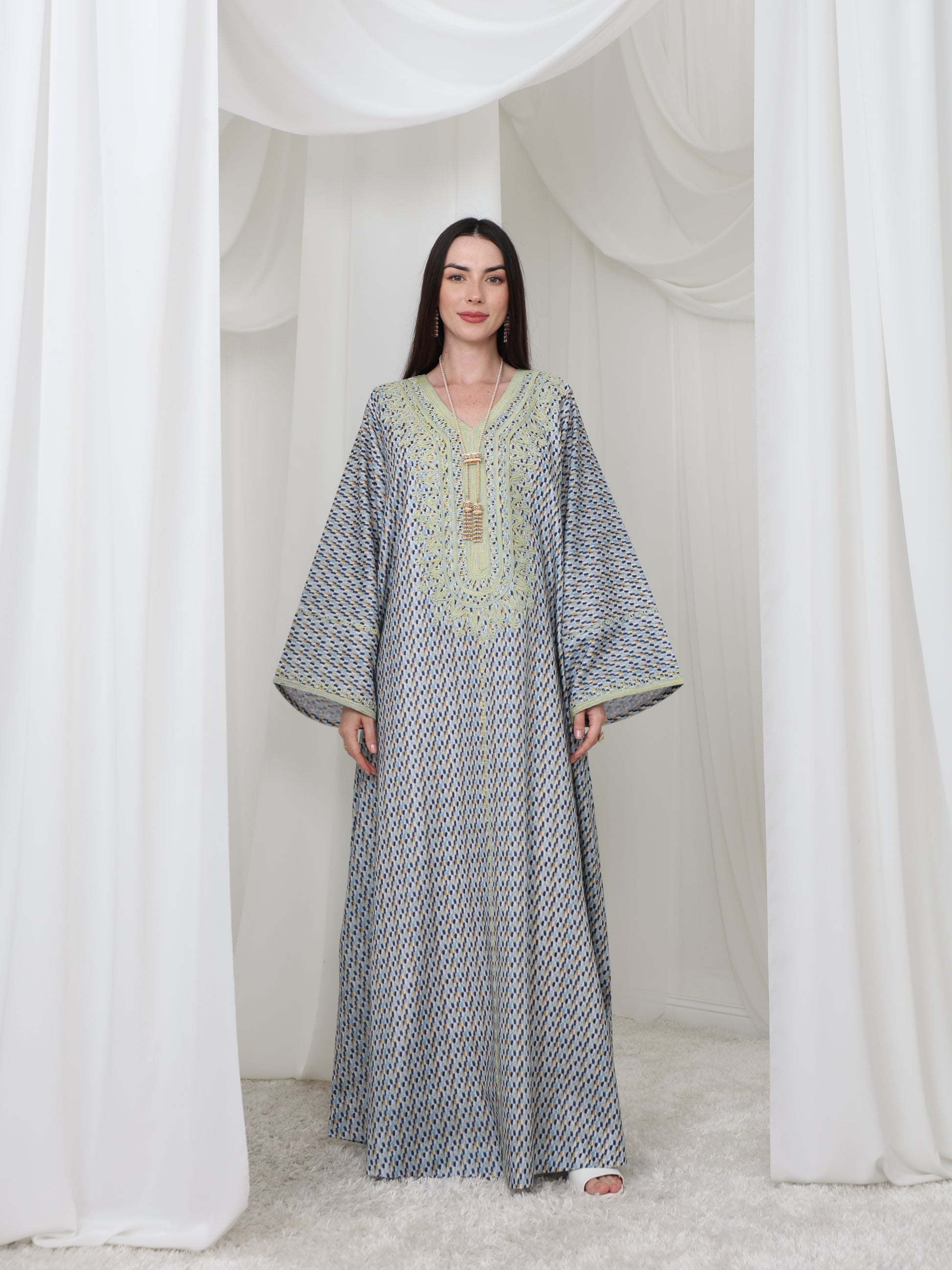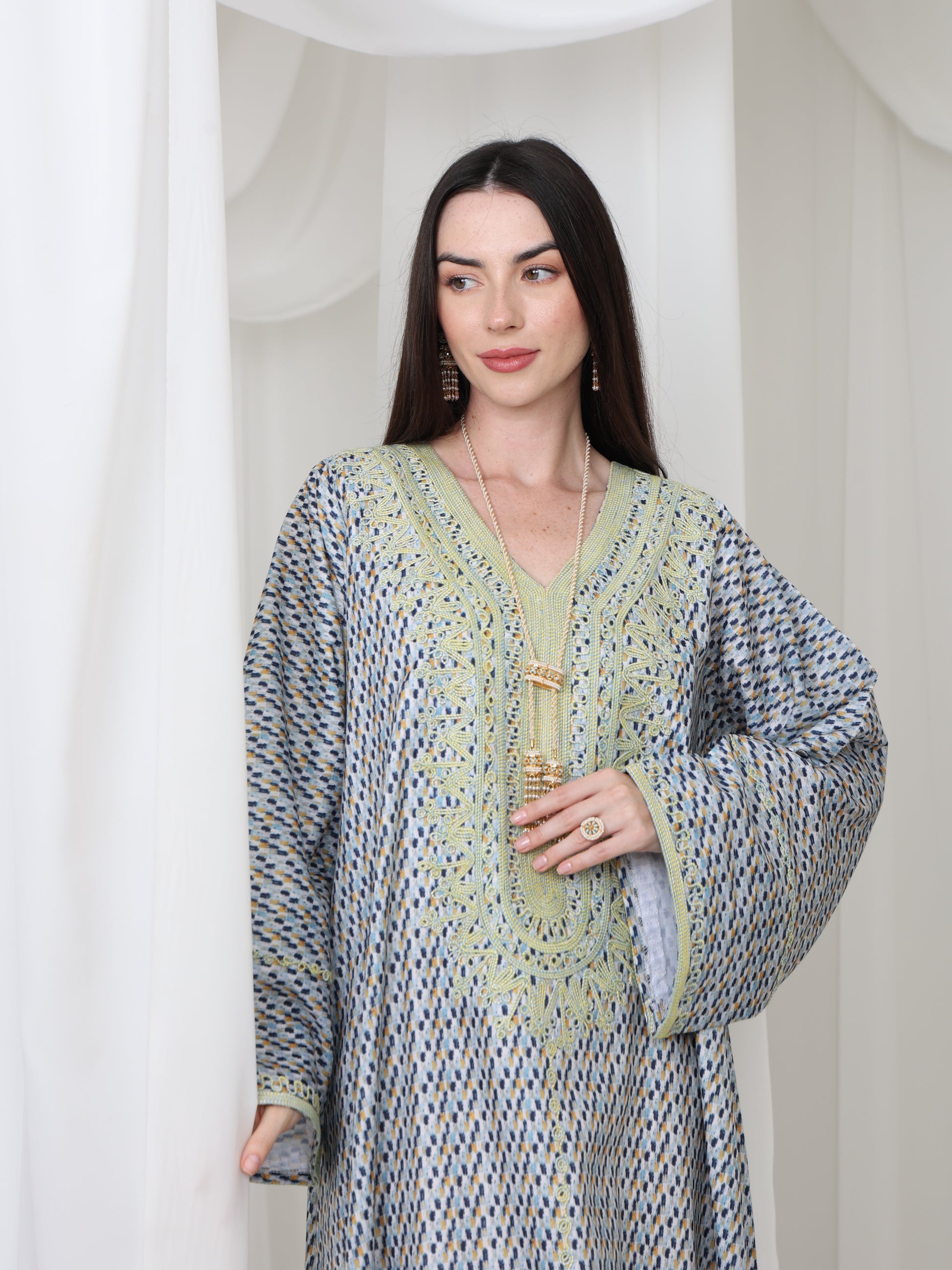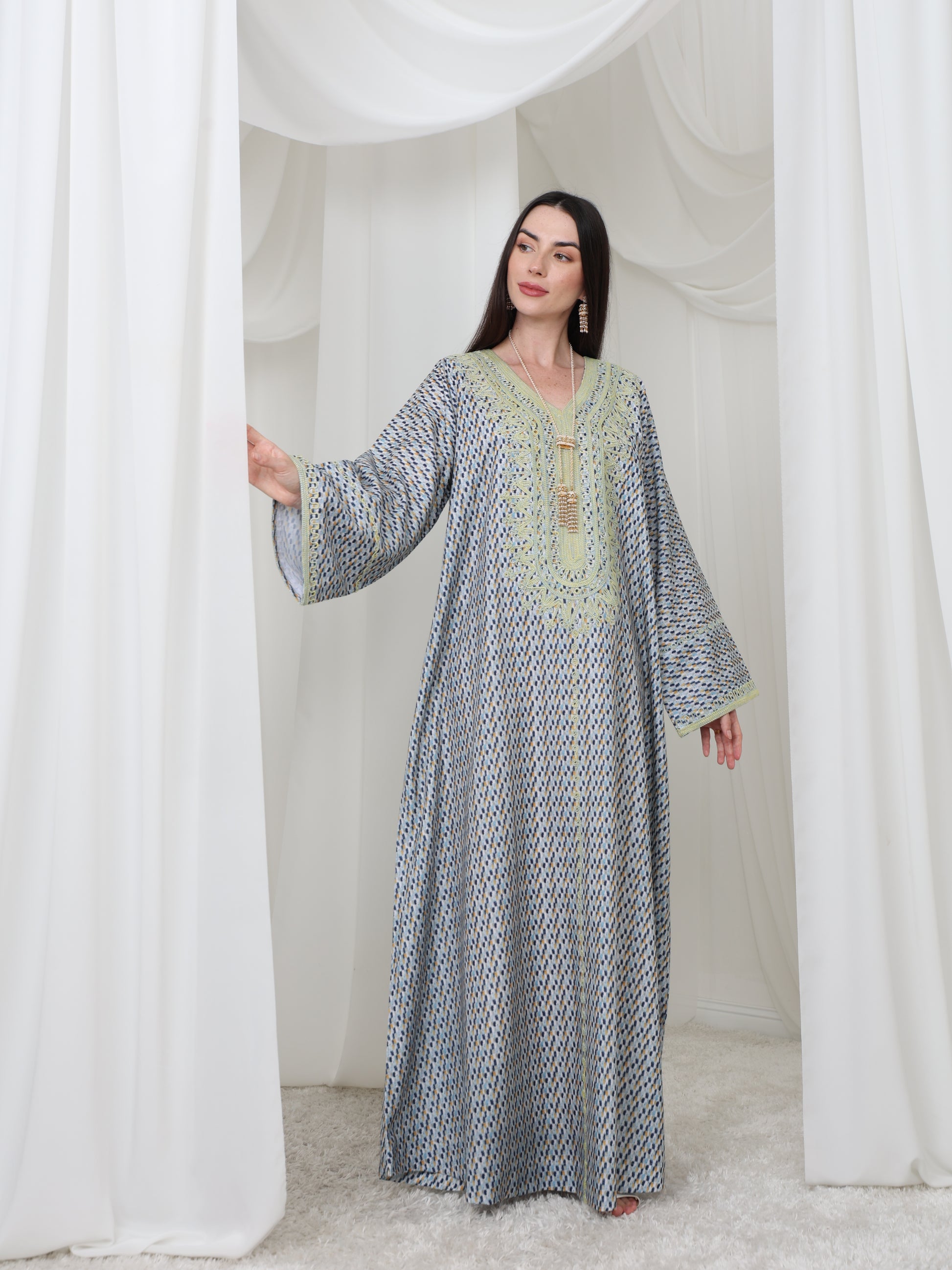 يتميز هذا القفطان الرائع بقاعدة زرقاء ناعمة بنقش هندسي متقن، يتناقض بشكل مثالي مع خط عنق مطرز باللون الأصفر الفاتح. تصميمه الفضفاض والمنسدل يوفر سهولة الحركة وراحة طوال اليوم، بينما تضفي الحرفية الدقيقة عند الصدر سحرًا رقيقًا وأنيقًا. مصنوع من قماش يسمح بمرور الهواء، هذه القطعة مثالية للأيام الدافئة والأمسيات الدافئة. متوفر بمقاس واحد عالمي (الصدر ٢٣ بوصة، الطول ٥٨ بوصة)، ويسعدنا تقديم تعديلات مجانية لإضفاء لمسة شخصية.