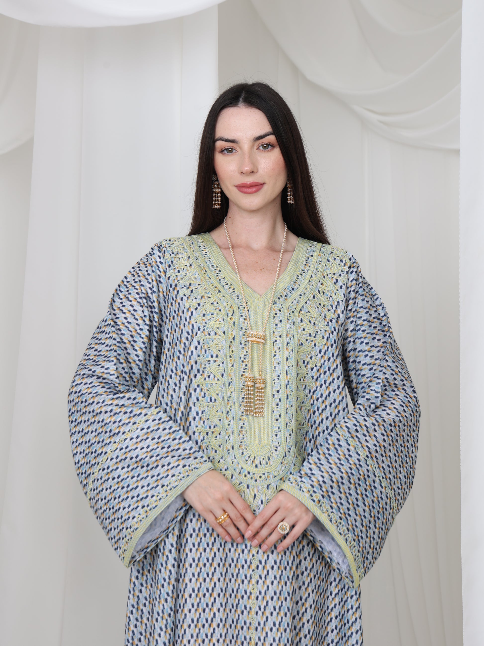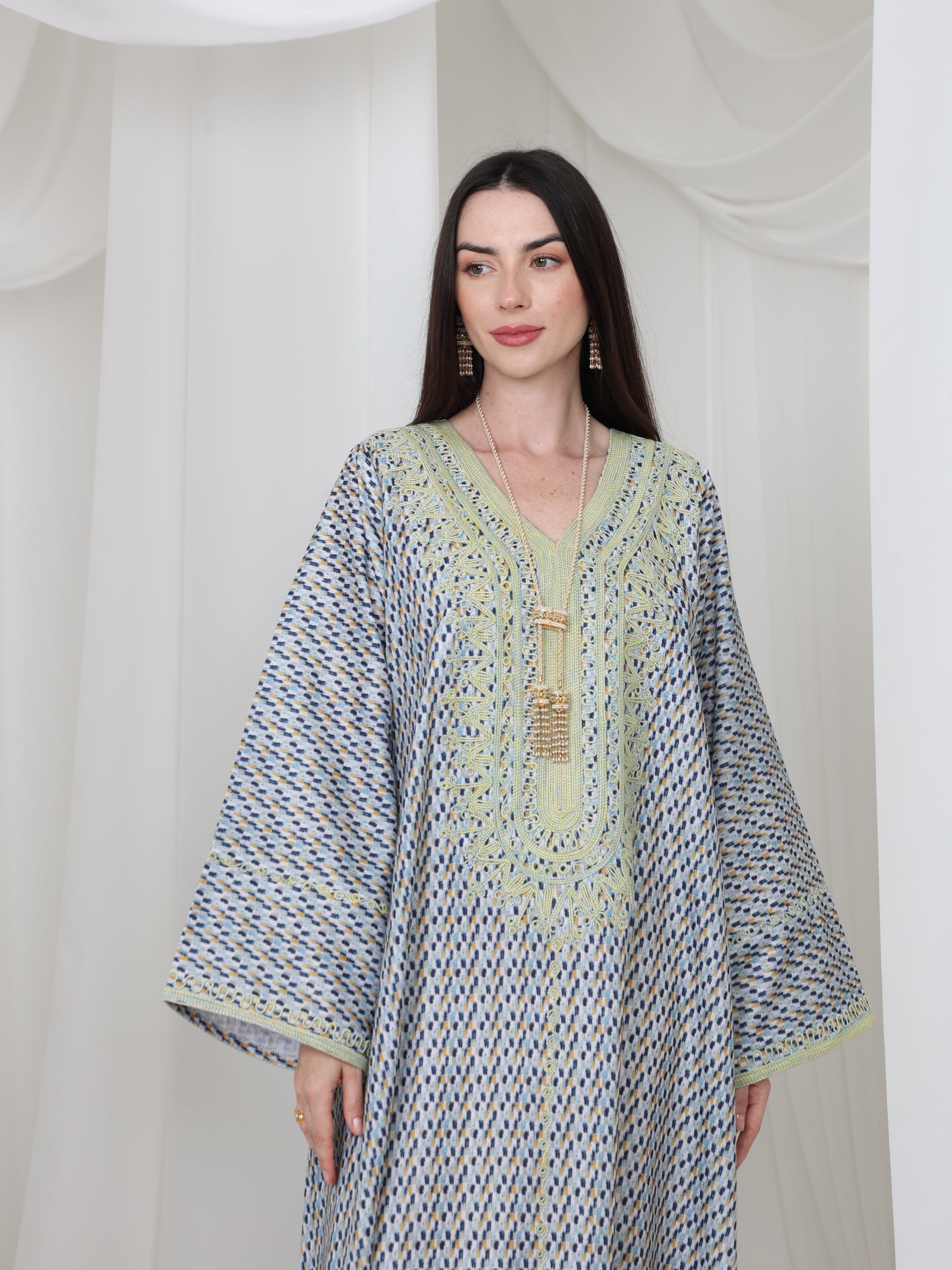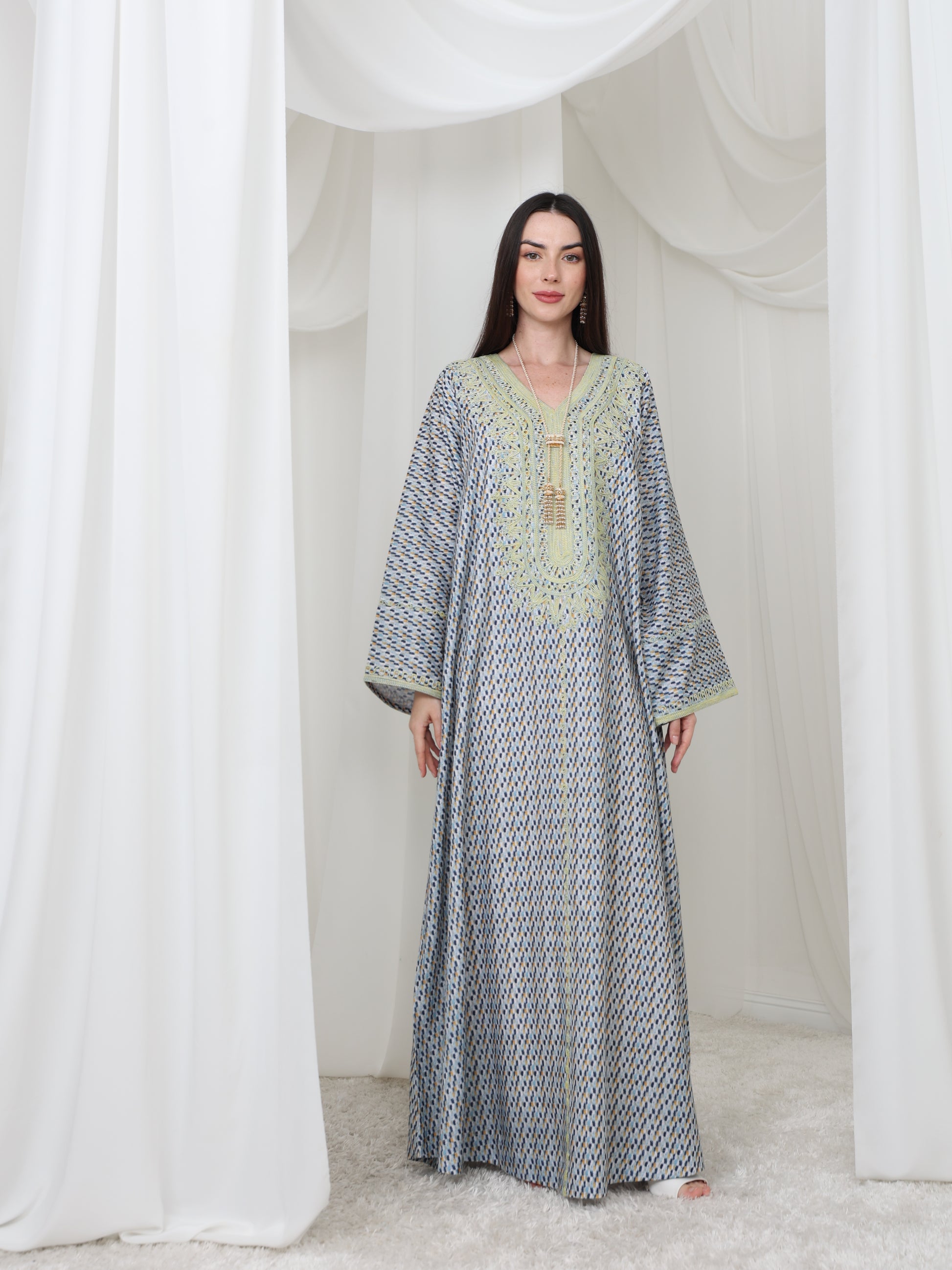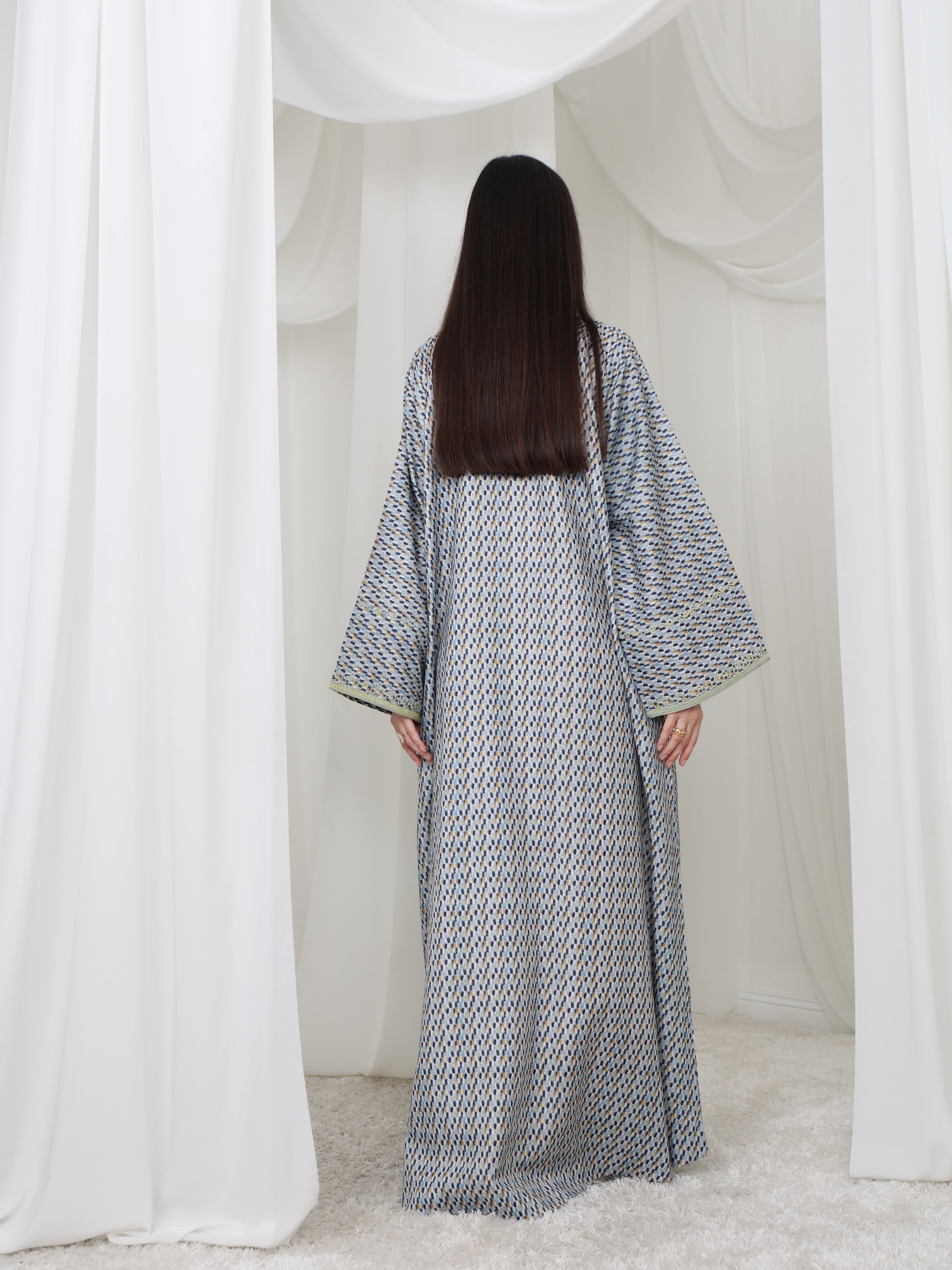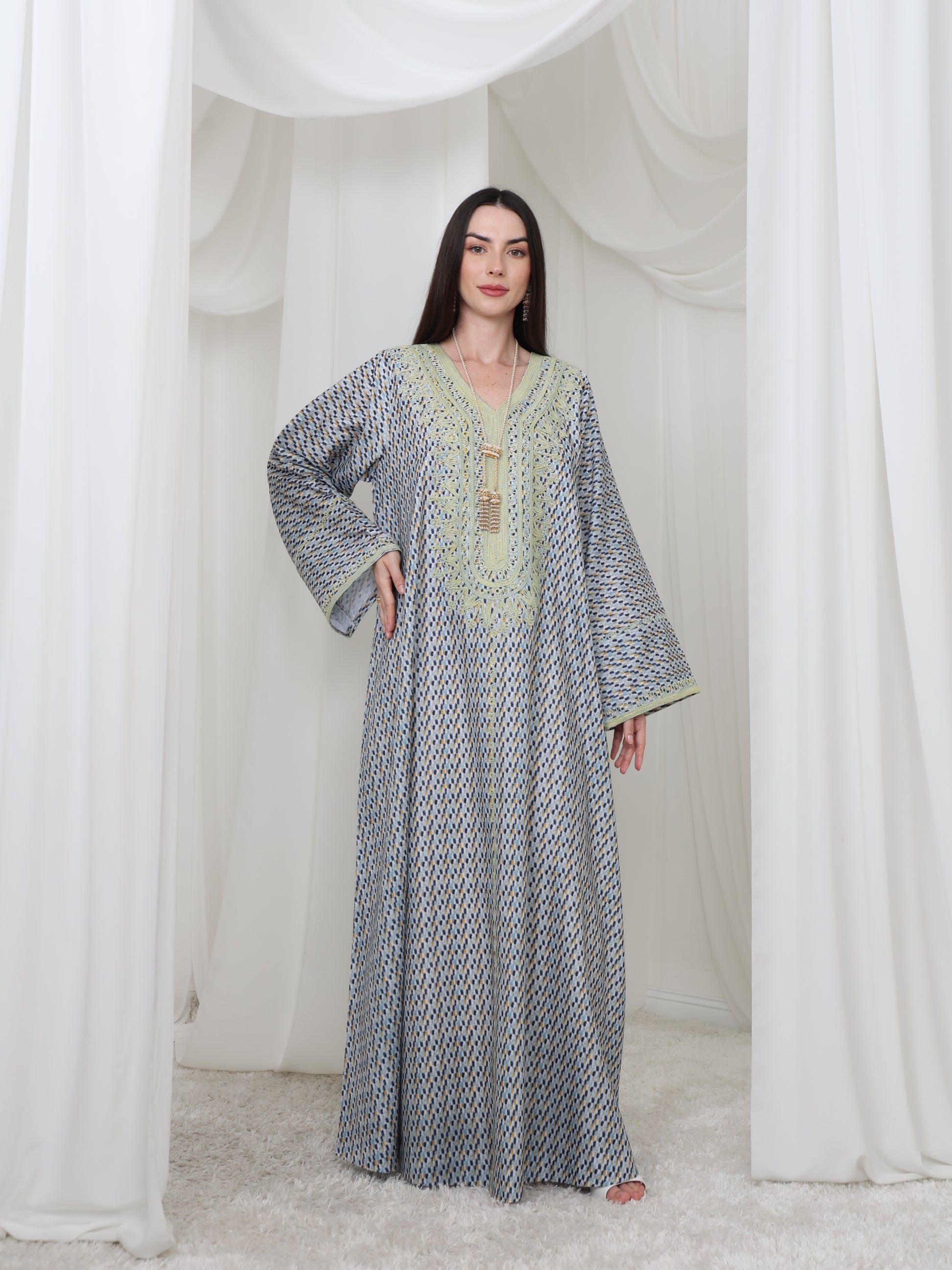 يتميز هذا القفطان الرائع بقاعدة زرقاء ناعمة بنقش هندسي متقن، يتناقض بشكل مثالي مع خط عنق مطرز باللون الأصفر الفاتح. تصميمه الفضفاض والمنسدل يوفر سهولة الحركة وراحة طوال اليوم، بينما تضفي الحرفية الدقيقة عند الصدر سحرًا رقيقًا وأنيقًا. مصنوع من قماش يسمح بمرور الهواء، هذه القطعة مثالية للأيام الدافئة والأمسيات الدافئة. متوفر بمقاس واحد عالمي (الصدر ٢٣ بوصة، الطول ٥٨ بوصة)، ويسعدنا تقديم تعديلات مجانية لإضفاء لمسة شخصية.