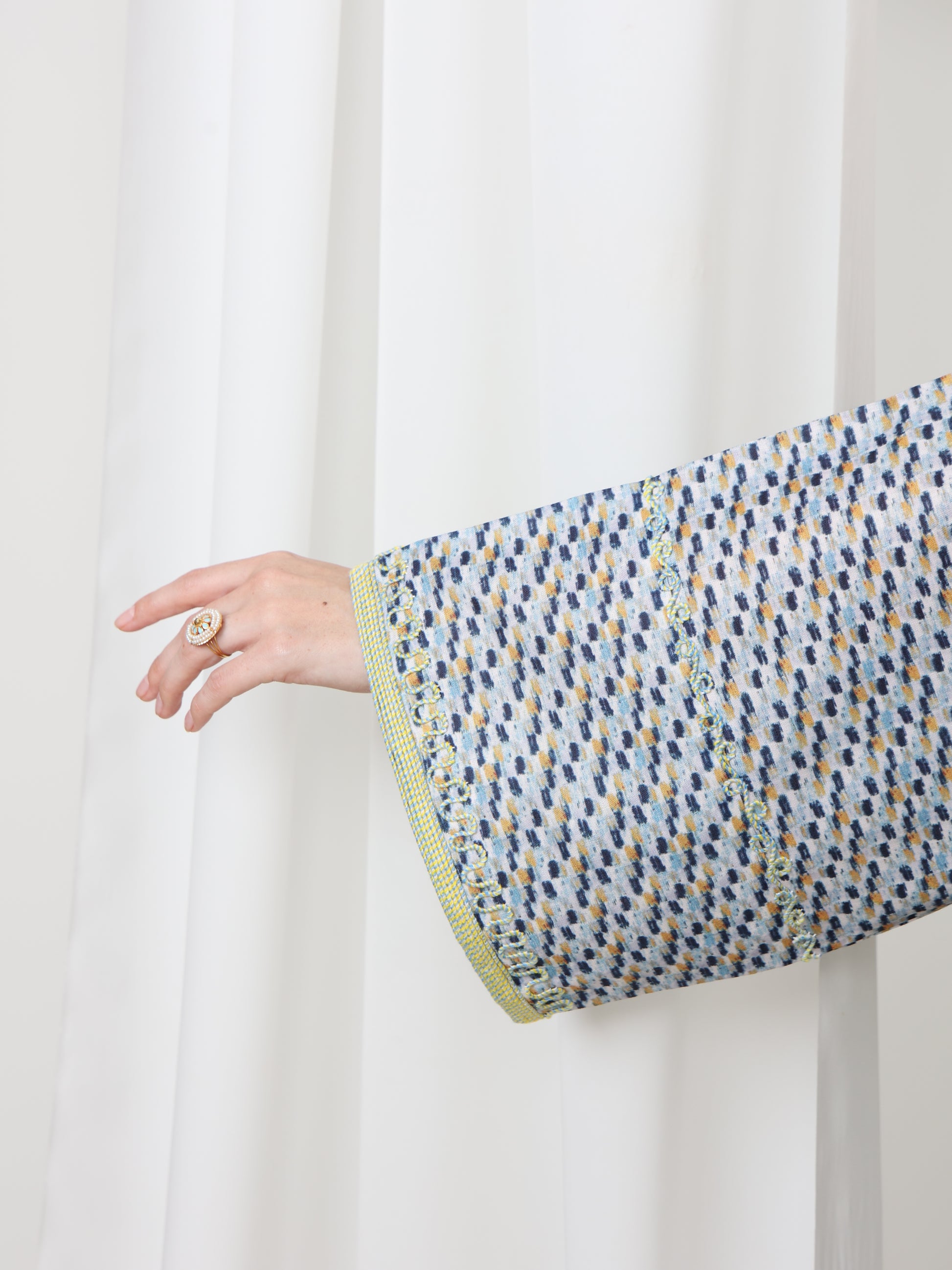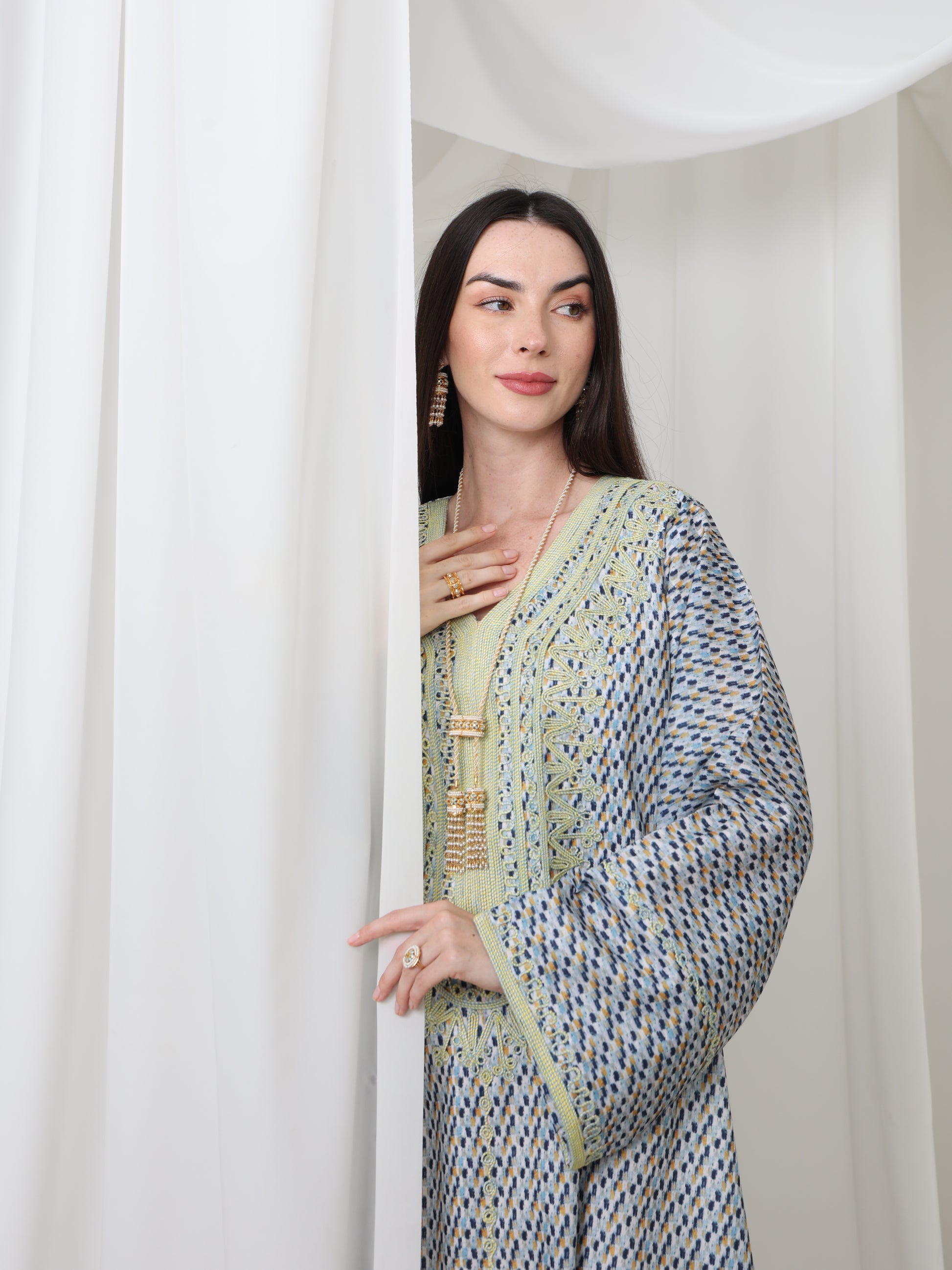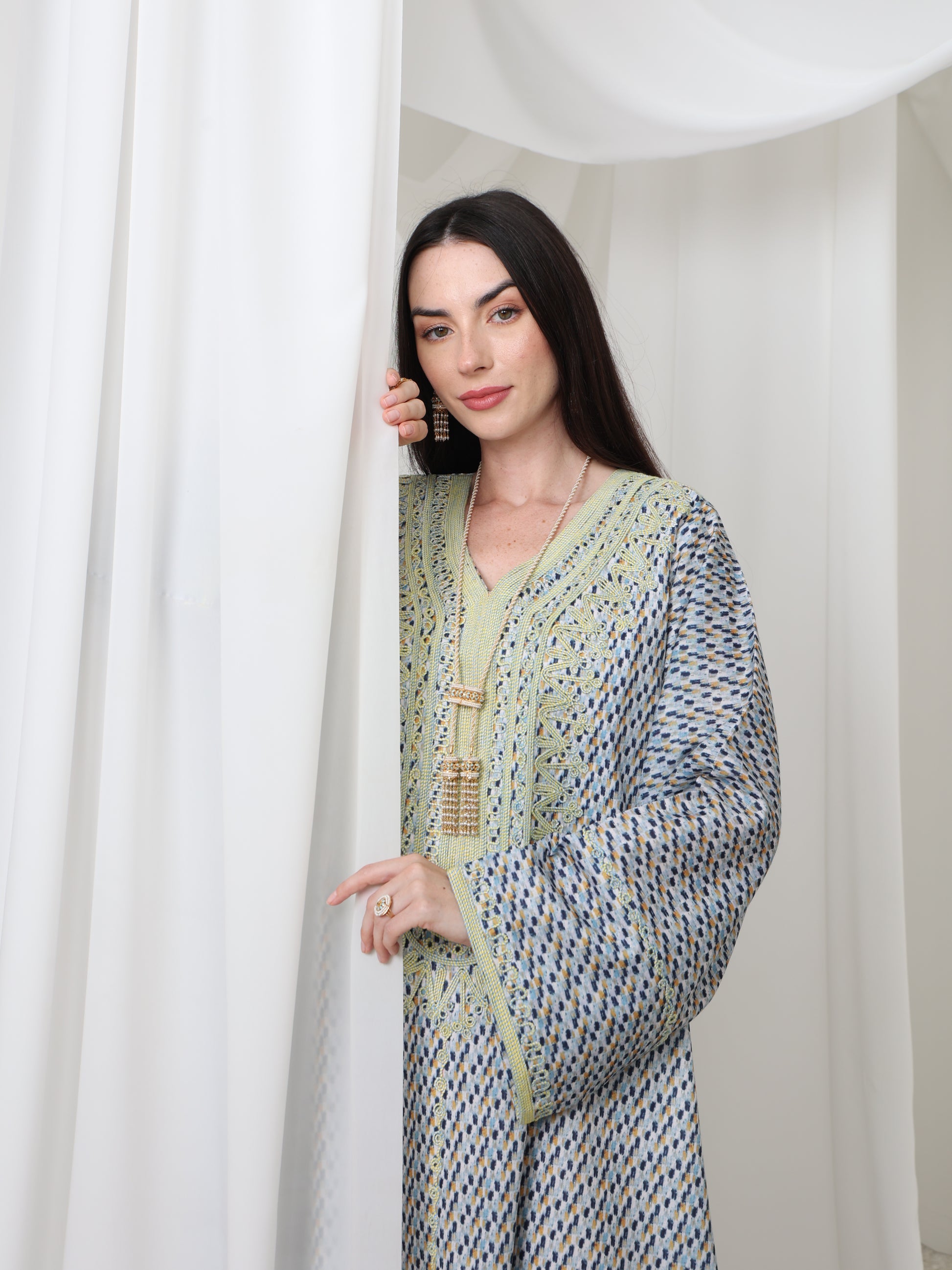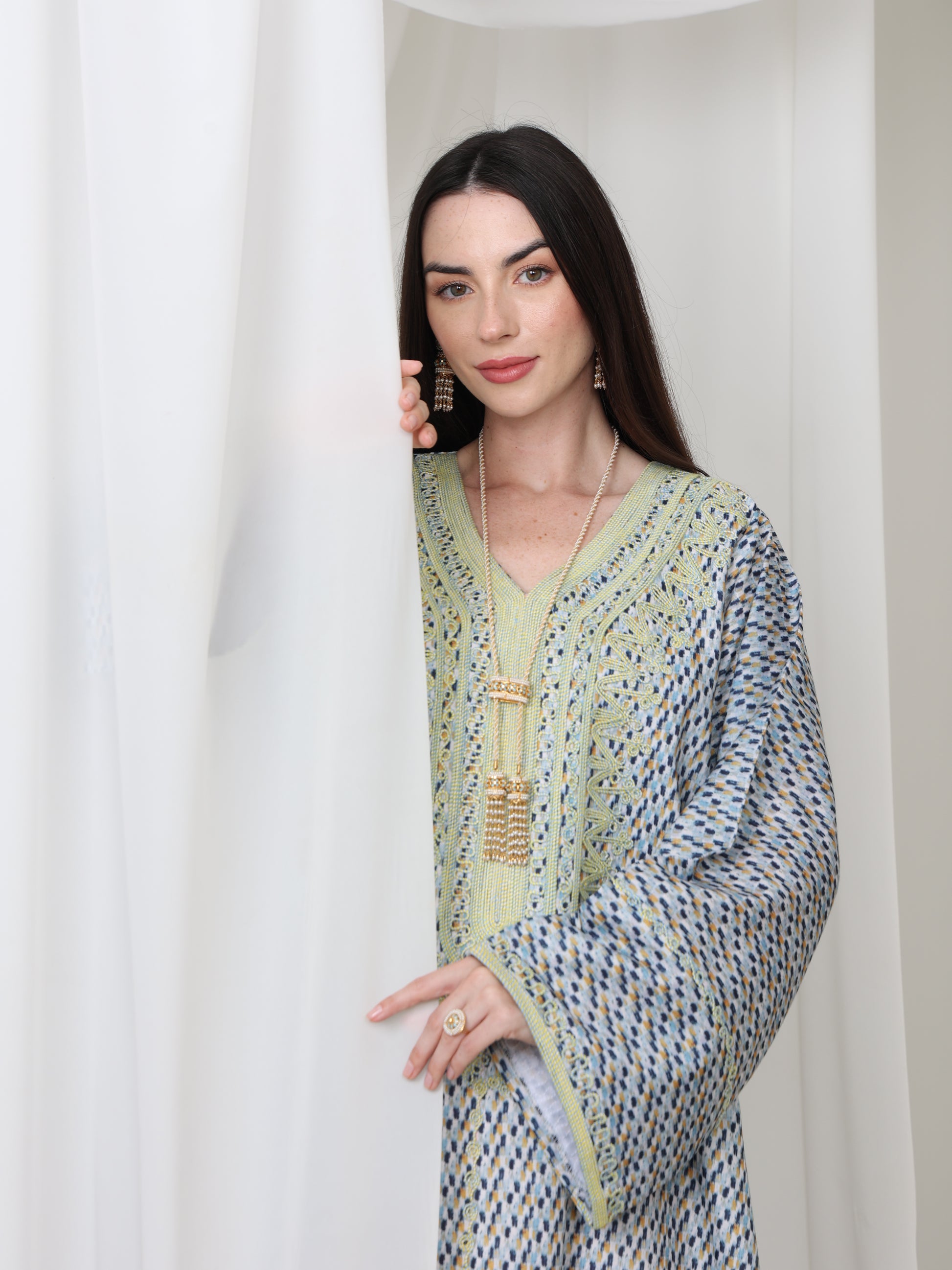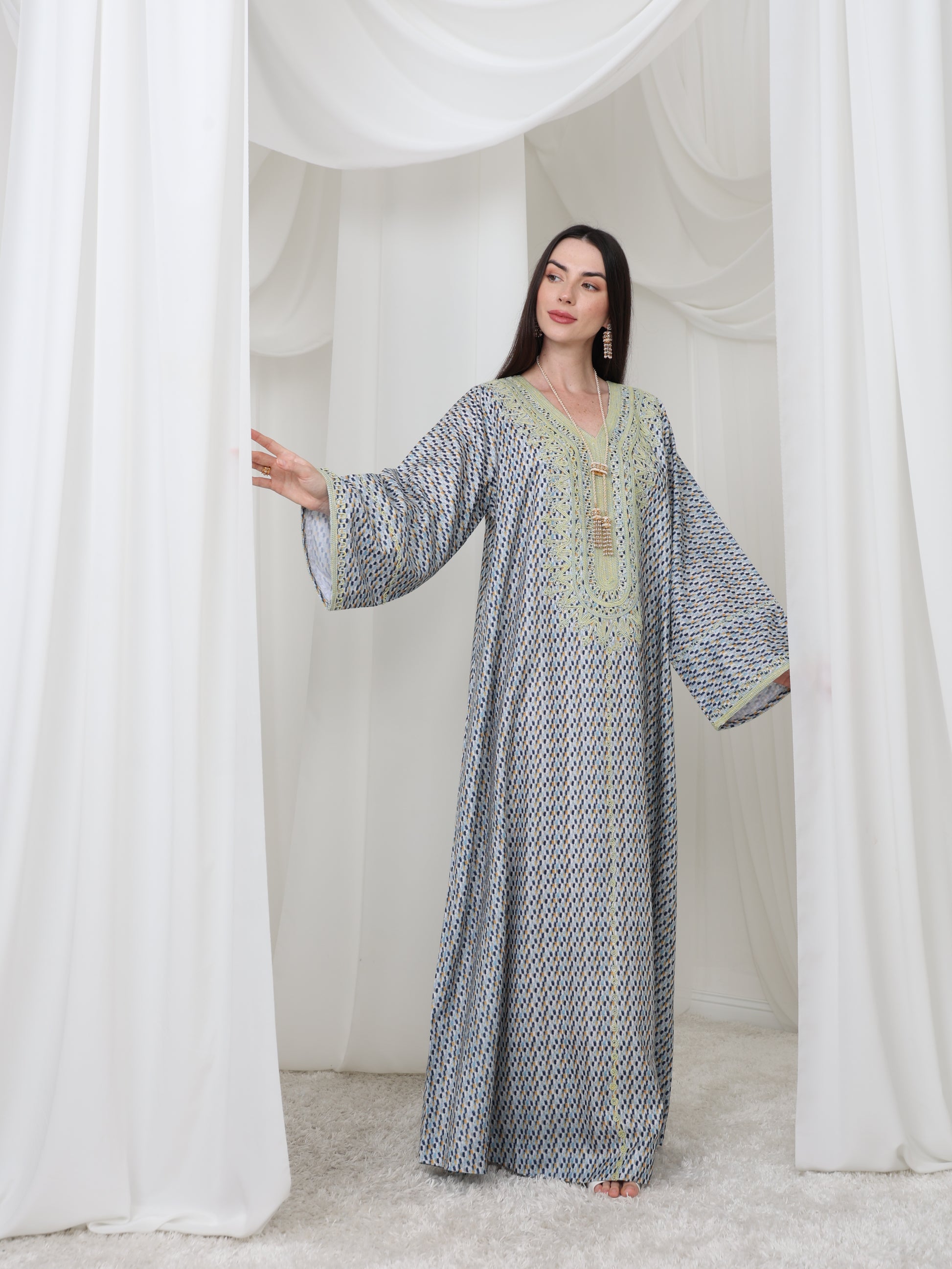 يتميز هذا القفطان الرائع بقاعدة زرقاء ناعمة بنقش هندسي متقن، يتناقض بشكل مثالي مع خط عنق مطرز باللون الأصفر الفاتح. تصميمه الفضفاض والمنسدل يوفر سهولة الحركة وراحة طوال اليوم، بينما تضفي الحرفية الدقيقة عند الصدر سحرًا رقيقًا وأنيقًا. مصنوع من قماش يسمح بمرور الهواء، هذه القطعة مثالية للأيام الدافئة والأمسيات الدافئة. متوفر بمقاس واحد عالمي (الصدر ٢٣ بوصة، الطول ٥٨ بوصة)، ويسعدنا تقديم تعديلات مجانية لإضفاء لمسة شخصية.