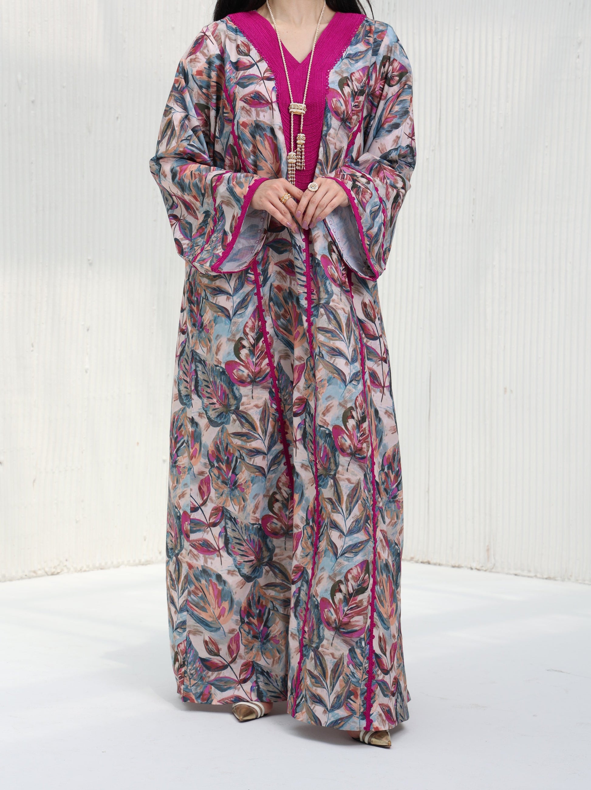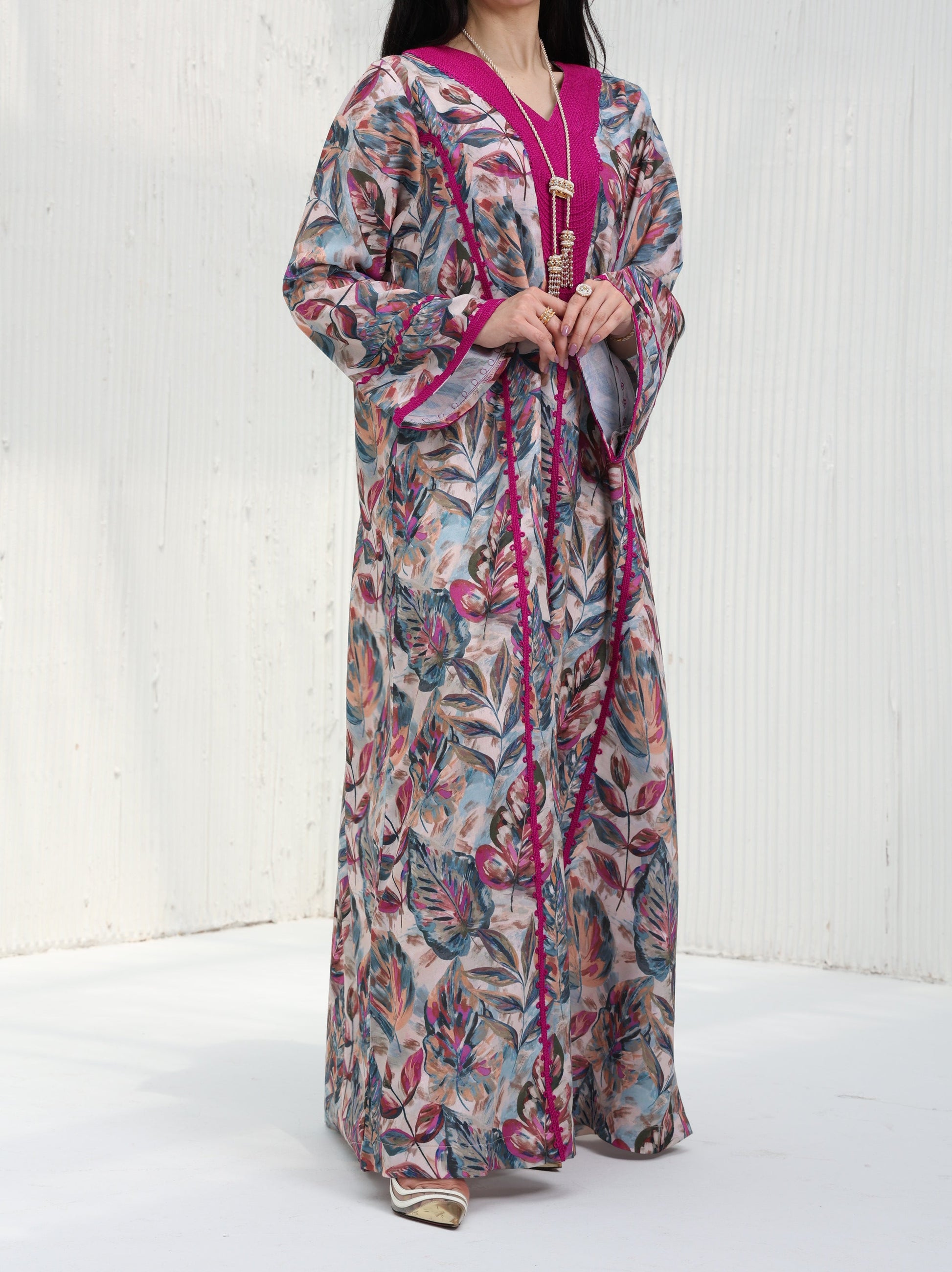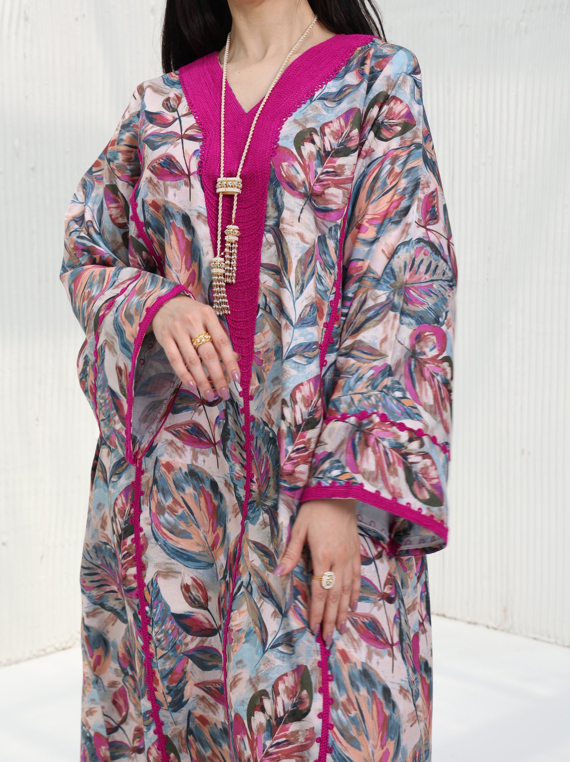 الوصف: يتميز فستان ماجنتا ميراج بسحر مرح وألوان نابضة بالحياة. تتميز خلفيته البيضاء بأنماط أوراق غريبة باللون الأزرق والخوخي والأرجواني، مع لمسات جميلة من التطريز الأرجواني المطابق. يضيف خط العنق على شكل حرف V لمسة من الرقي، وهو مثالي لإضفاء شعور بالمرح والأناقة على أي مناسبة. يجمع هذا الفستان الخفيف والمريح بين التصميم الجذاب والأناقة السهلة، مما يجعله خيارًا مميزًا للنزهات غير الرسمية والمناسبات الخاصة.