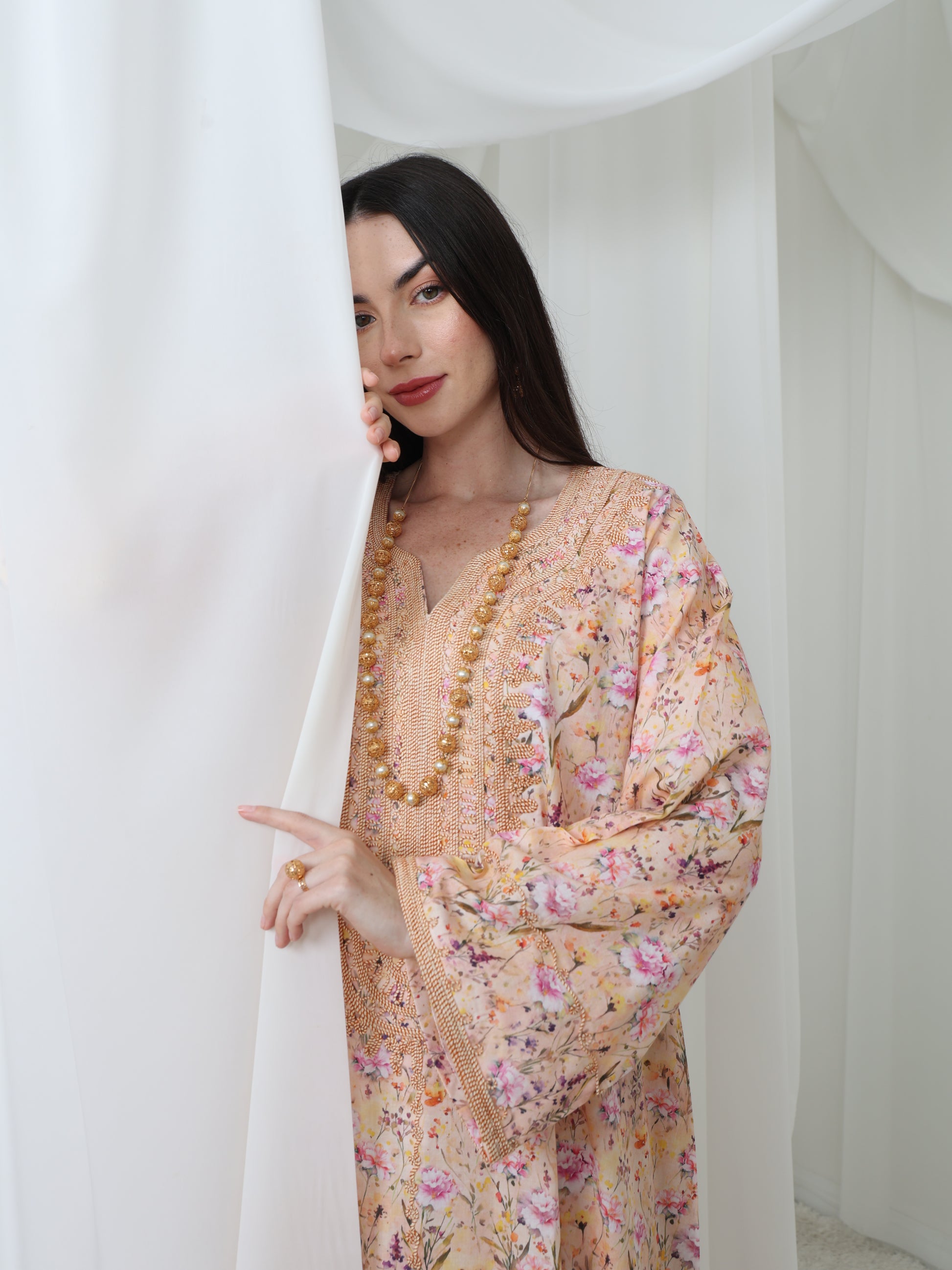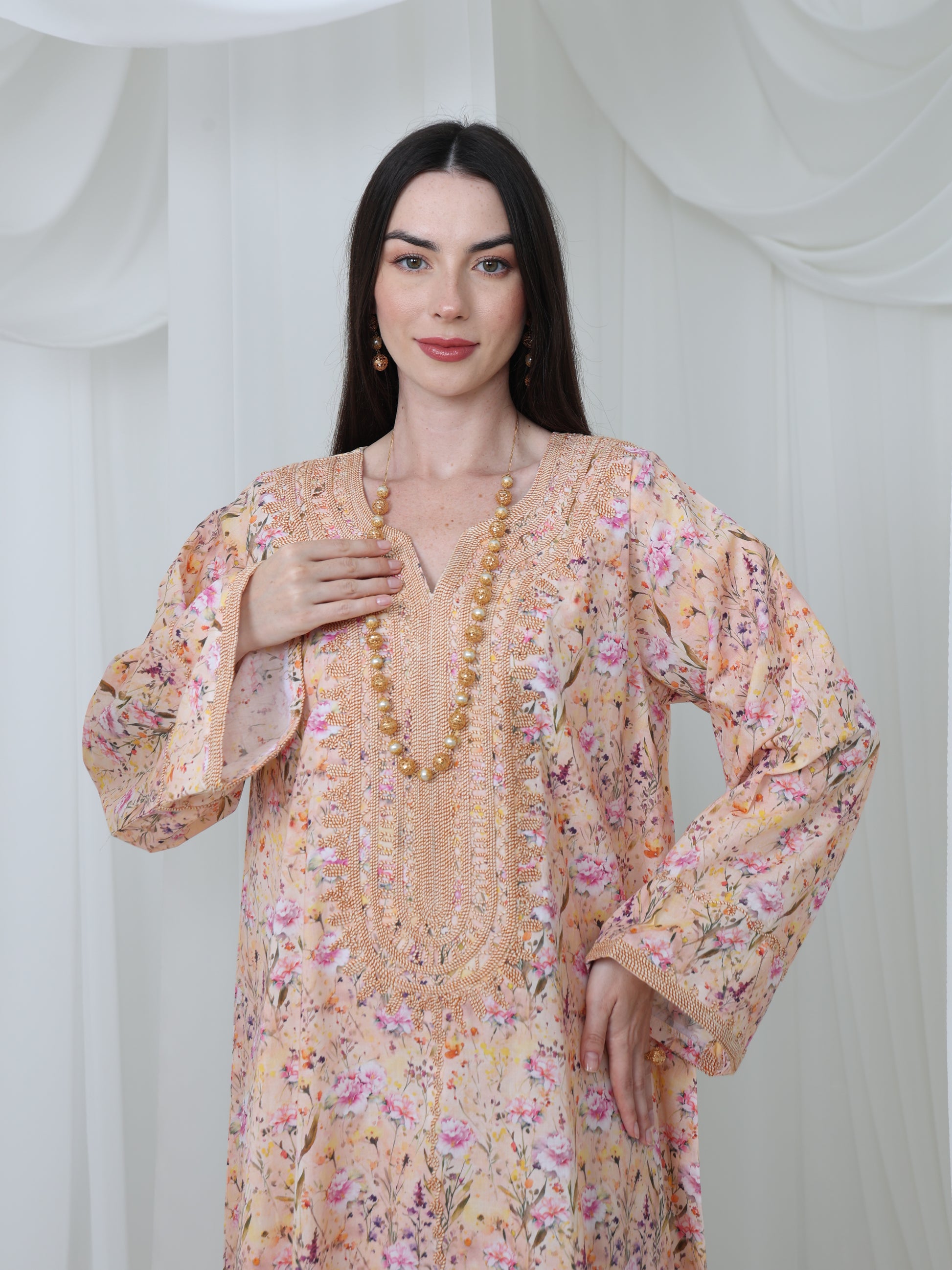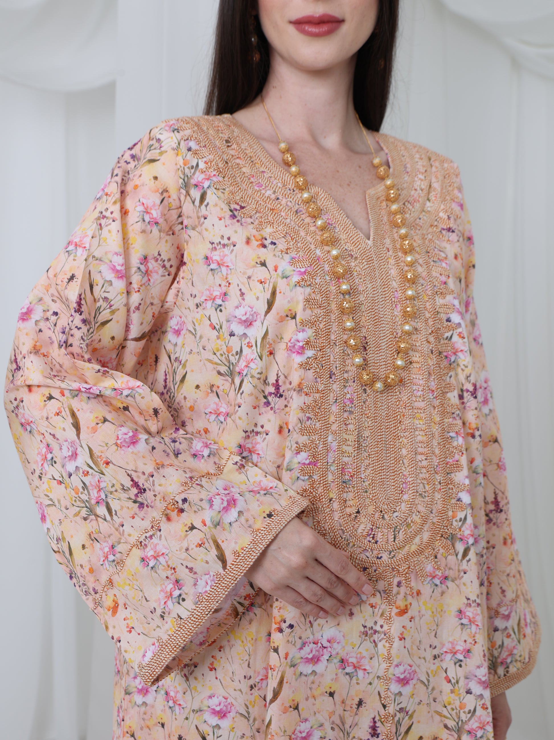 استمتعي بأناقة ساحرة مع قفطان "ميستي داون"، الذي يتميز بمزيج متناغم من درجات الباستيل الهادئة بنقش مستوحى من الألوان المائية. يُضفي التطريز الوردي المرجاني على خط العنق لمسةً مميزةً على خلفية ناعمة. تُضفي الأكمام الجرسية لمسةً من الإثارة والحركة على هذه القطعة الفنية، مثالية لافتتاح المعارض أو التجمعات الاجتماعية الراقية. الأقمشة خفيفة الوزن ومريحة، مثالية للحفاظ على انتعاشكِ في الطقس الحار. تتوفر القطع بتصميم واحد يناسب الجميع، بمقاس صدر 23 بوصة وطول 58 بوصة. كما نوفر تعديلات مجانية.