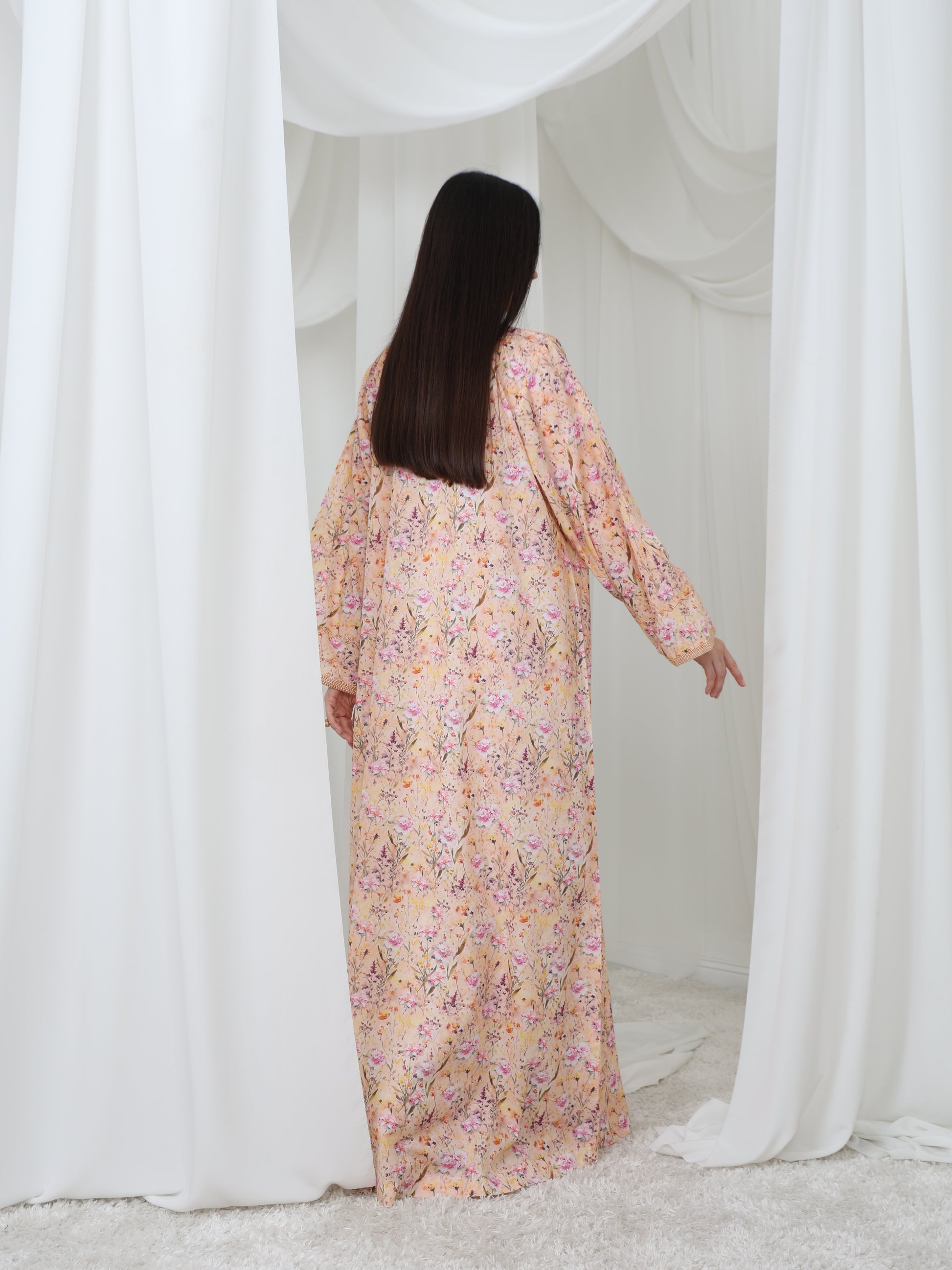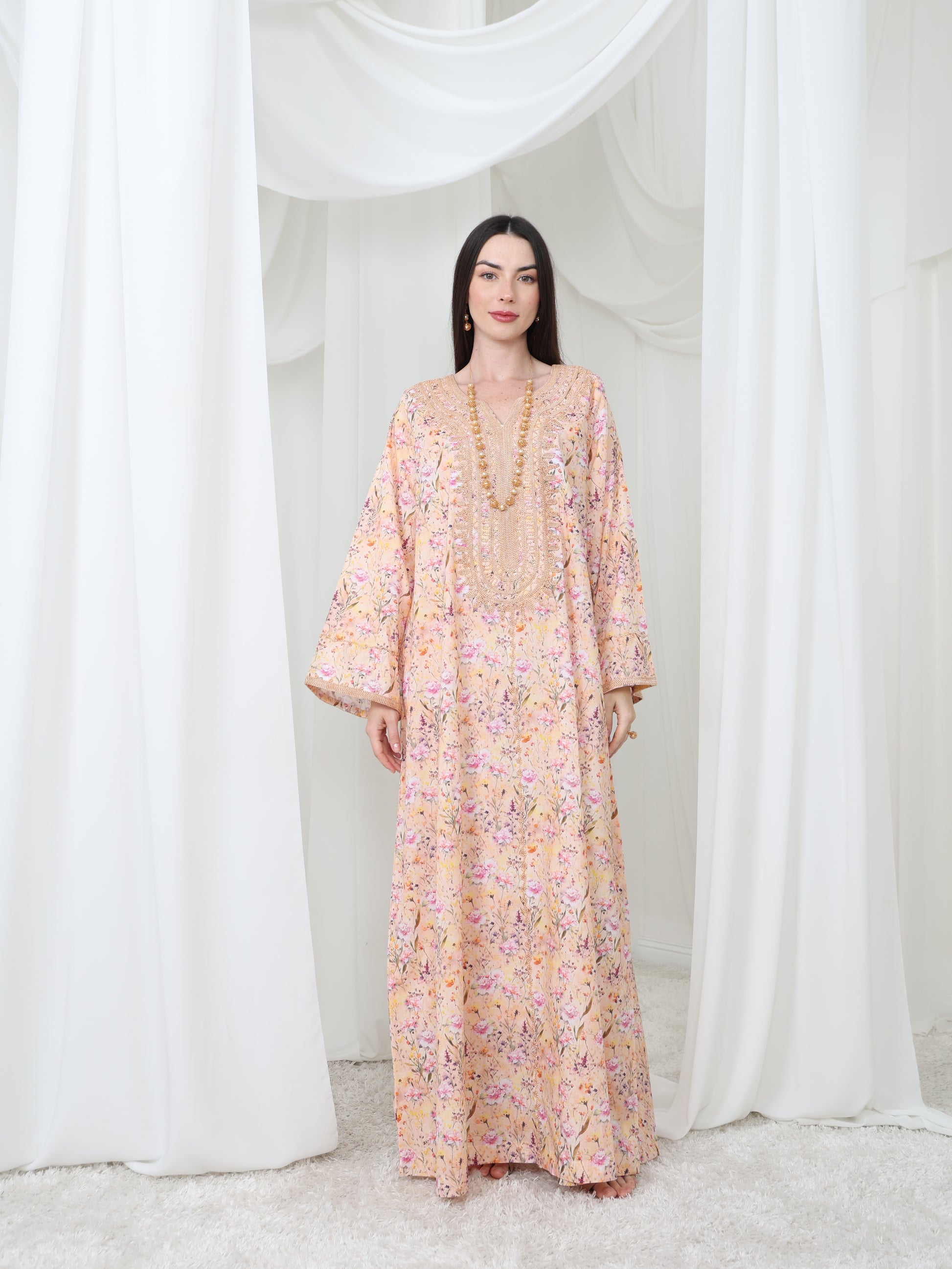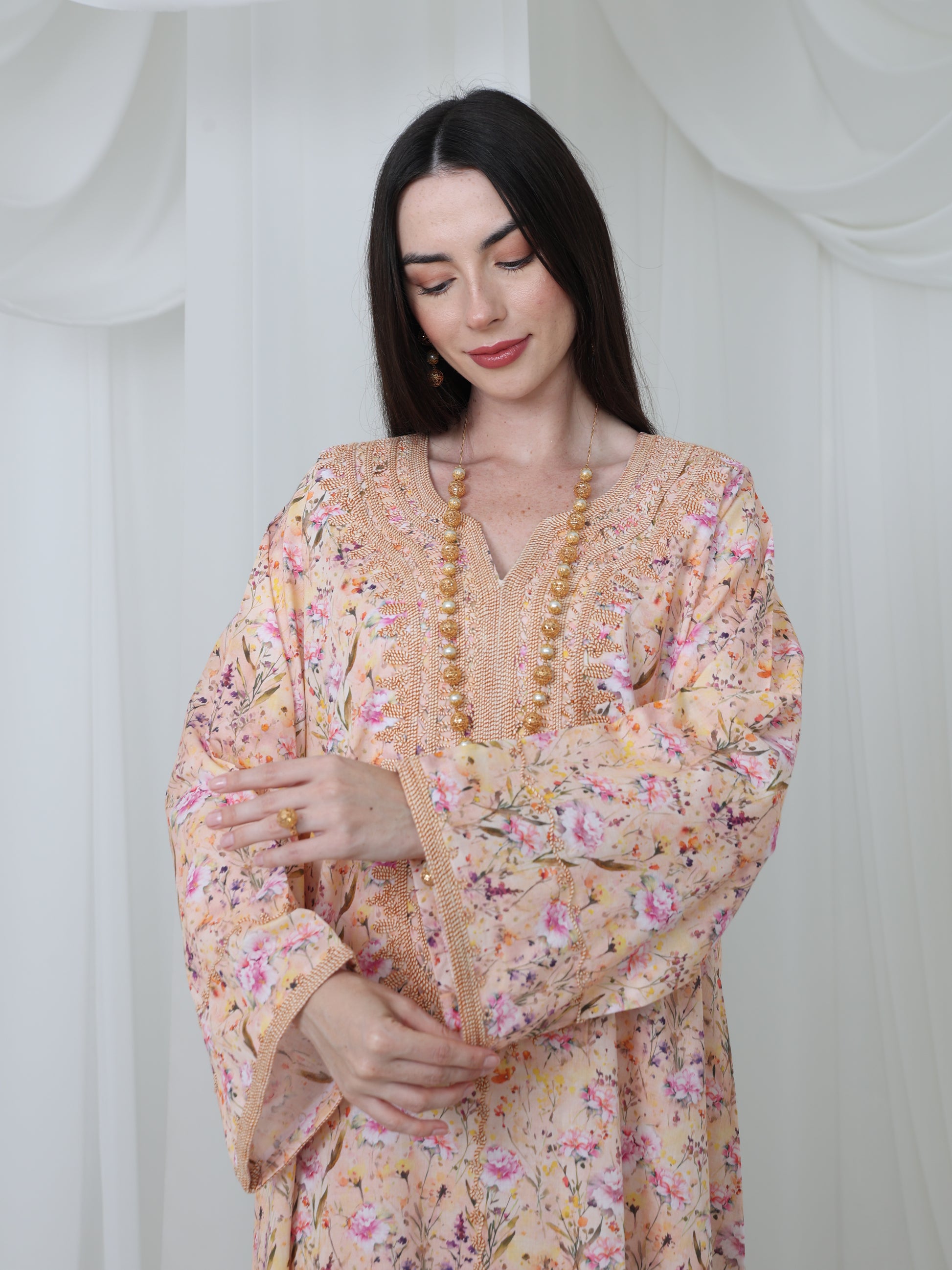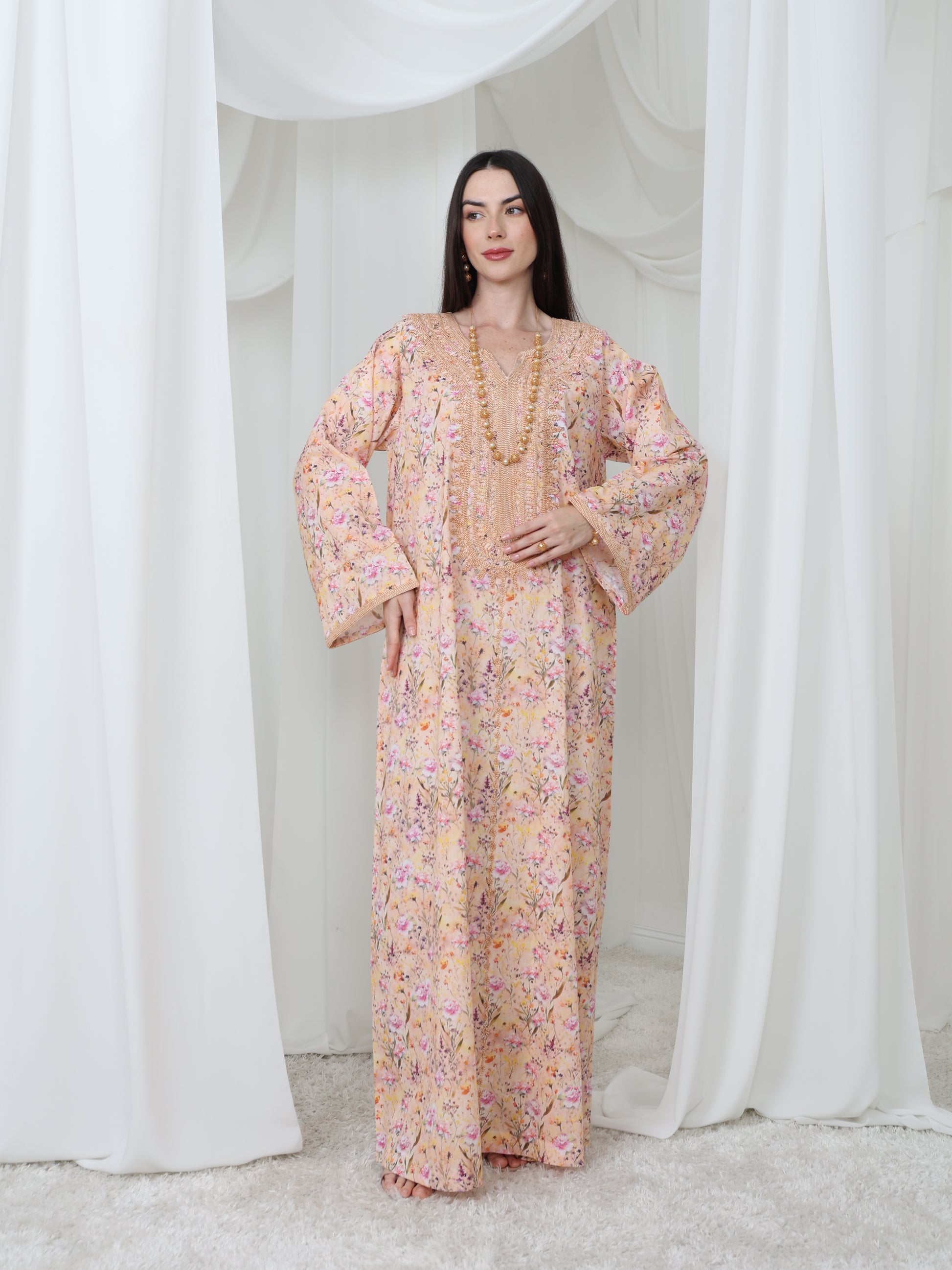 استمتعي بأناقة ساحرة مع قفطان "ميستي داون"، الذي يتميز بمزيج متناغم من درجات الباستيل الهادئة بنقش مستوحى من الألوان المائية. يُضفي التطريز الوردي المرجاني على خط العنق لمسةً مميزةً على خلفية ناعمة. تُضفي الأكمام الجرسية لمسةً من الإثارة والحركة على هذه القطعة الفنية، مثالية لافتتاح المعارض أو التجمعات الاجتماعية الراقية. الأقمشة خفيفة الوزن ومريحة، مثالية للحفاظ على انتعاشكِ في الطقس الحار. تتوفر القطع بتصميم واحد يناسب الجميع، بمقاس صدر 23 بوصة وطول 58 بوصة. كما نوفر تعديلات مجانية.