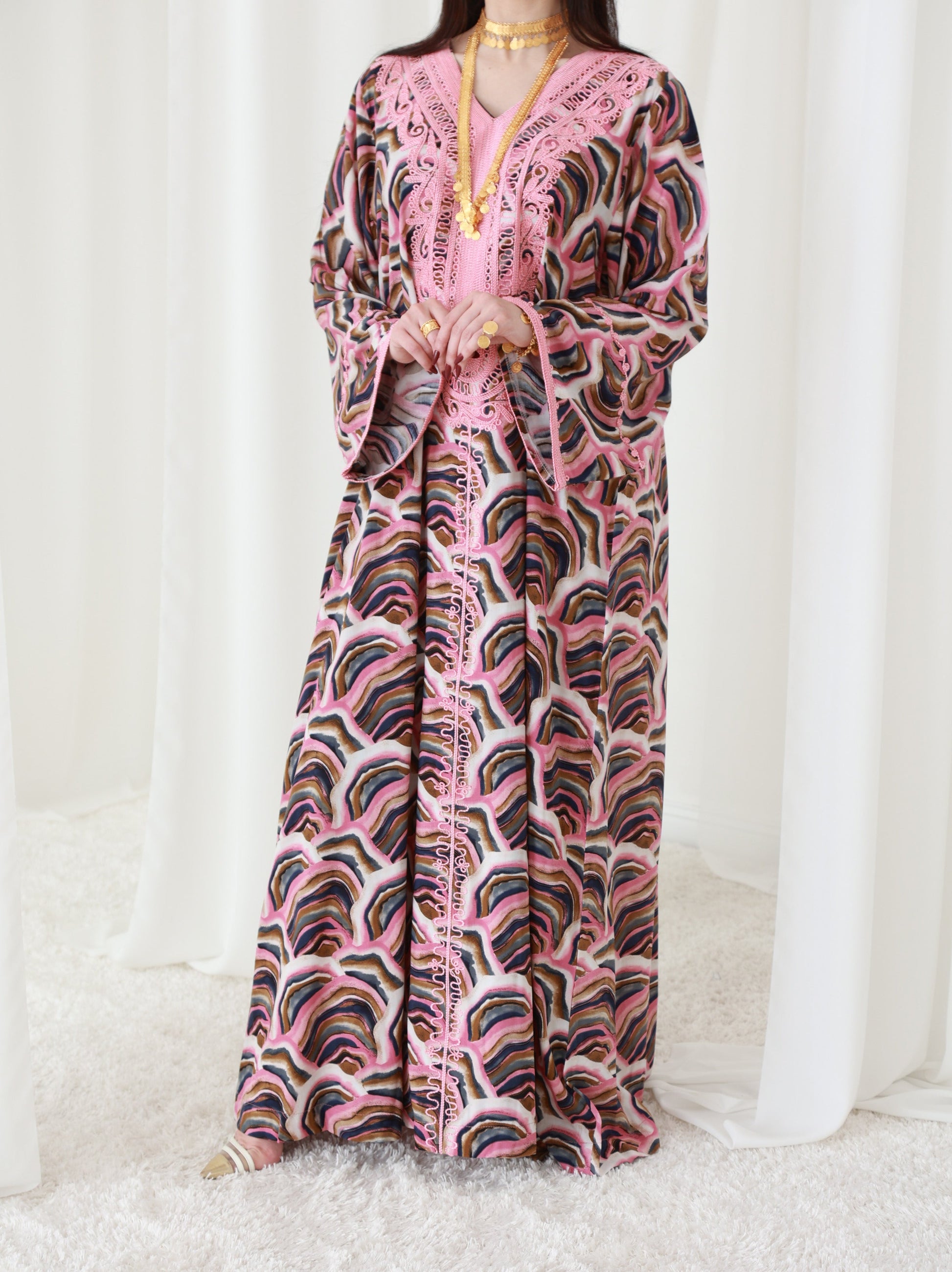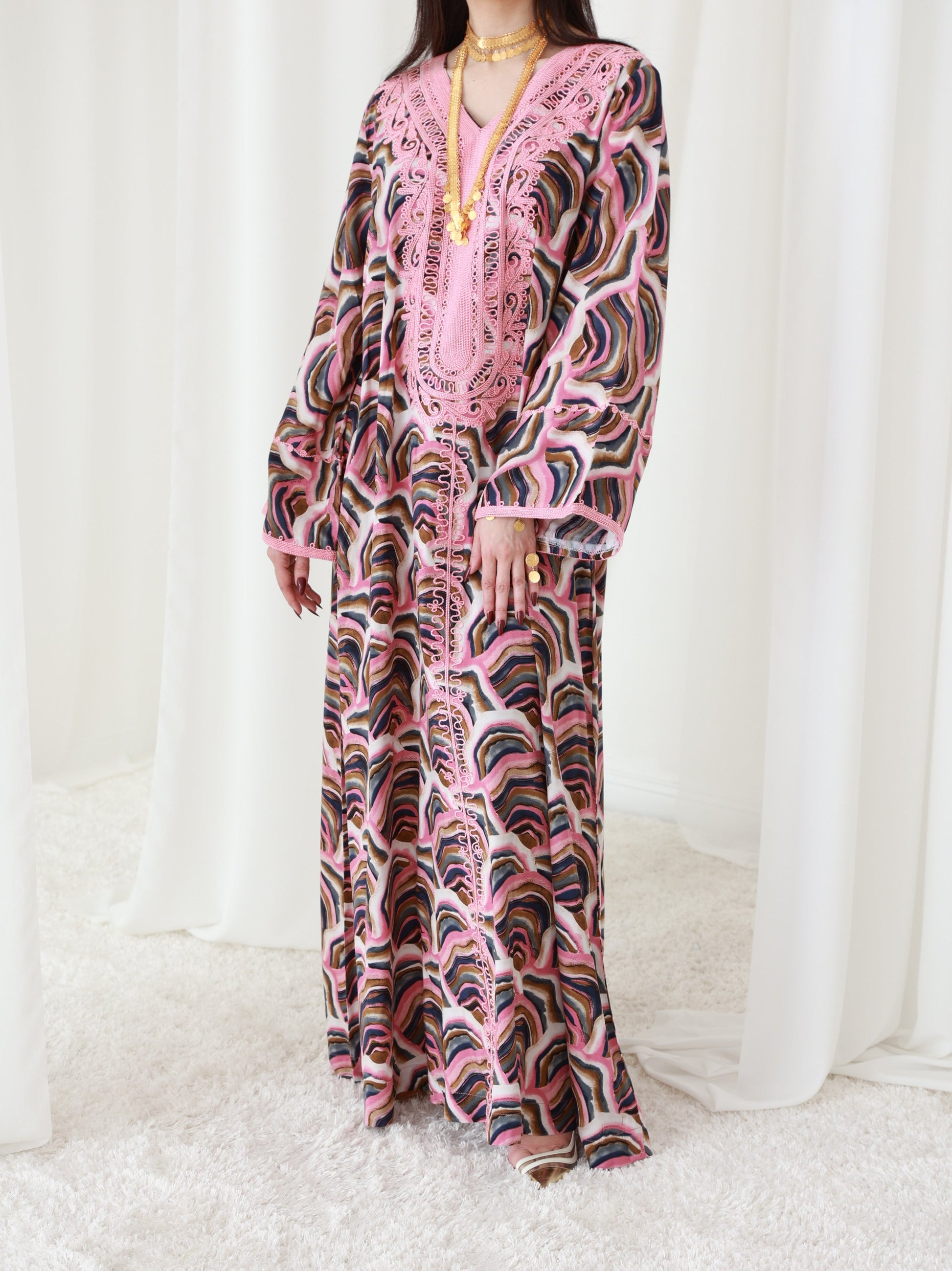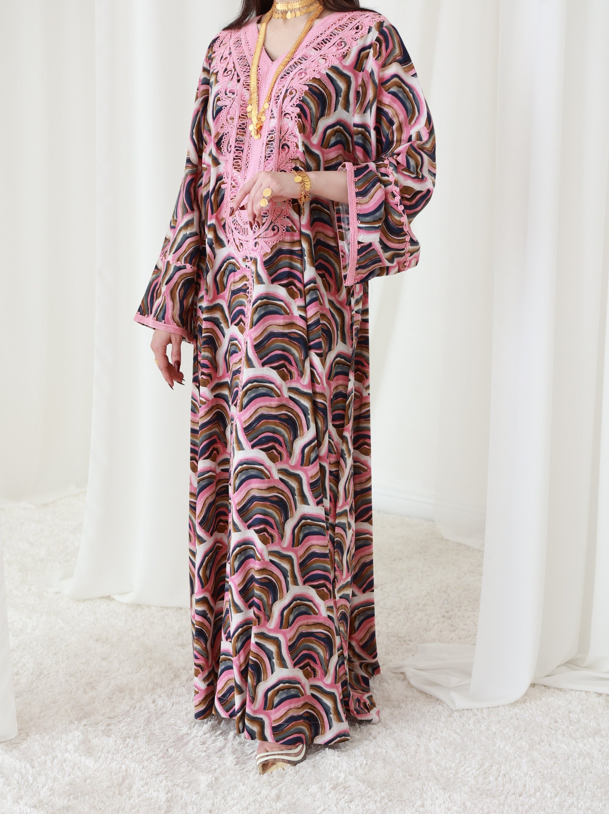 هذا الفستان المذهل، الذي يتميز بتطريز رائع على الياقة والأكمام، سيضفي لمسة من الأناقة على إطلالتك. مصنوع من قماش حريري يسمح بمرور الهواء ويوفر الراحة طوال اليوم والأناقة التي لا تتطلب مجهودًا. إنه مثالي للإطلالات الرسمية وغير الرسمية نظرًا للمسة الراقية التي يوفرها التطريز الجميل. يبلغ طول الفستان 58 بوصة وعرضه 23 بوصة عند الصدر، بتصميم بمقاس واحد يناسب الجميع. يتم تقديم تعديلات مجانية لضمان المقاس المثالي. القماش خفيف الوزن، مما يجعله مثاليًا للبقاء منتعشًا في الطقس الحار. تجتمع جاذبيته الكلاسيكية وراحته في قطعة واحدة متعددة الأغراض.