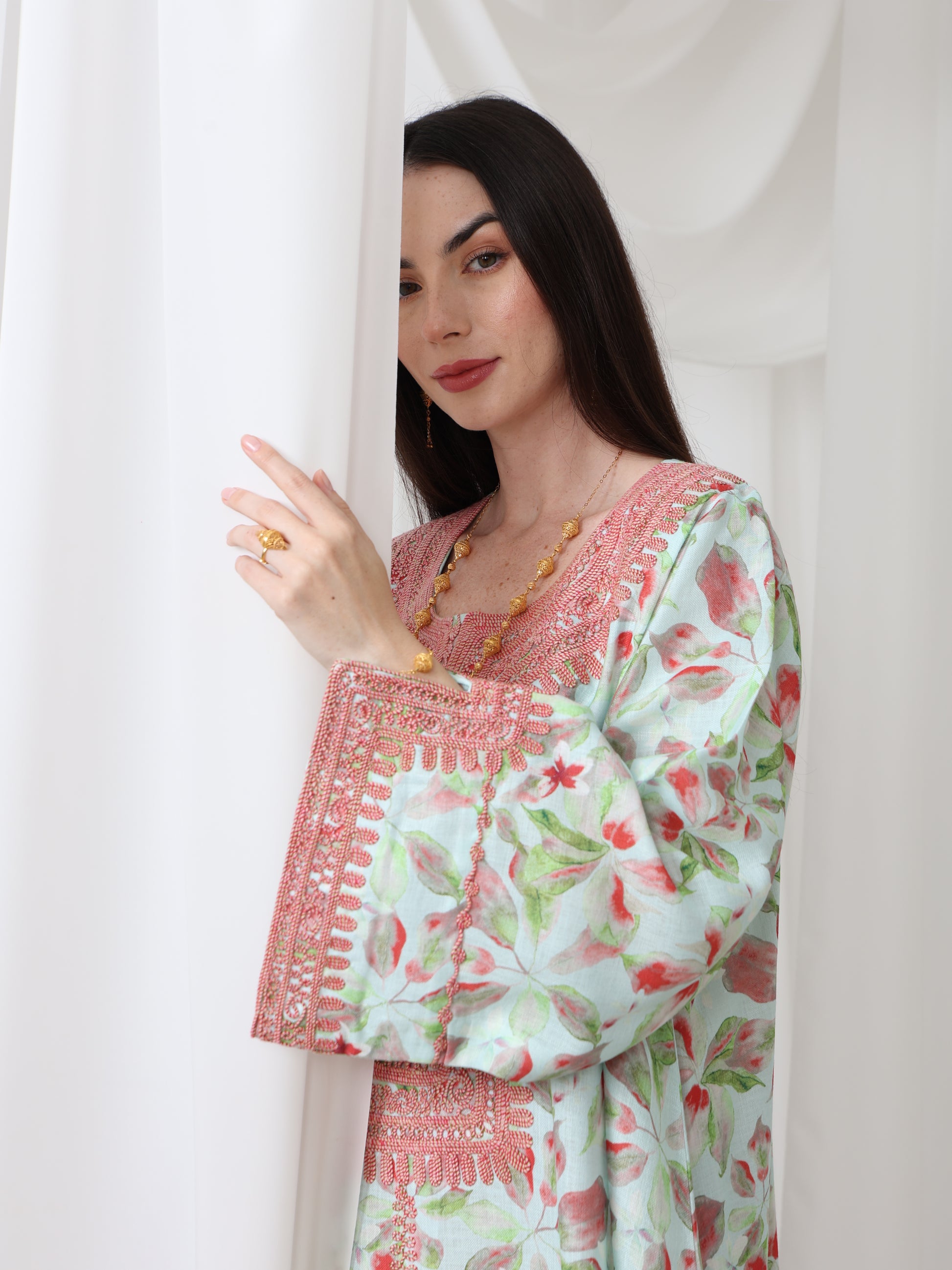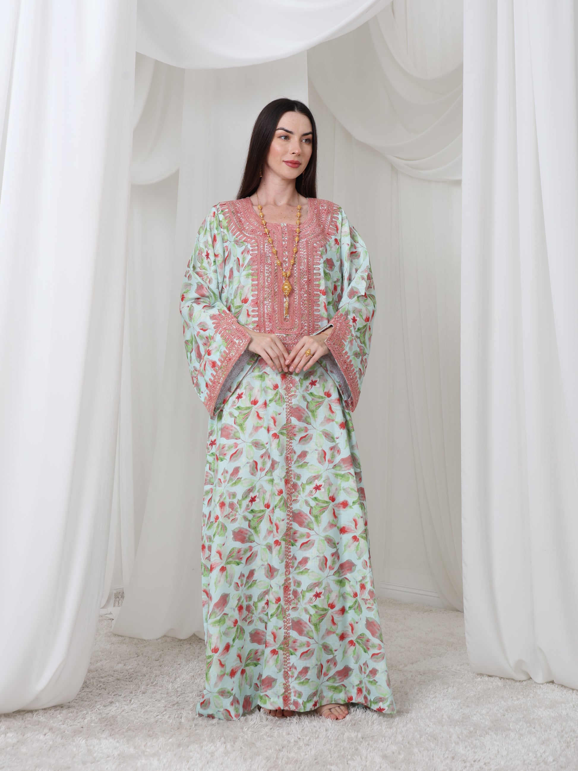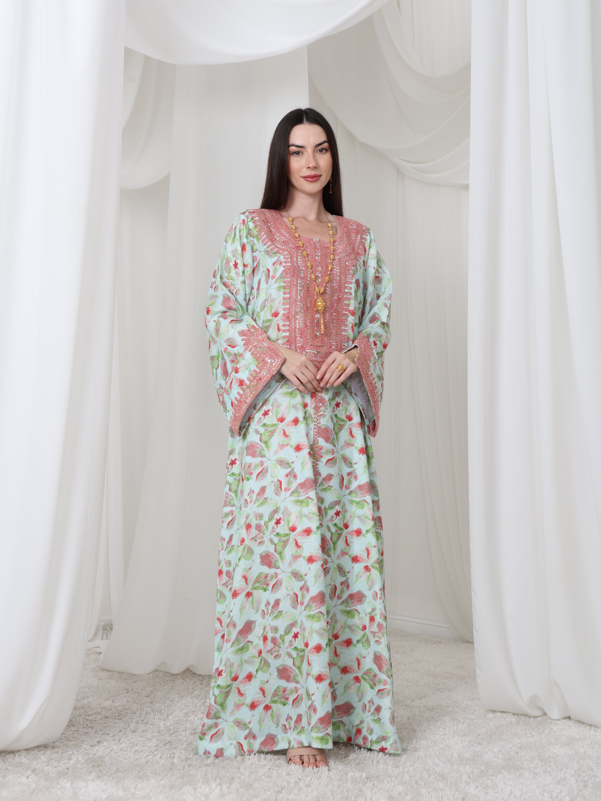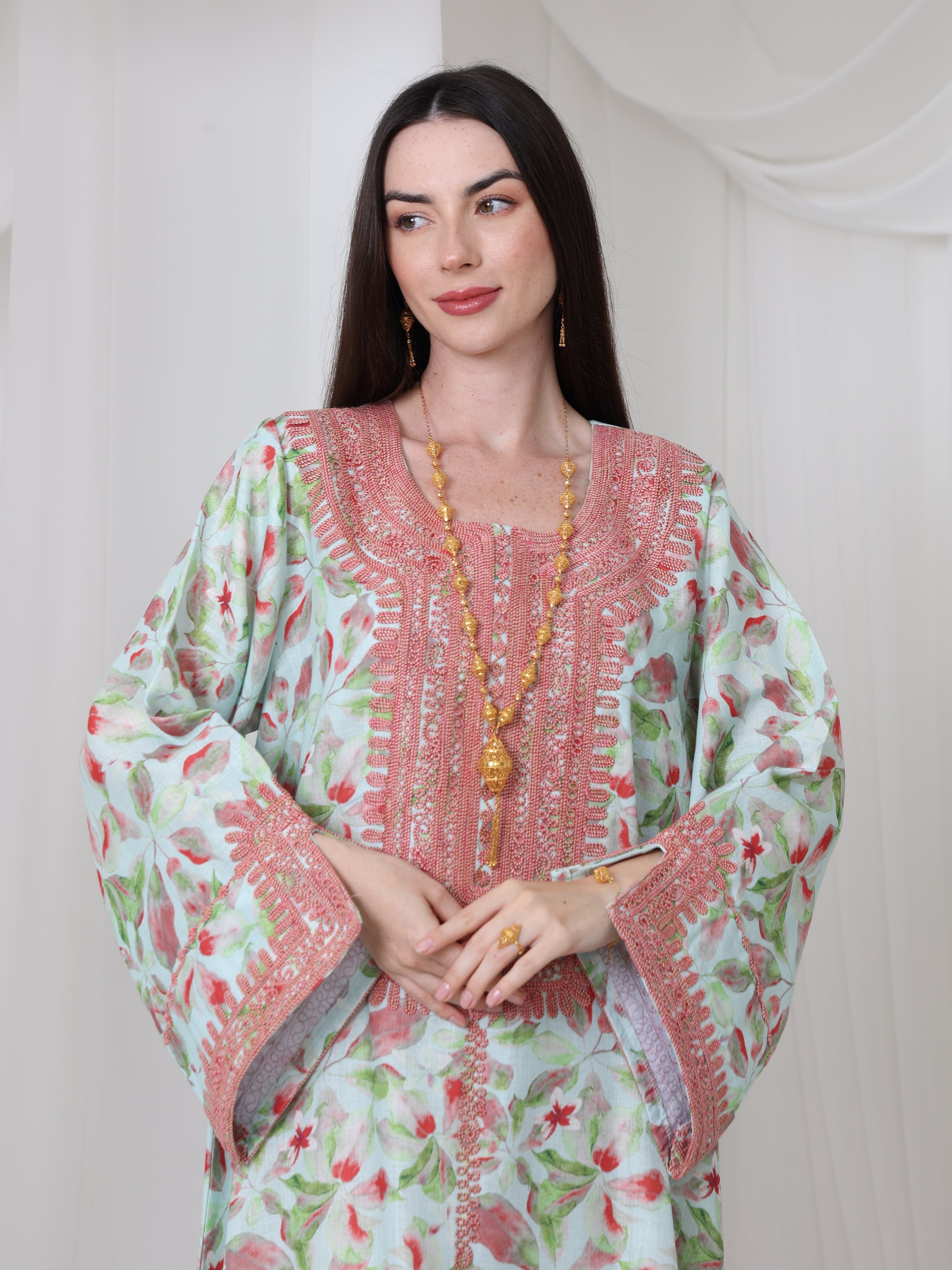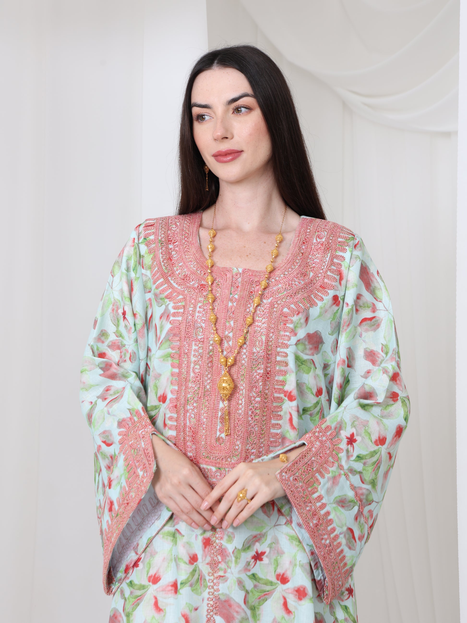 قفطان بتلات الورد يُجسّد أنوثةً فاتنةً بنقشه الزهري الرقيق بدرجات اللون الوردي الهادئة. يتميز بفتحة رقبة على شكل حرف V بتطريز ورديّ متقن يُحيط بوجهكِ بشكلٍ جميل، بينما تُضفي قلادة مُكمّلة لمسةً بوهيمية. يُضفي التصميم الانسيابي والأكمام الواسعة لمسةً من الأناقة الرومانسية، مثالية لحفلات الزفاف في الحديقة أو جلسات شاي ما بعد الظهيرة. الأقمشة خفيفة الوزن ومريحة، مثالية للحفاظ على انتعاشكِ في الطقس الحار. تتوفر القطع بتصميم واحد يناسب الجميع، بمقاس صدر 23 بوصة وطول 58 بوصة. كما نُقدّم خدمة تعديل مجانية.