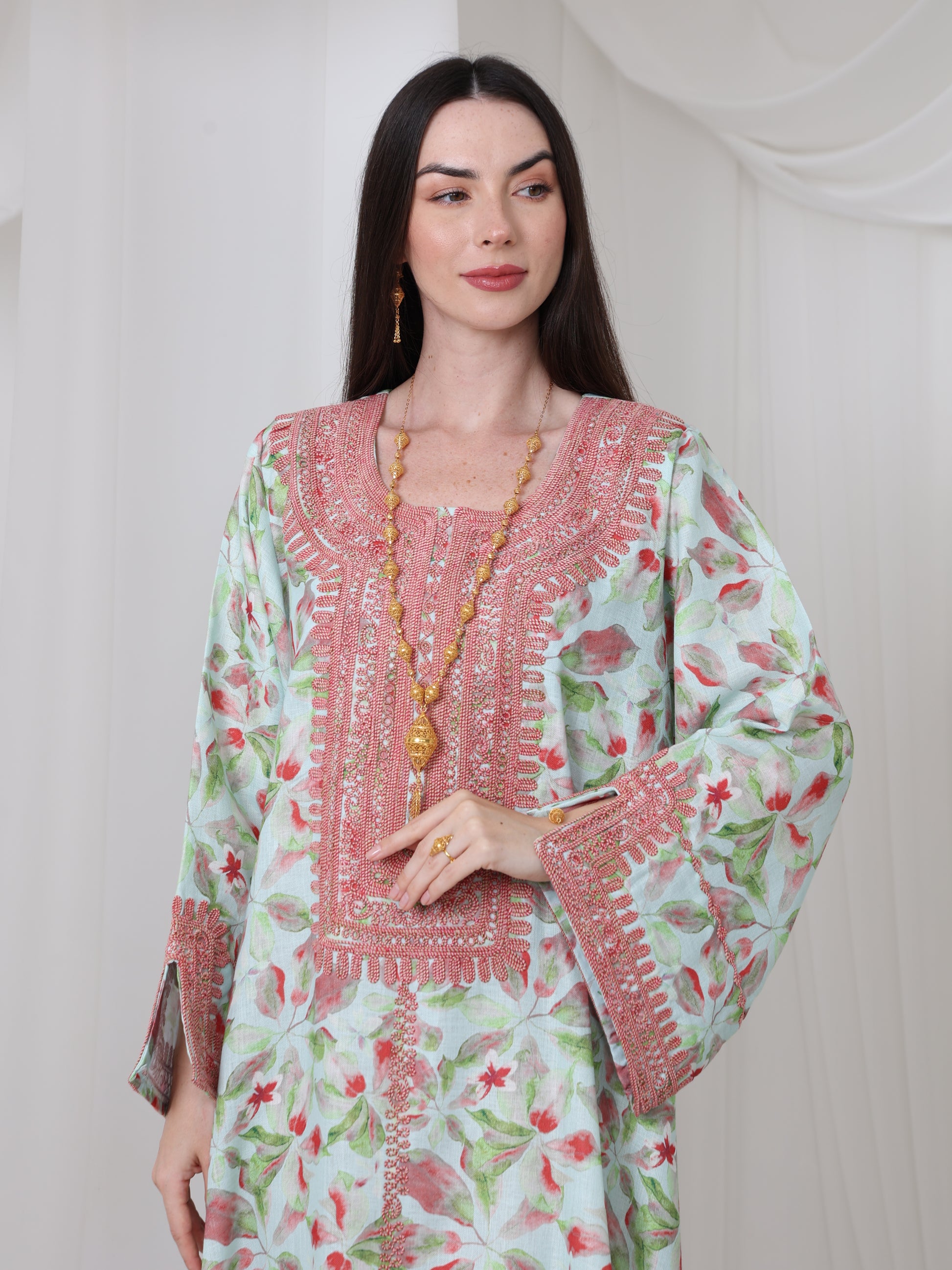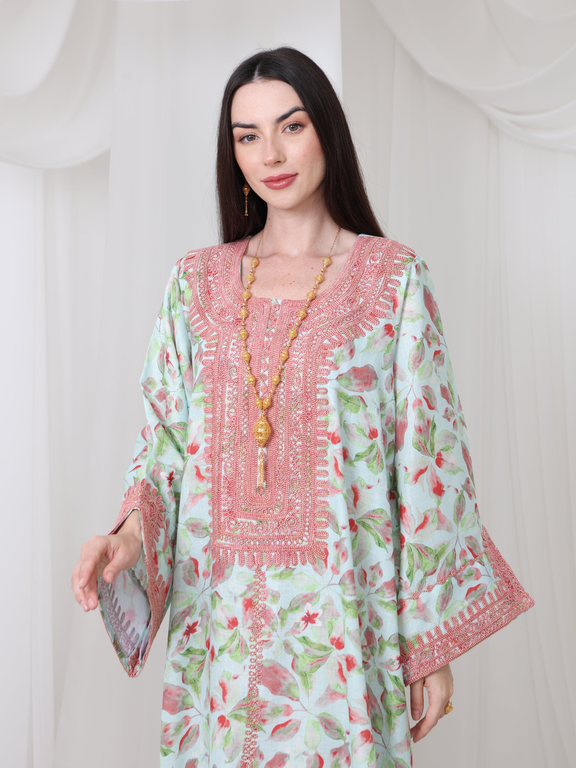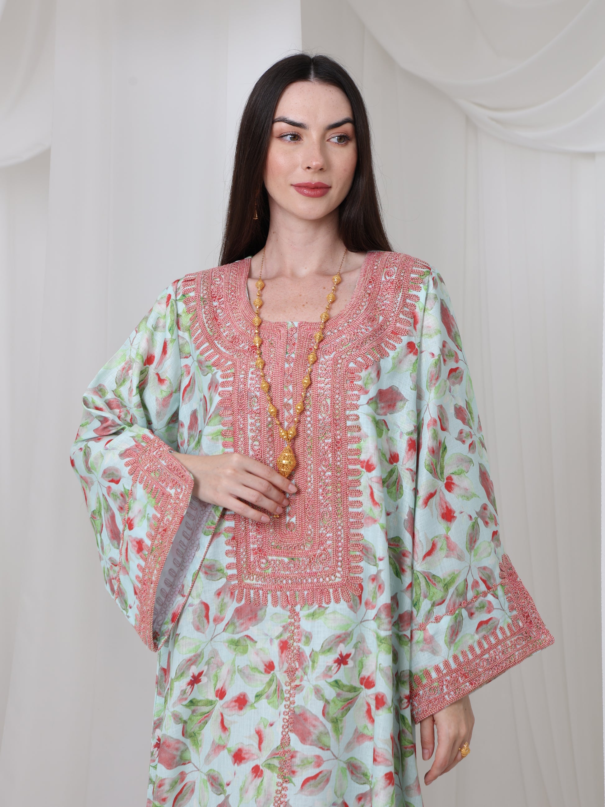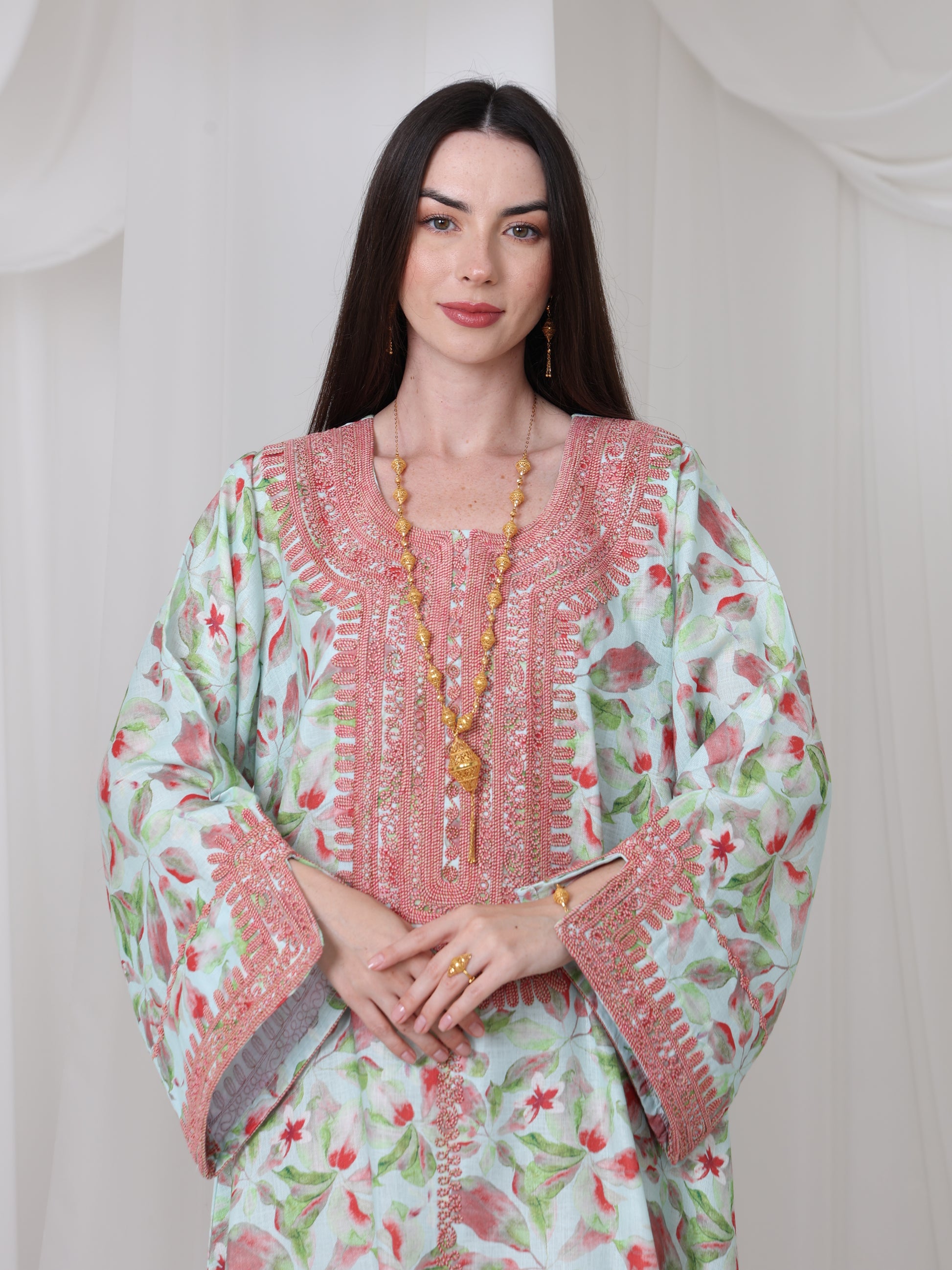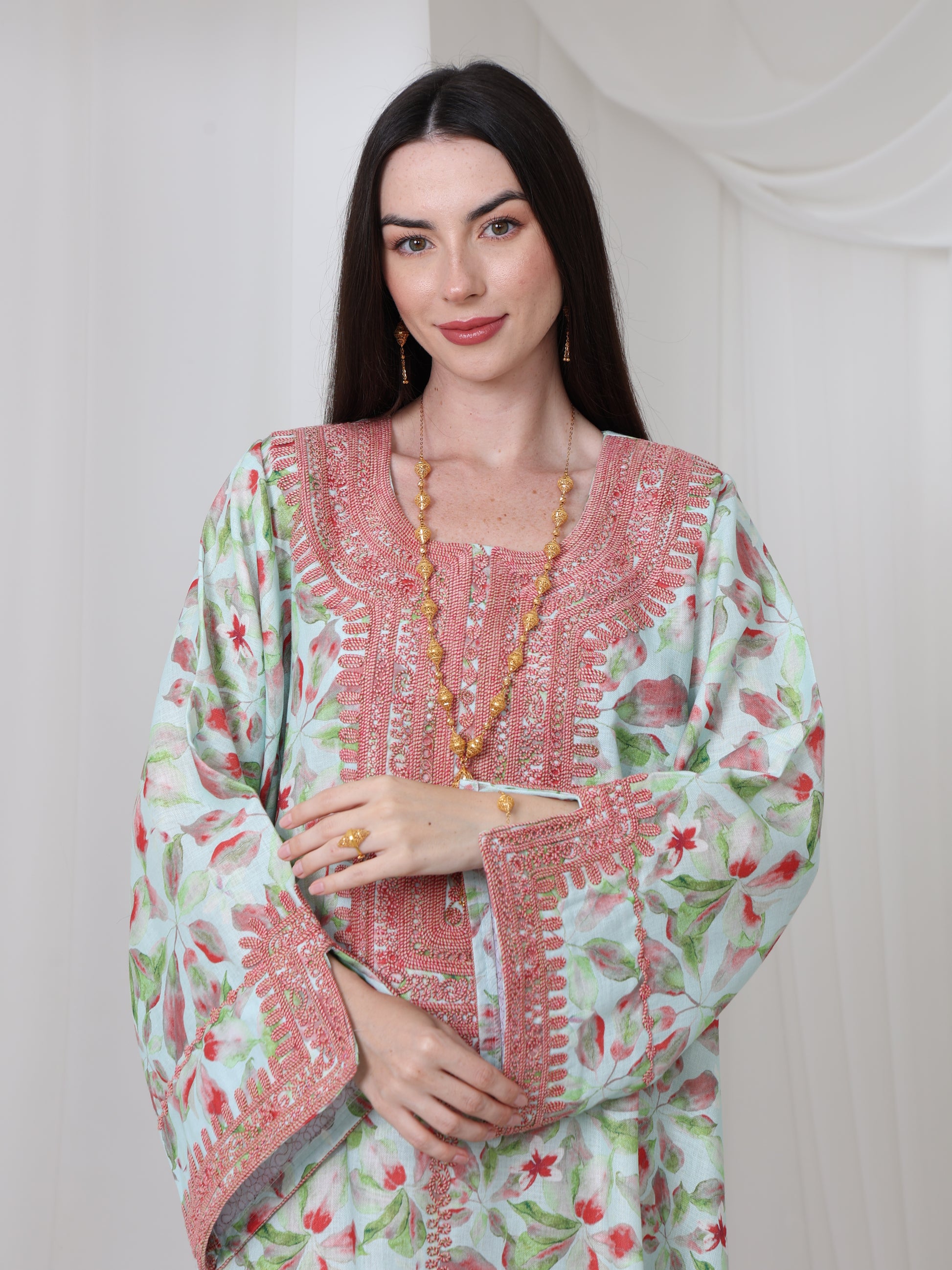 قفطان بتلات الورد يُجسّد أنوثةً فاتنةً بنقشه الزهري الرقيق بدرجات اللون الوردي الهادئة. يتميز بفتحة رقبة على شكل حرف V بتطريز ورديّ متقن يُحيط بوجهكِ بشكلٍ جميل، بينما تُضفي قلادة مُكمّلة لمسةً بوهيمية. يُضفي التصميم الانسيابي والأكمام الواسعة لمسةً من الأناقة الرومانسية، مثالية لحفلات الزفاف في الحديقة أو جلسات شاي ما بعد الظهيرة. الأقمشة خفيفة الوزن ومريحة، مثالية للحفاظ على انتعاشكِ في الطقس الحار. تتوفر القطع بتصميم واحد يناسب الجميع، بمقاس صدر 23 بوصة وطول 58 بوصة. كما نُقدّم خدمة تعديل مجانية.