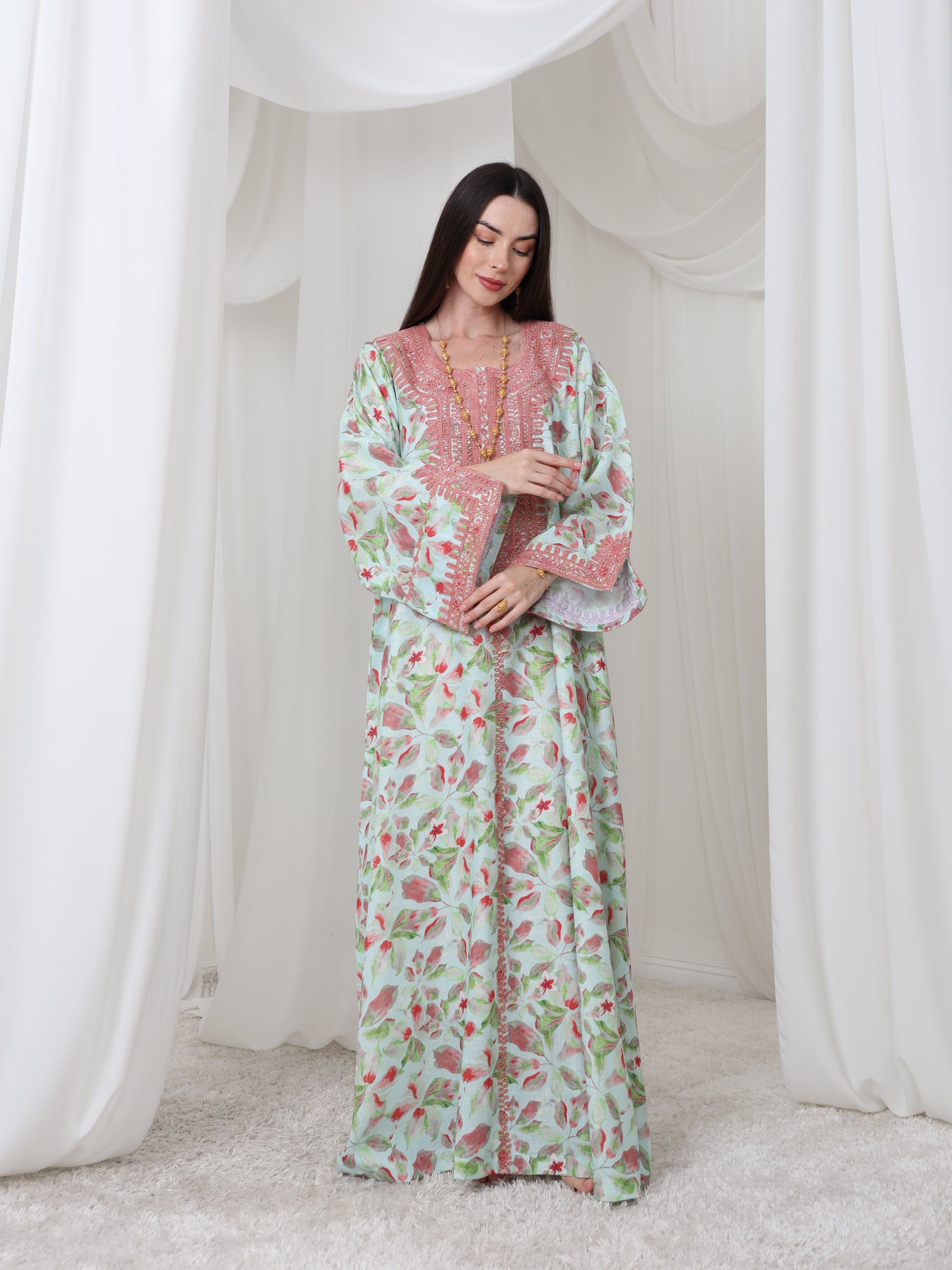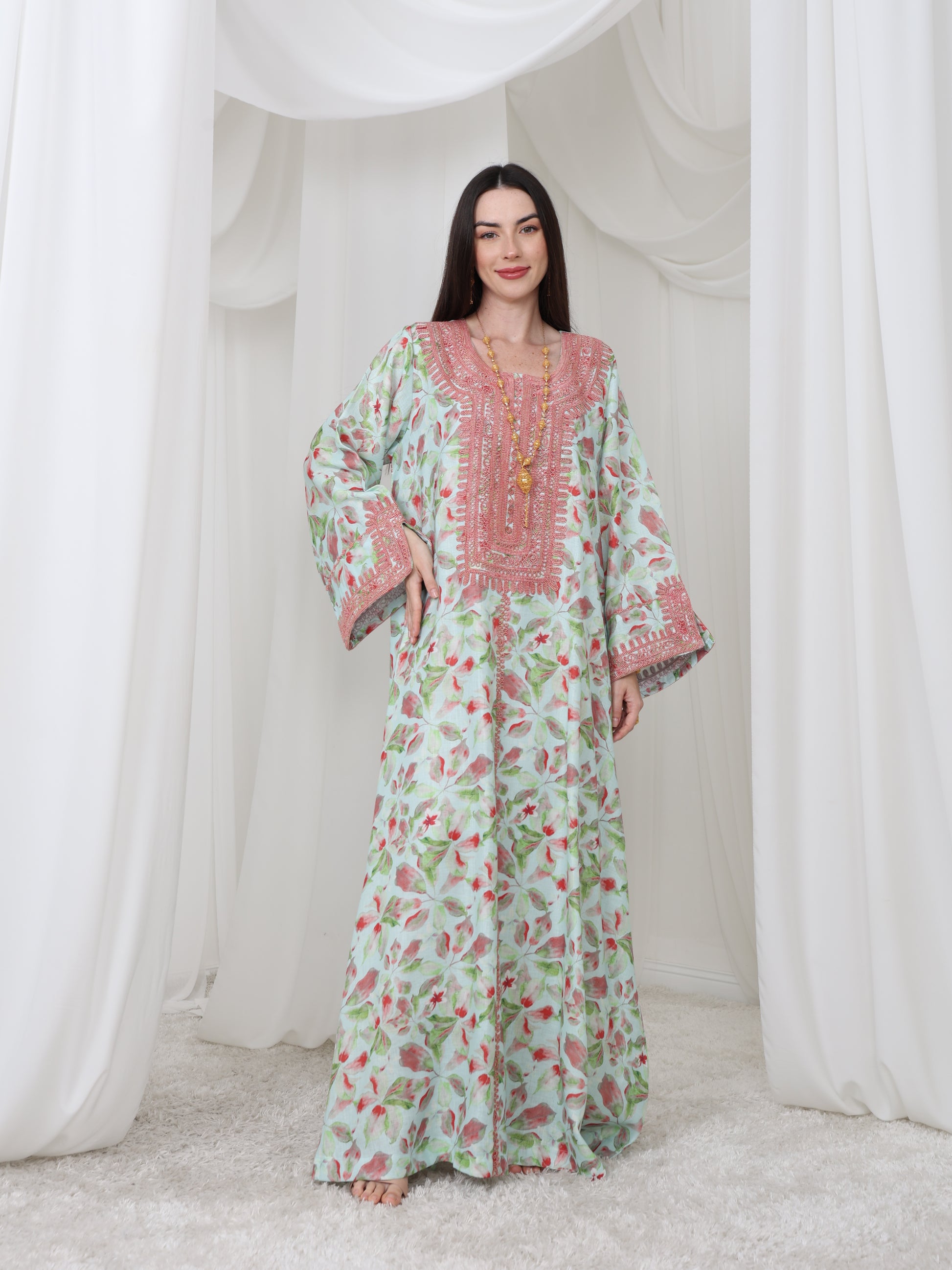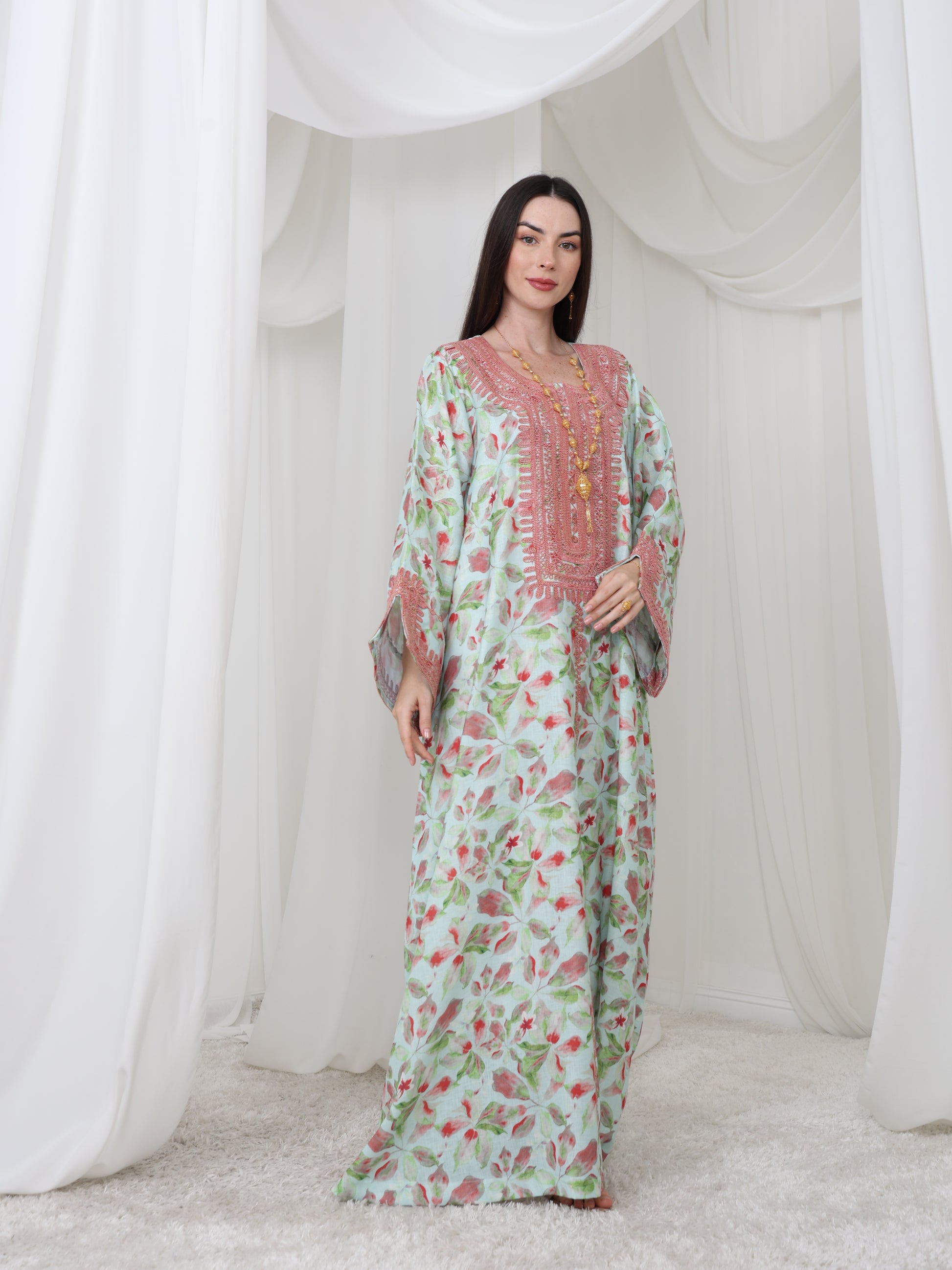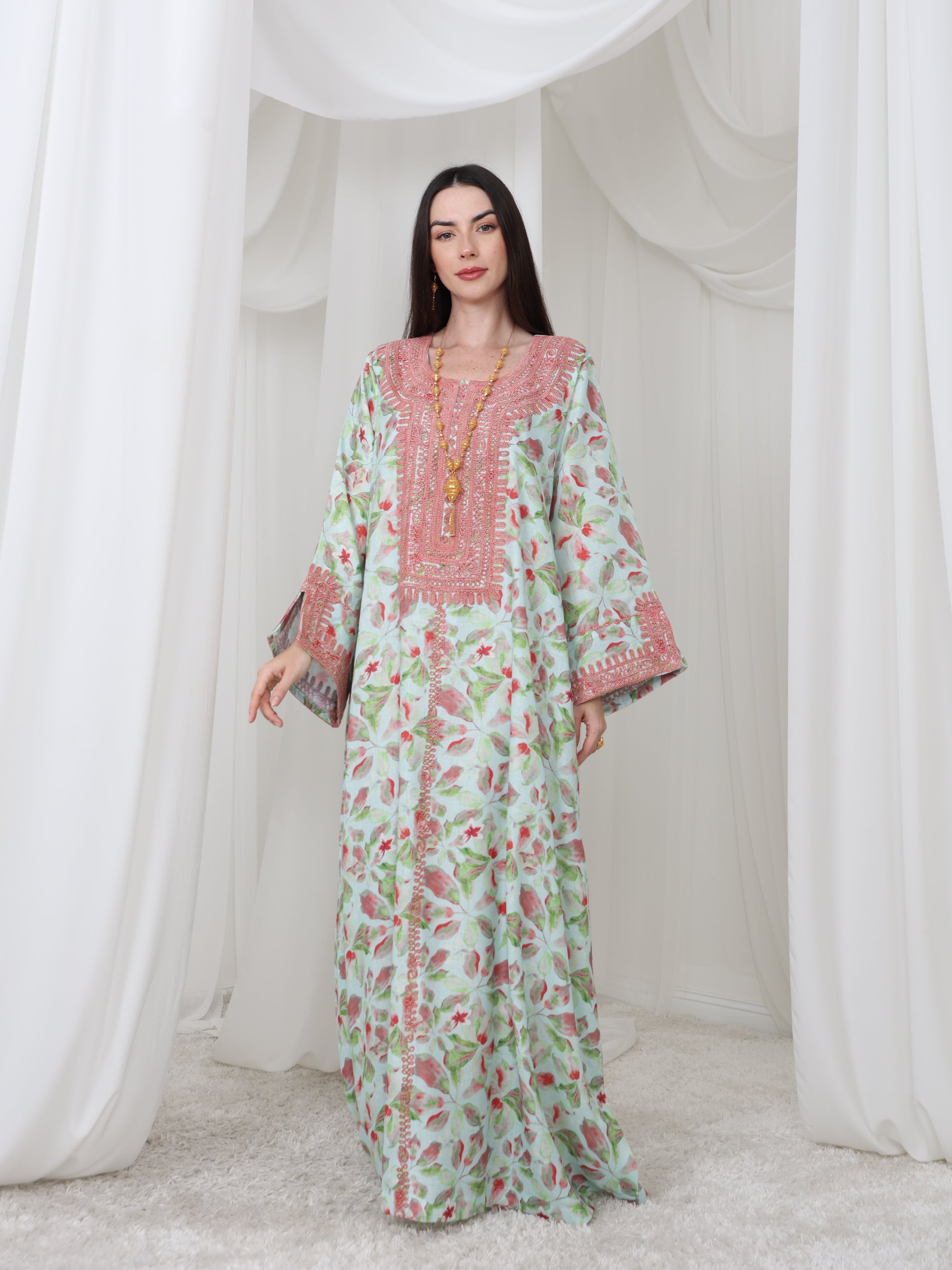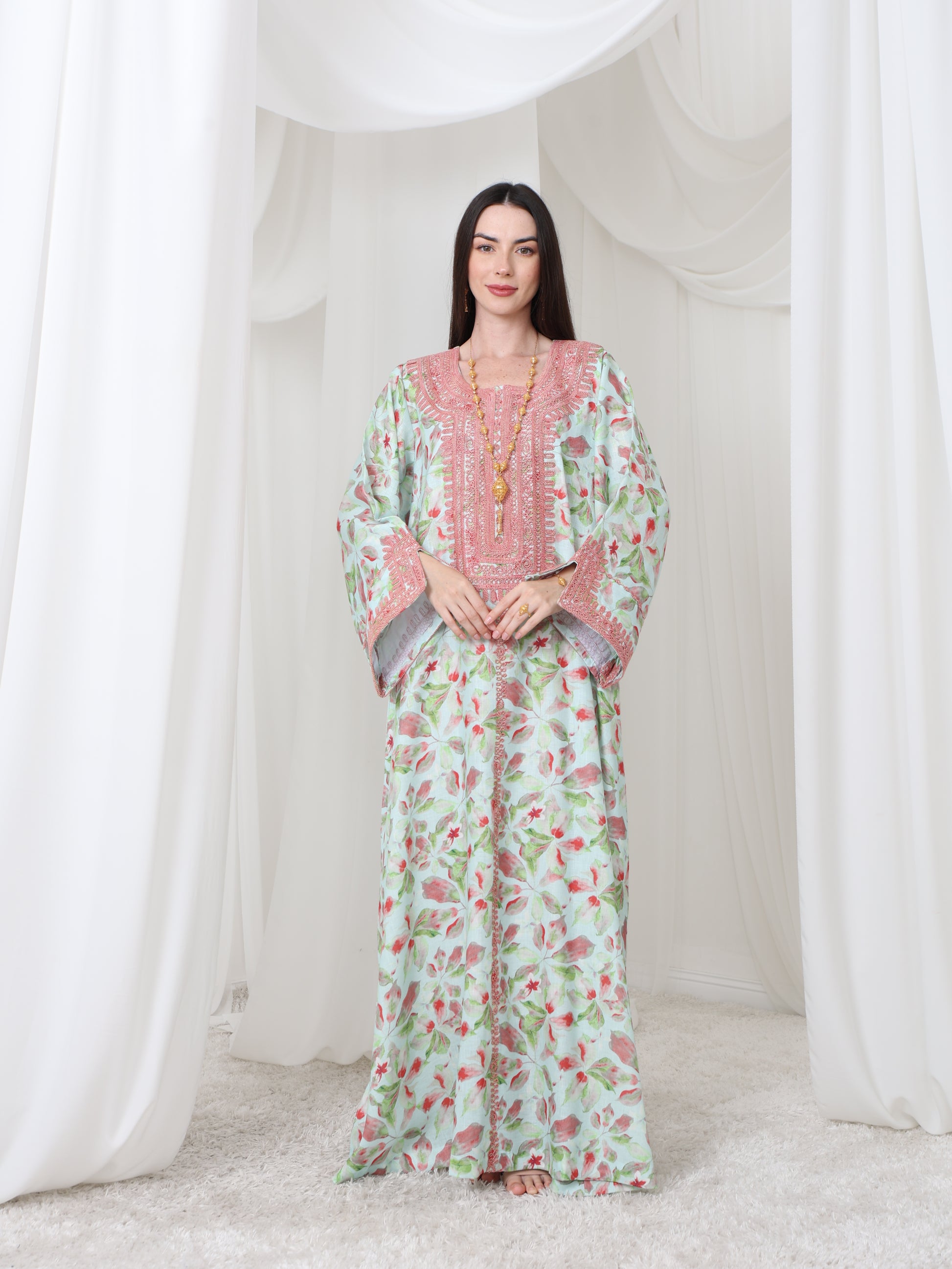 قفطان بتلات الورد يُجسّد أنوثةً فاتنةً بنقشه الزهري الرقيق بدرجات اللون الوردي الهادئة. يتميز بفتحة رقبة على شكل حرف V بتطريز ورديّ متقن يُحيط بوجهكِ بشكلٍ جميل، بينما تُضفي قلادة مُكمّلة لمسةً بوهيمية. يُضفي التصميم الانسيابي والأكمام الواسعة لمسةً من الأناقة الرومانسية، مثالية لحفلات الزفاف في الحديقة أو جلسات شاي ما بعد الظهيرة. الأقمشة خفيفة الوزن ومريحة، مثالية للحفاظ على انتعاشكِ في الطقس الحار. تتوفر القطع بتصميم واحد يناسب الجميع، بمقاس صدر 23 بوصة وطول 58 بوصة. كما نُقدّم خدمة تعديل مجانية.