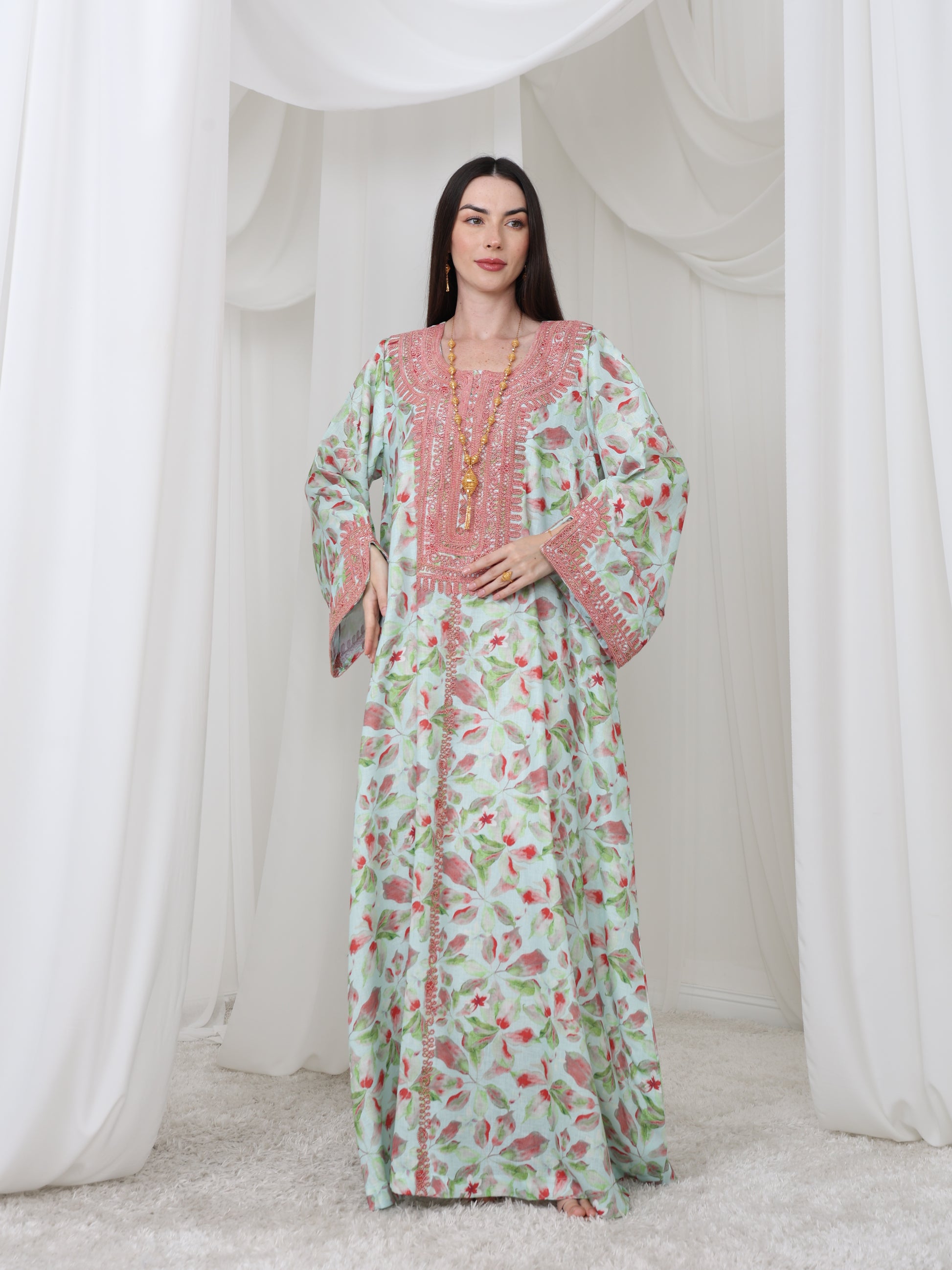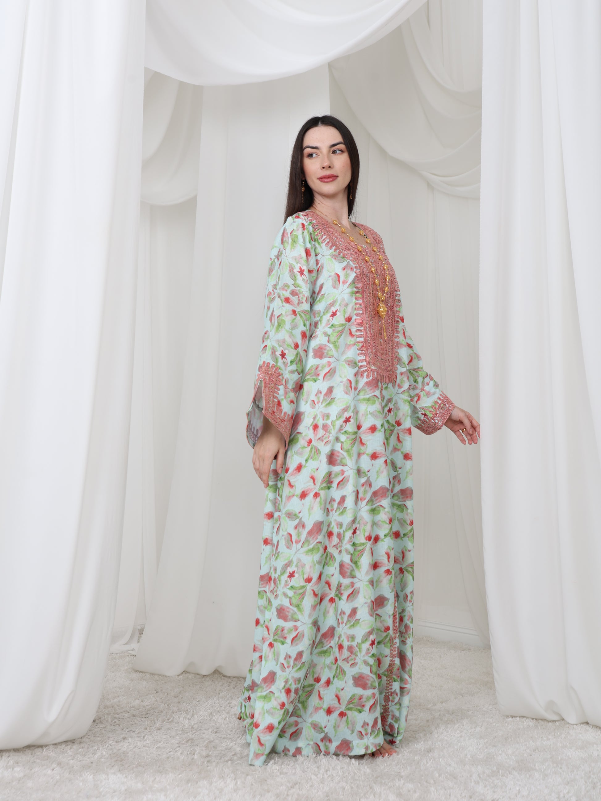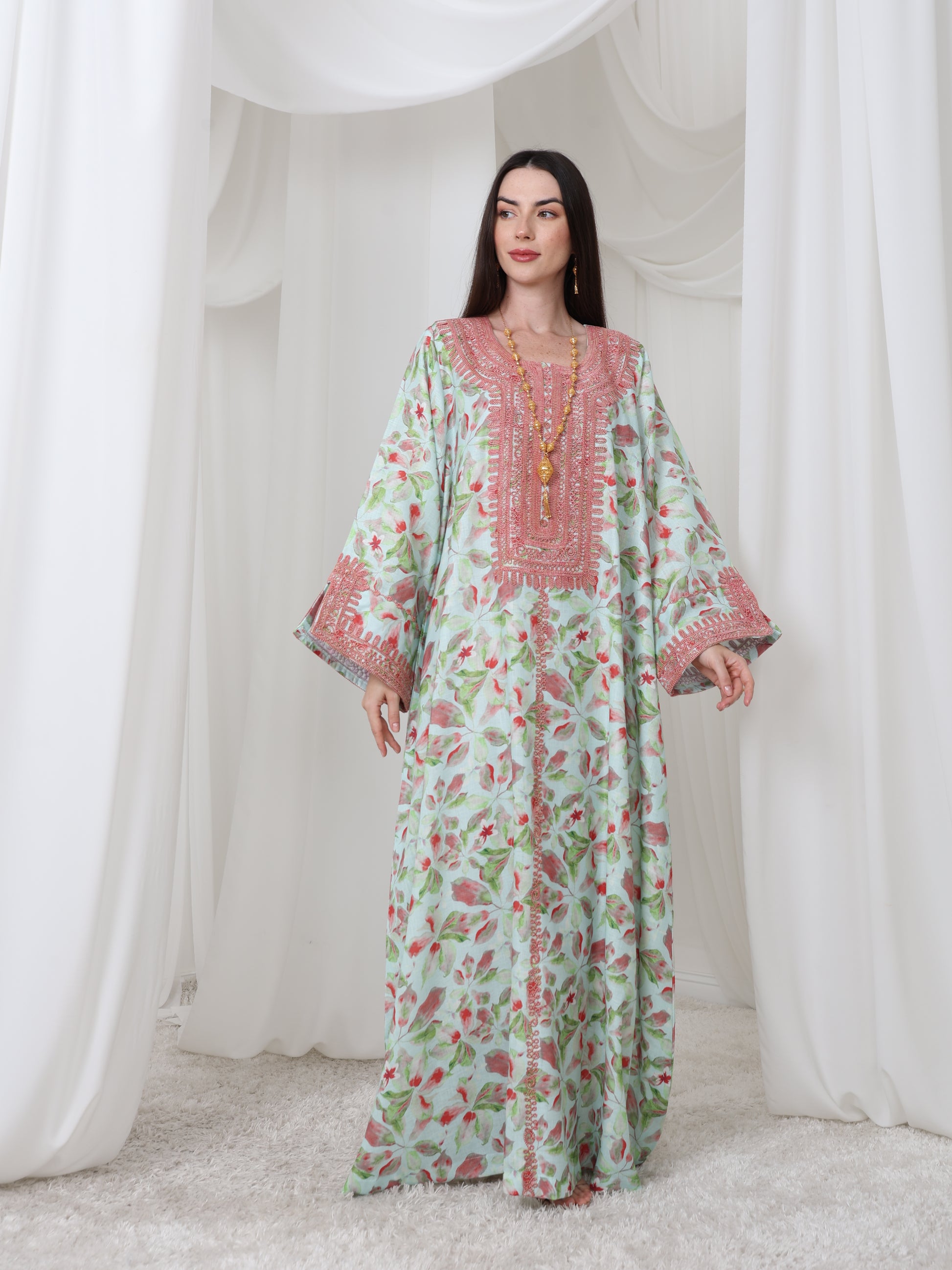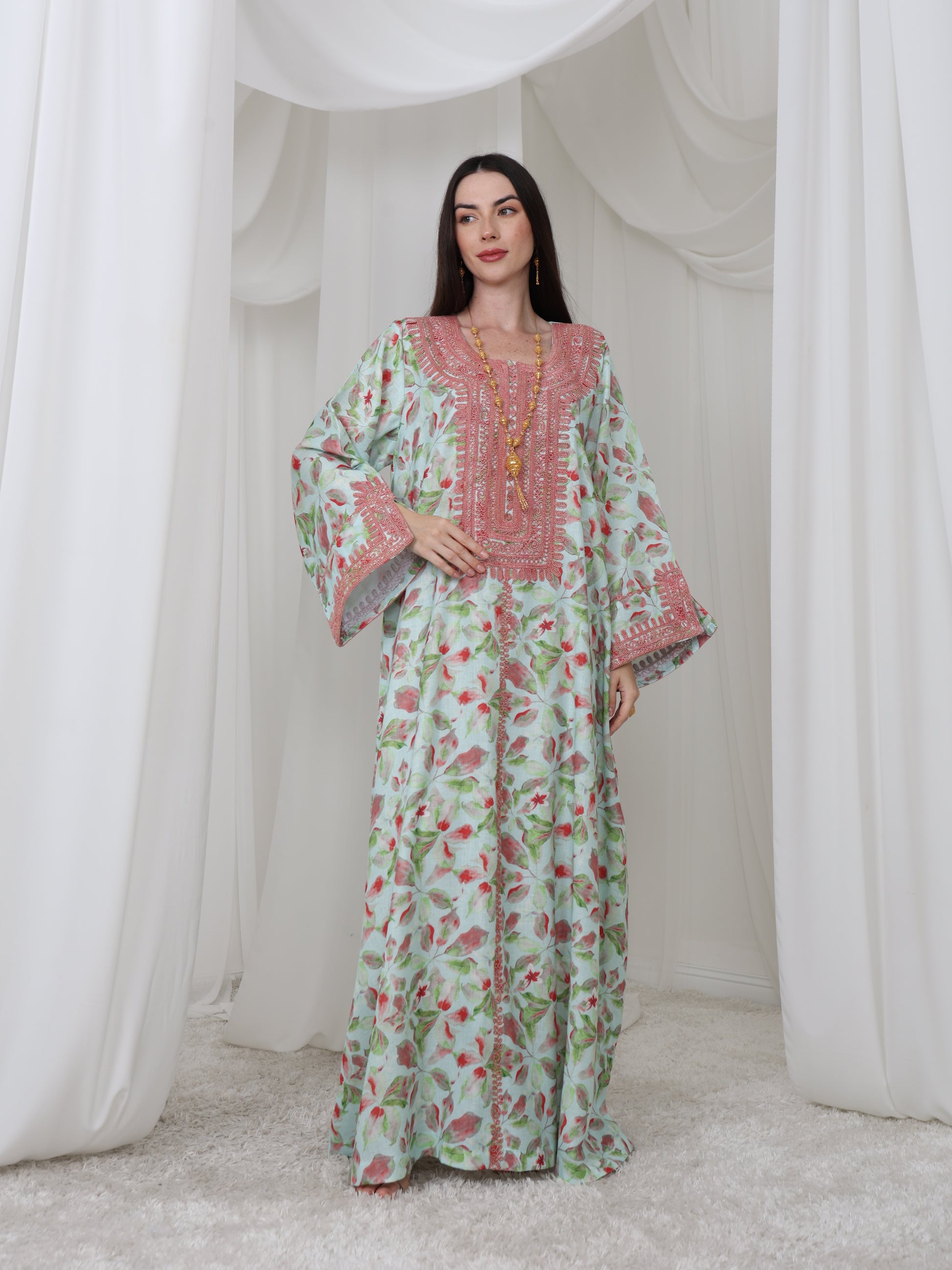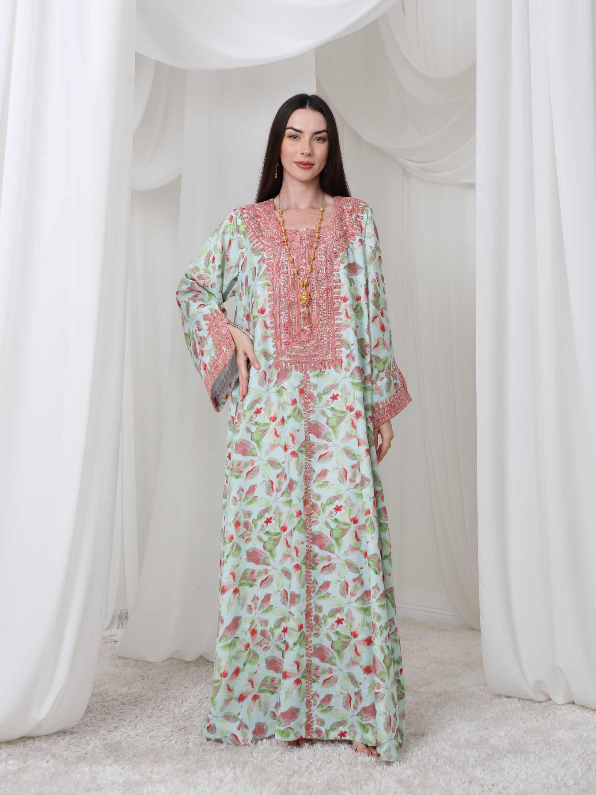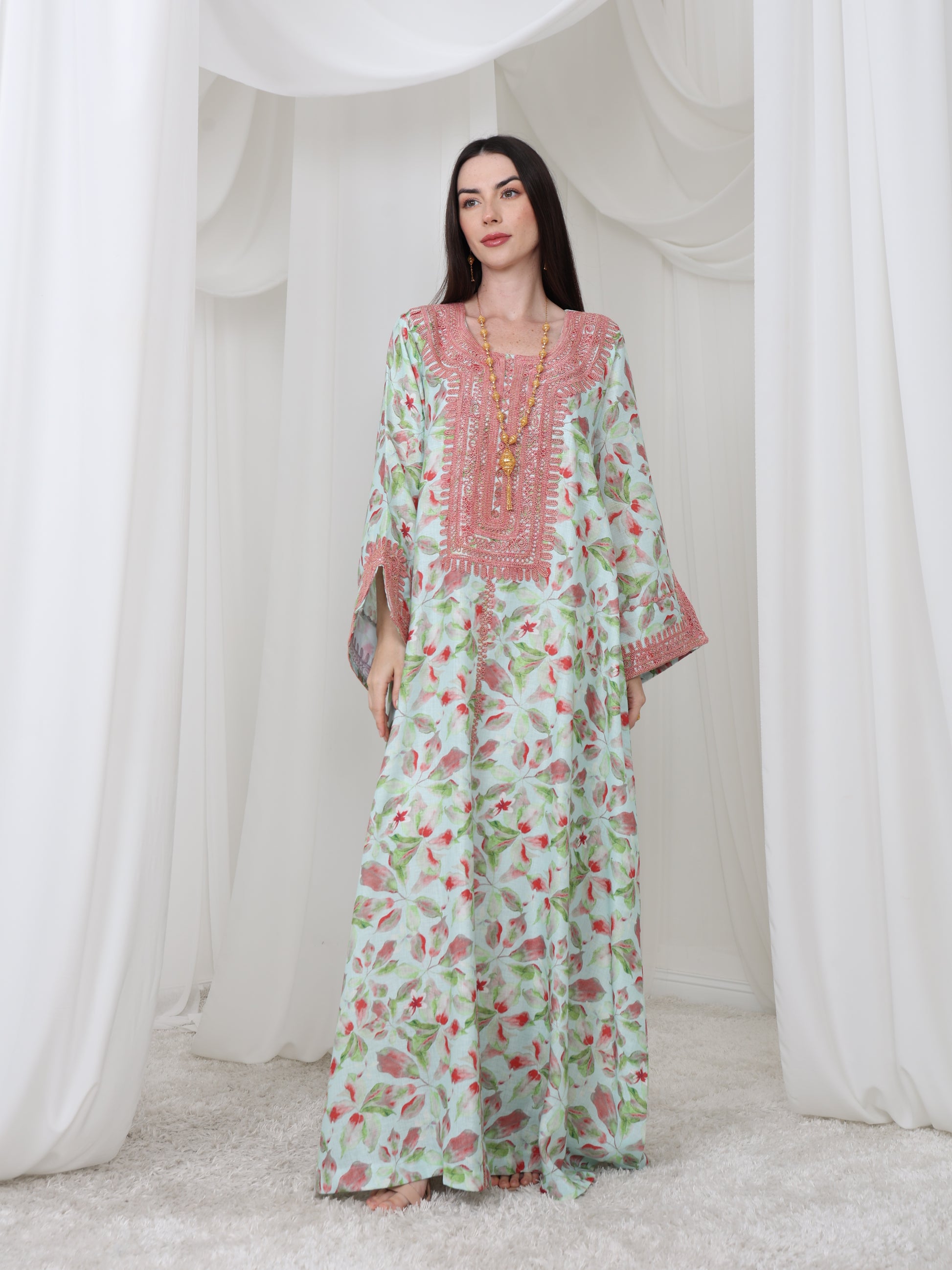 قفطان بتلات الورد يُجسّد أنوثةً فاتنةً بنقشه الزهري الرقيق بدرجات اللون الوردي الهادئة. يتميز بفتحة رقبة على شكل حرف V بتطريز ورديّ متقن يُحيط بوجهكِ بشكلٍ جميل، بينما تُضفي قلادة مُكمّلة لمسةً بوهيمية. يُضفي التصميم الانسيابي والأكمام الواسعة لمسةً من الأناقة الرومانسية، مثالية لحفلات الزفاف في الحديقة أو جلسات شاي ما بعد الظهيرة. الأقمشة خفيفة الوزن ومريحة، مثالية للحفاظ على انتعاشكِ في الطقس الحار. تتوفر القطع بتصميم واحد يناسب الجميع، بمقاس صدر 23 بوصة وطول 58 بوصة. كما نُقدّم خدمة تعديل مجانية.