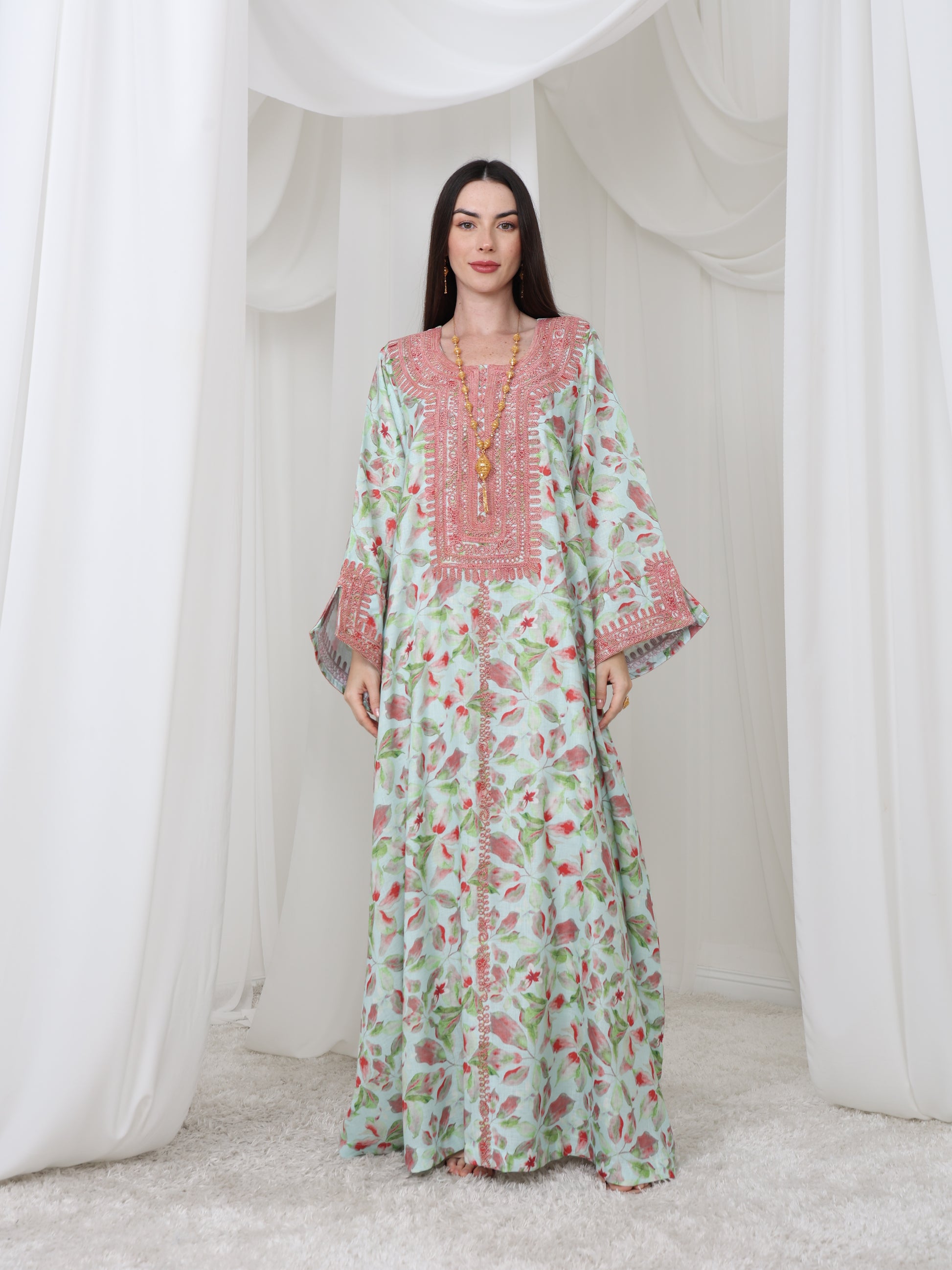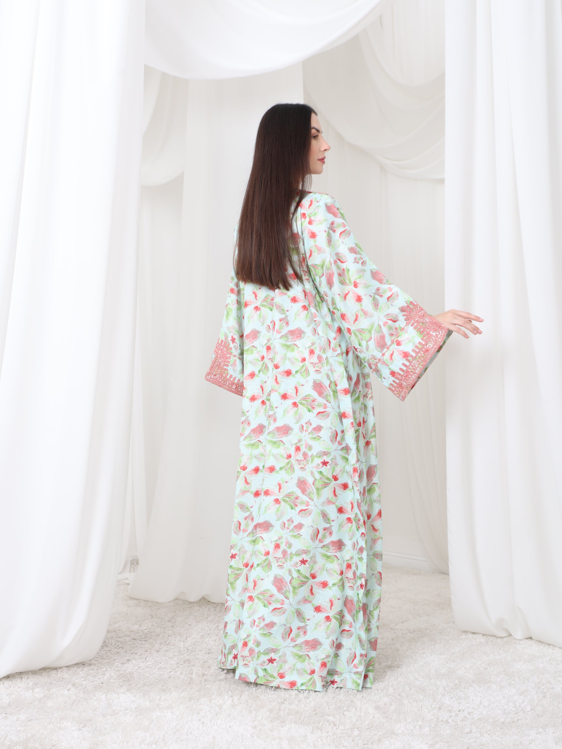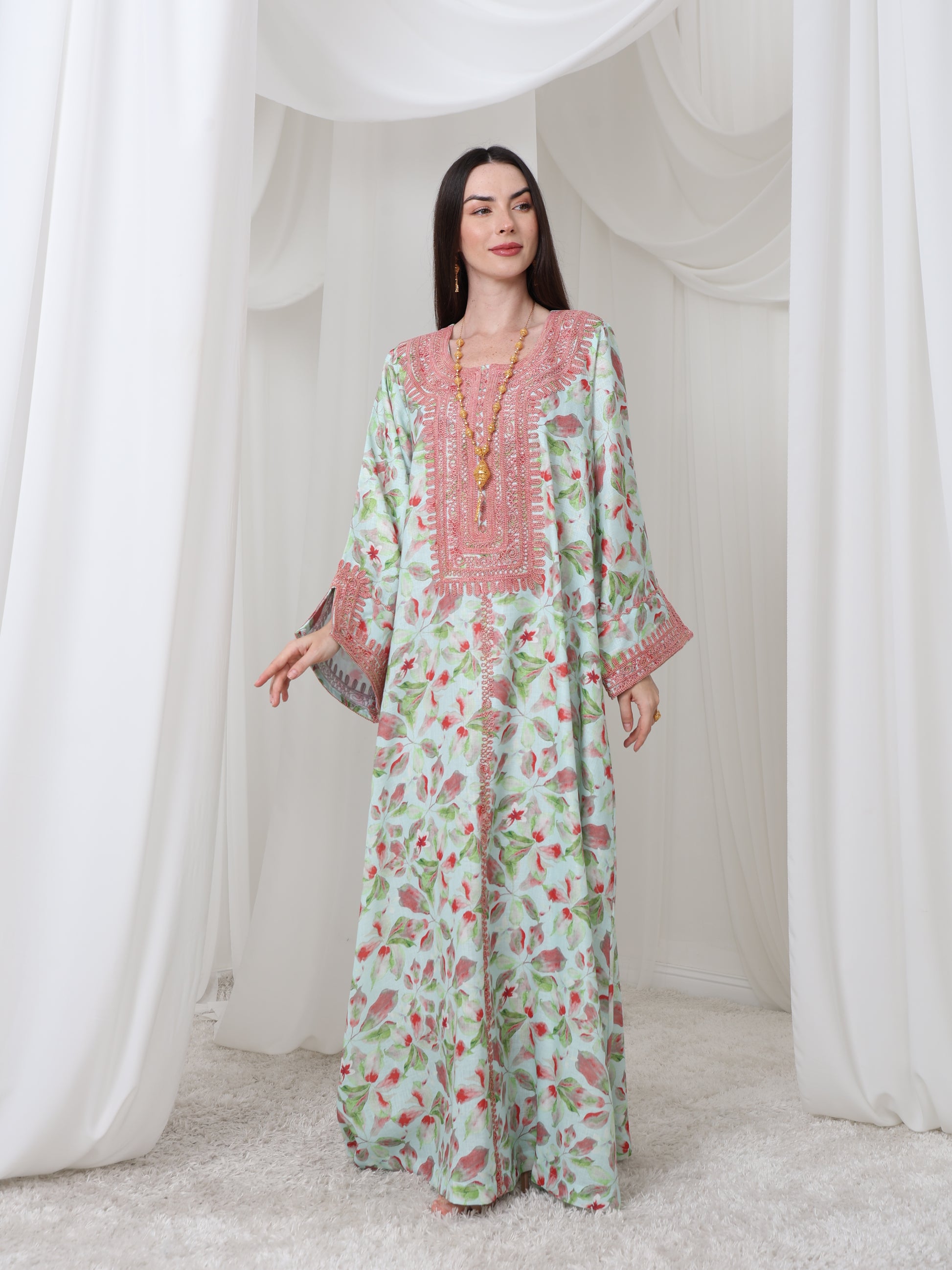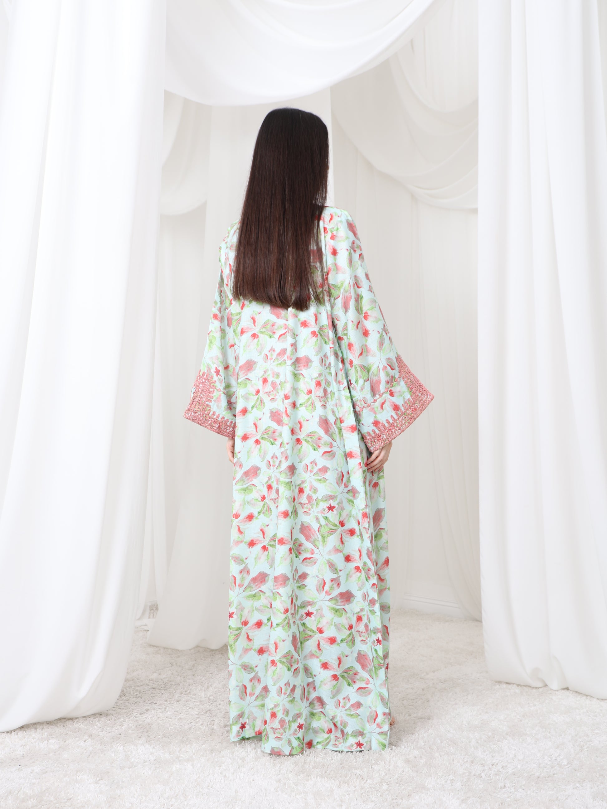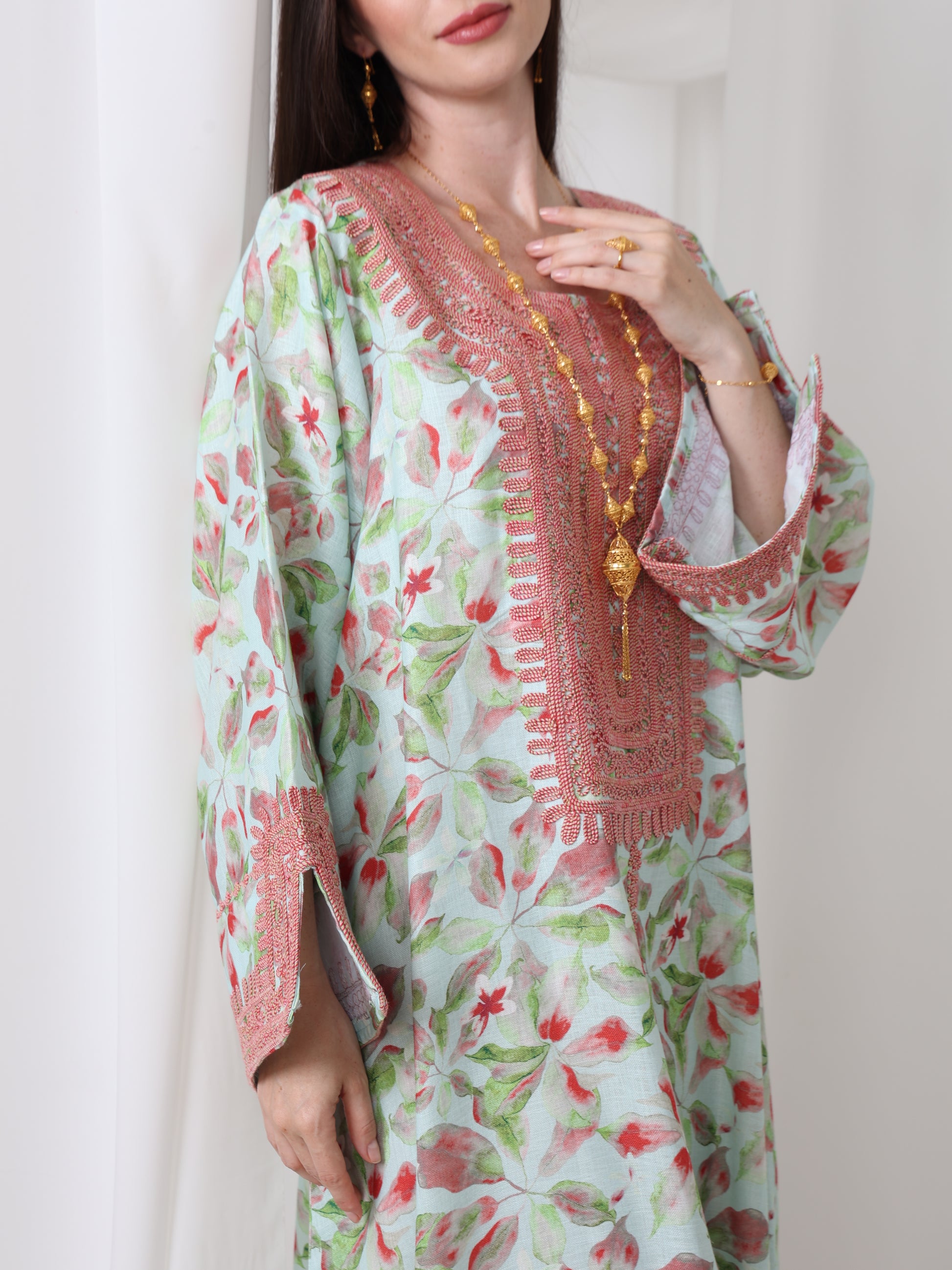 قفطان بتلات الورد يُجسّد أنوثةً فاتنةً بنقشه الزهري الرقيق بدرجات اللون الوردي الهادئة. يتميز بفتحة رقبة على شكل حرف V بتطريز ورديّ متقن يُحيط بوجهكِ بشكلٍ جميل، بينما تُضفي قلادة مُكمّلة لمسةً بوهيمية. يُضفي التصميم الانسيابي والأكمام الواسعة لمسةً من الأناقة الرومانسية، مثالية لحفلات الزفاف في الحديقة أو جلسات شاي ما بعد الظهيرة. الأقمشة خفيفة الوزن ومريحة، مثالية للحفاظ على انتعاشكِ في الطقس الحار. تتوفر القطع بتصميم واحد يناسب الجميع، بمقاس صدر 23 بوصة وطول 58 بوصة. كما نُقدّم خدمة تعديل مجانية.