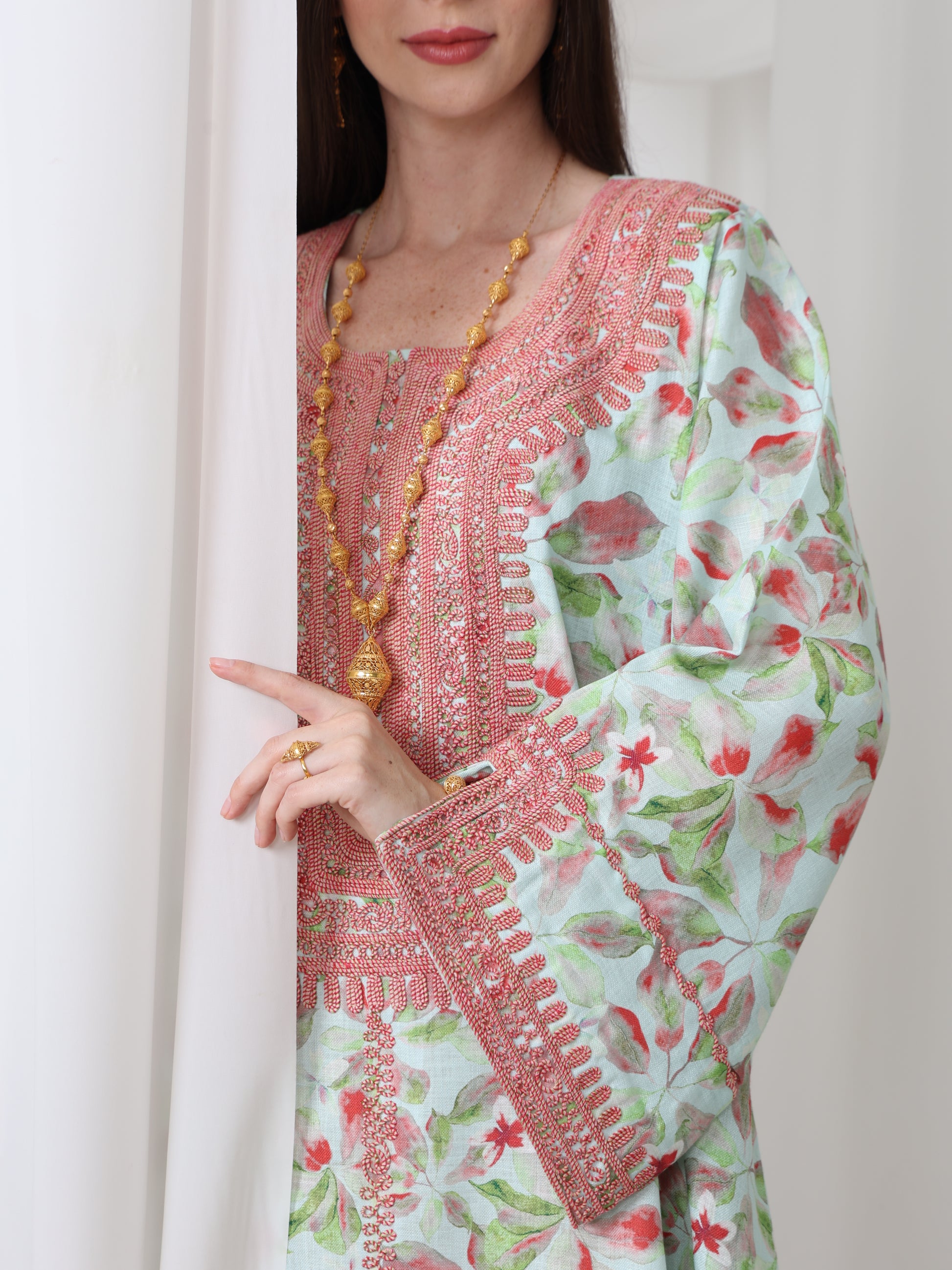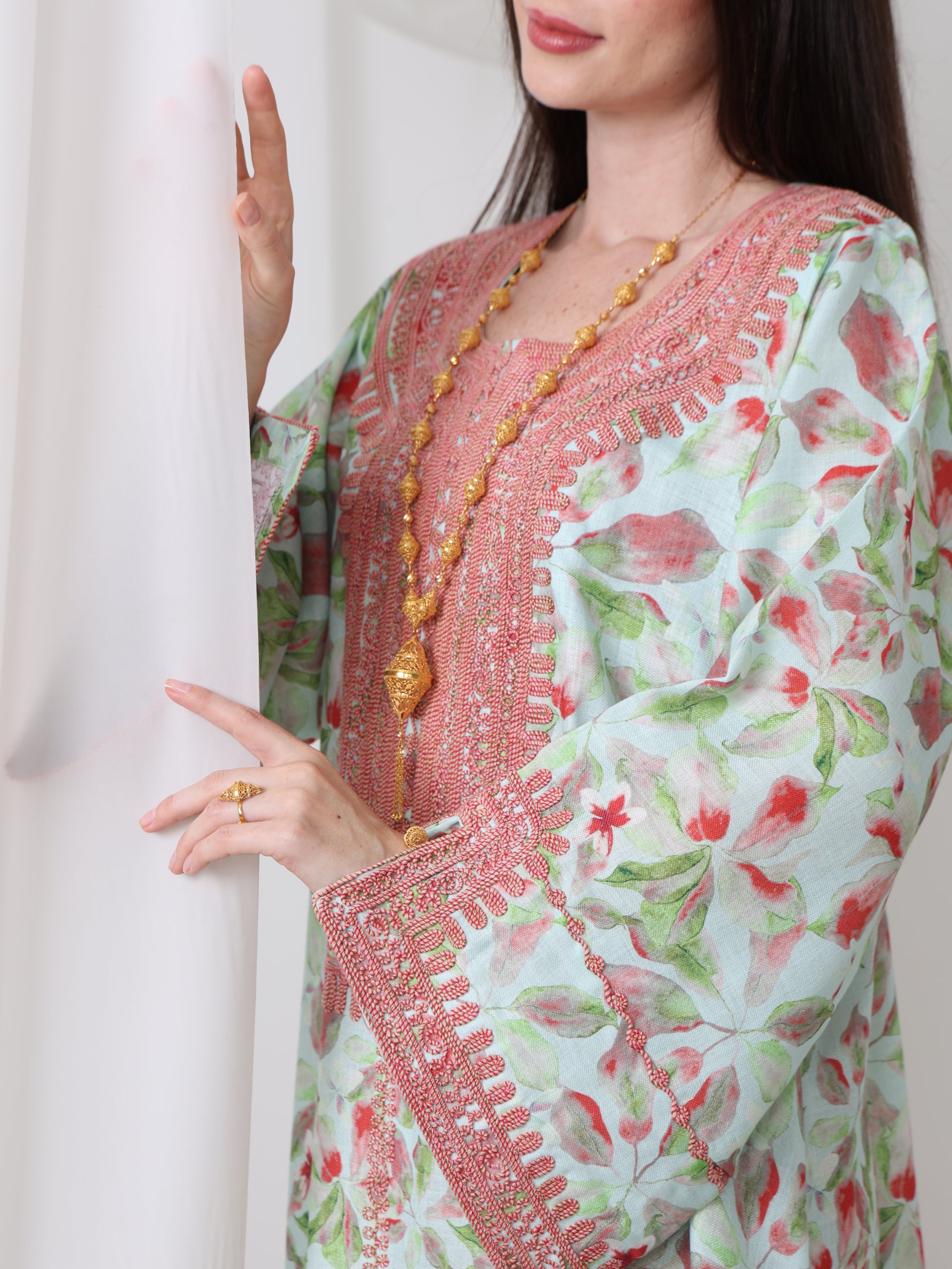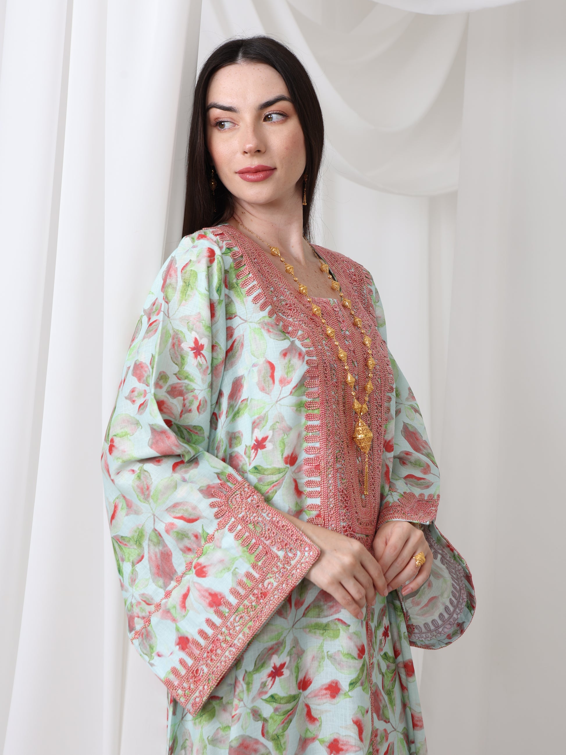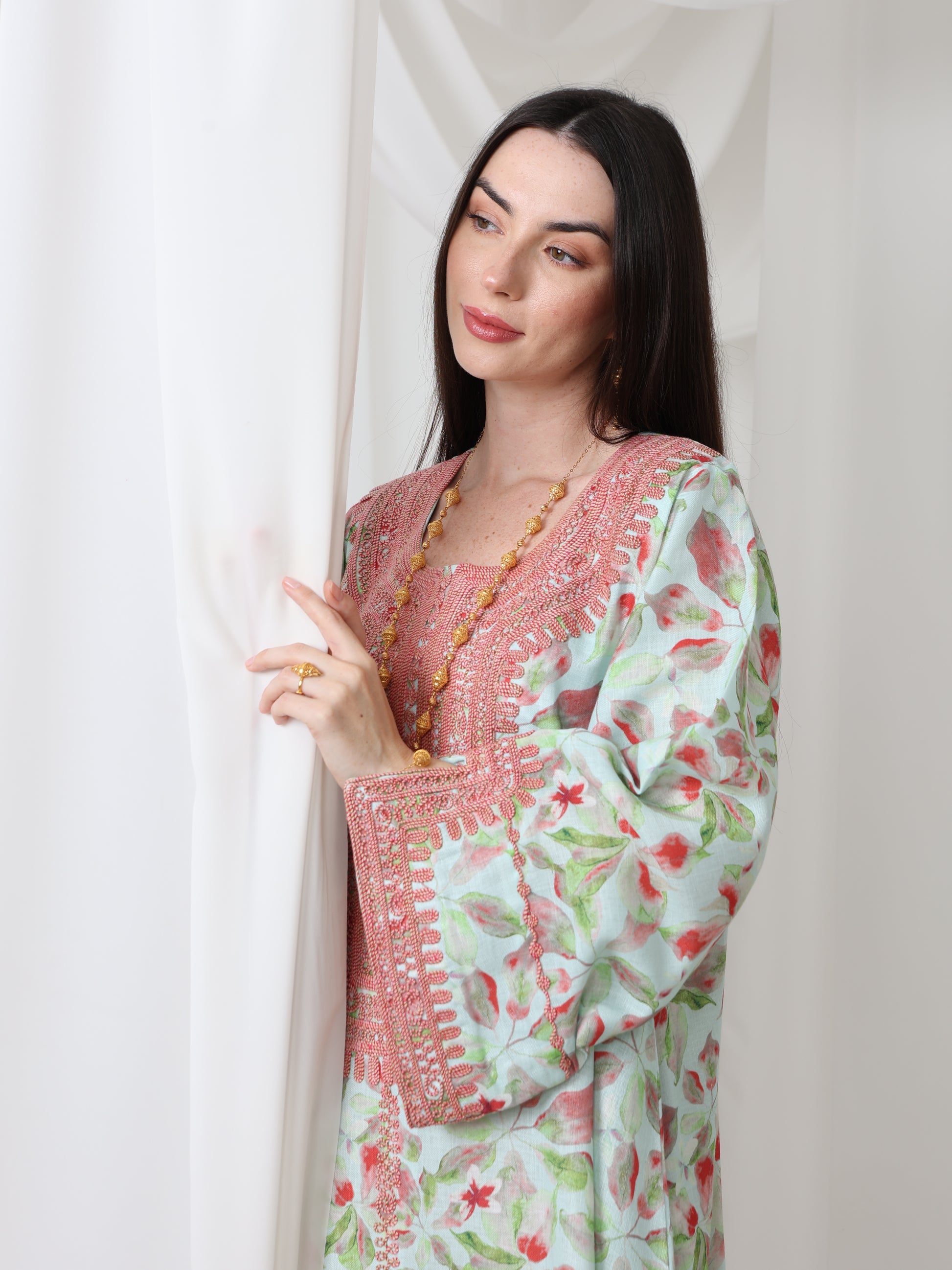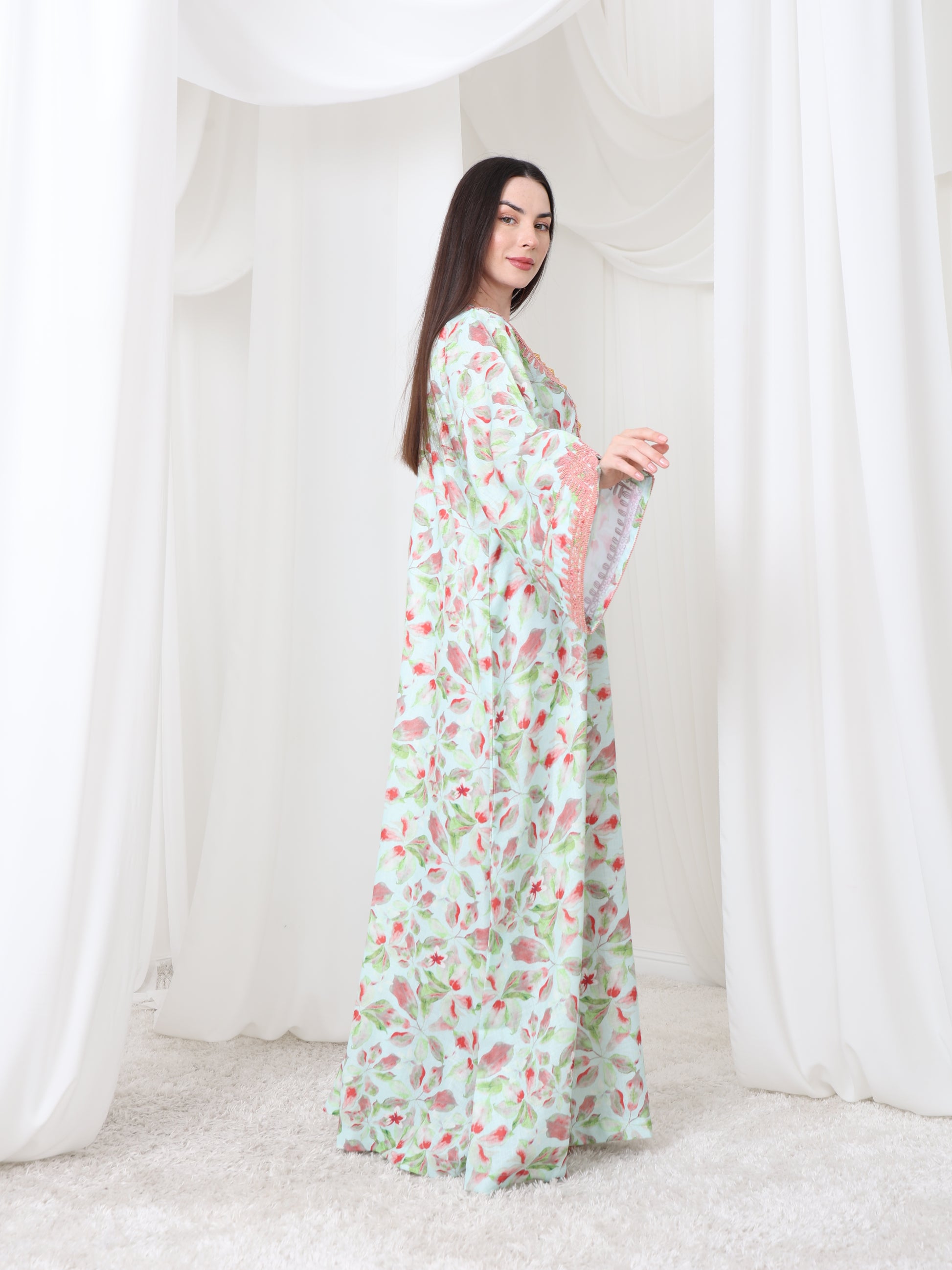 قفطان بتلات الورد يُجسّد أنوثةً فاتنةً بنقشه الزهري الرقيق بدرجات اللون الوردي الهادئة. يتميز بفتحة رقبة على شكل حرف V بتطريز ورديّ متقن يُحيط بوجهكِ بشكلٍ جميل، بينما تُضفي قلادة مُكمّلة لمسةً بوهيمية. يُضفي التصميم الانسيابي والأكمام الواسعة لمسةً من الأناقة الرومانسية، مثالية لحفلات الزفاف في الحديقة أو جلسات شاي ما بعد الظهيرة. الأقمشة خفيفة الوزن ومريحة، مثالية للحفاظ على انتعاشكِ في الطقس الحار. تتوفر القطع بتصميم واحد يناسب الجميع، بمقاس صدر 23 بوصة وطول 58 بوصة. كما نُقدّم خدمة تعديل مجانية.