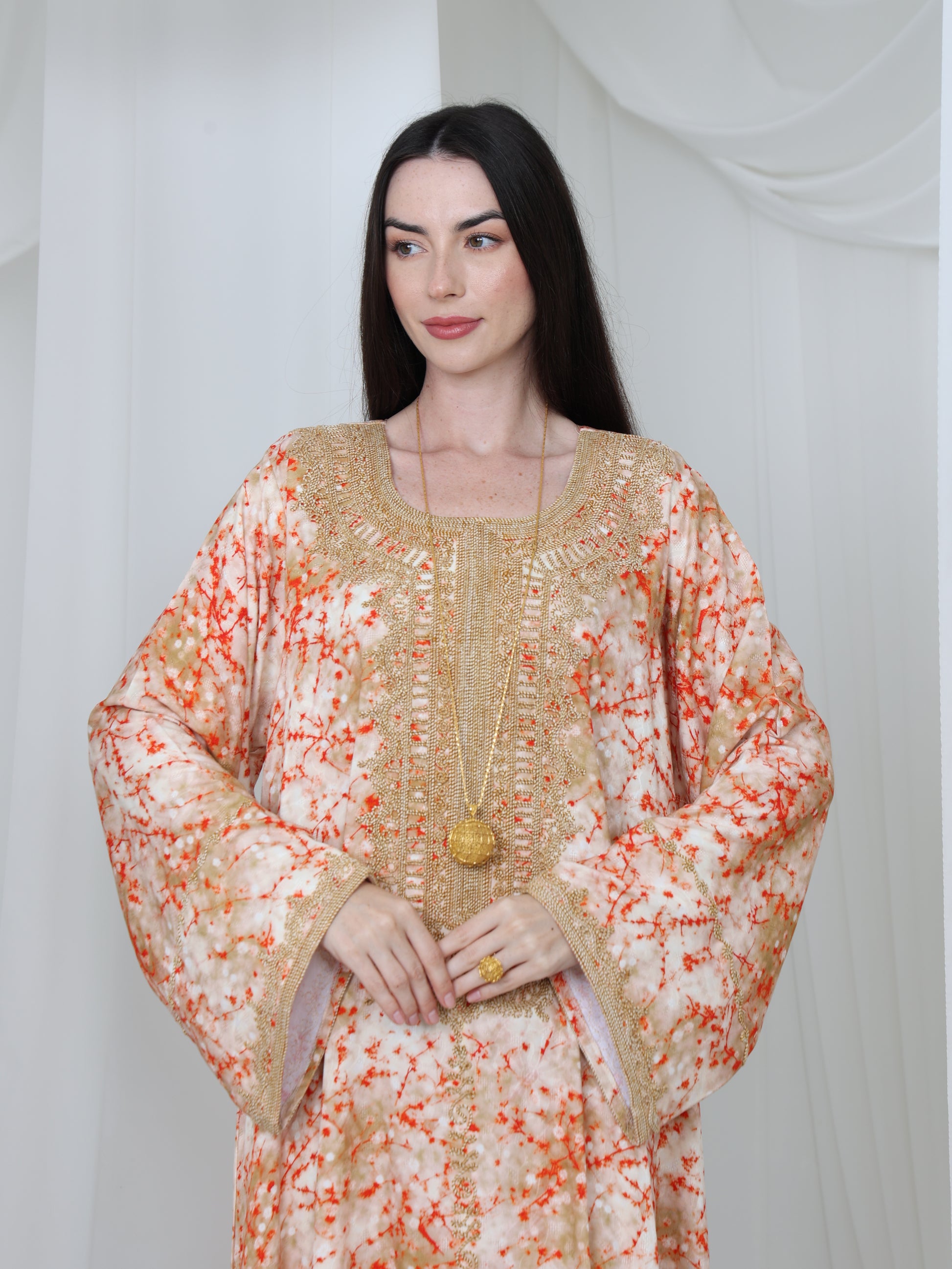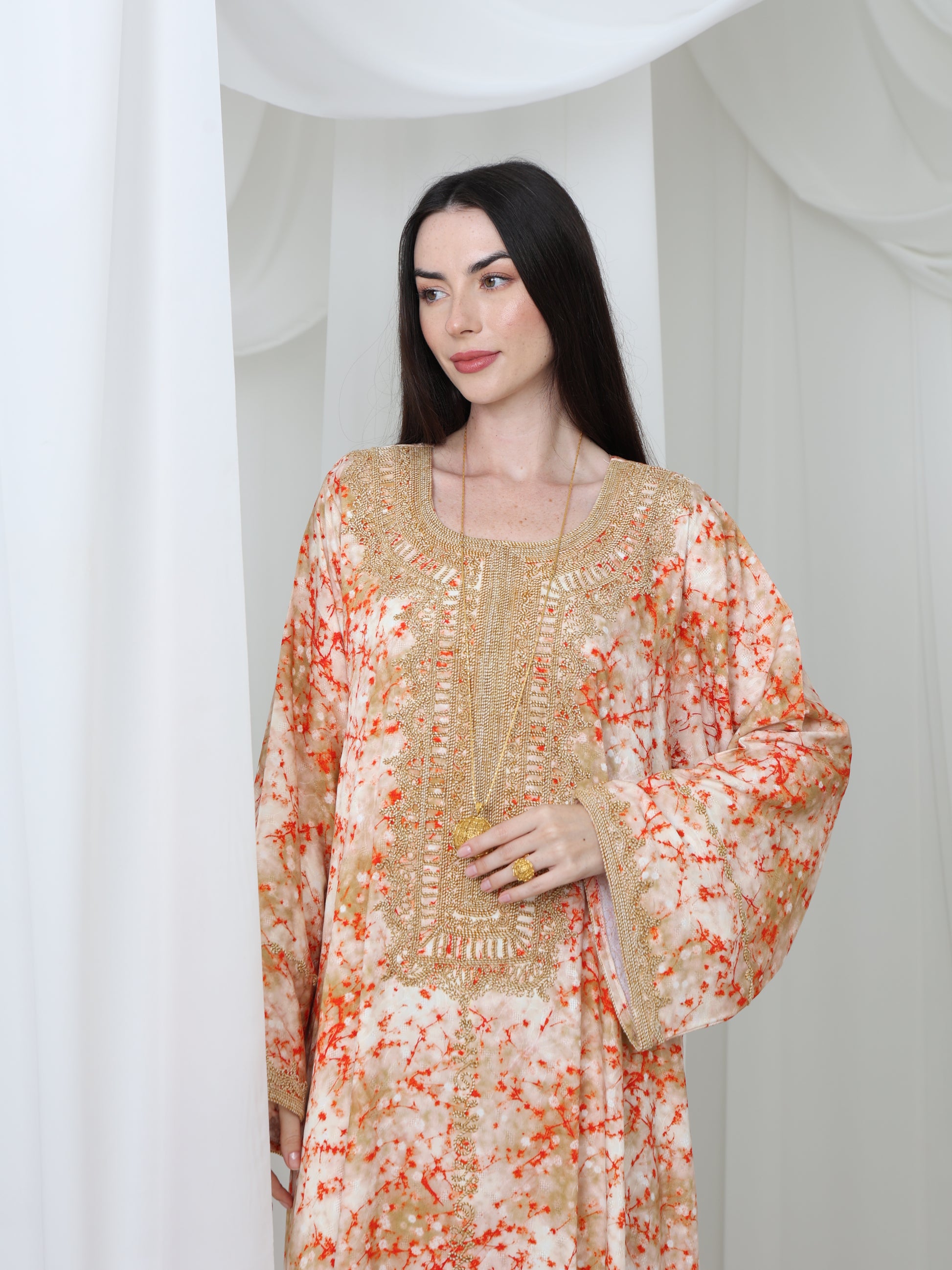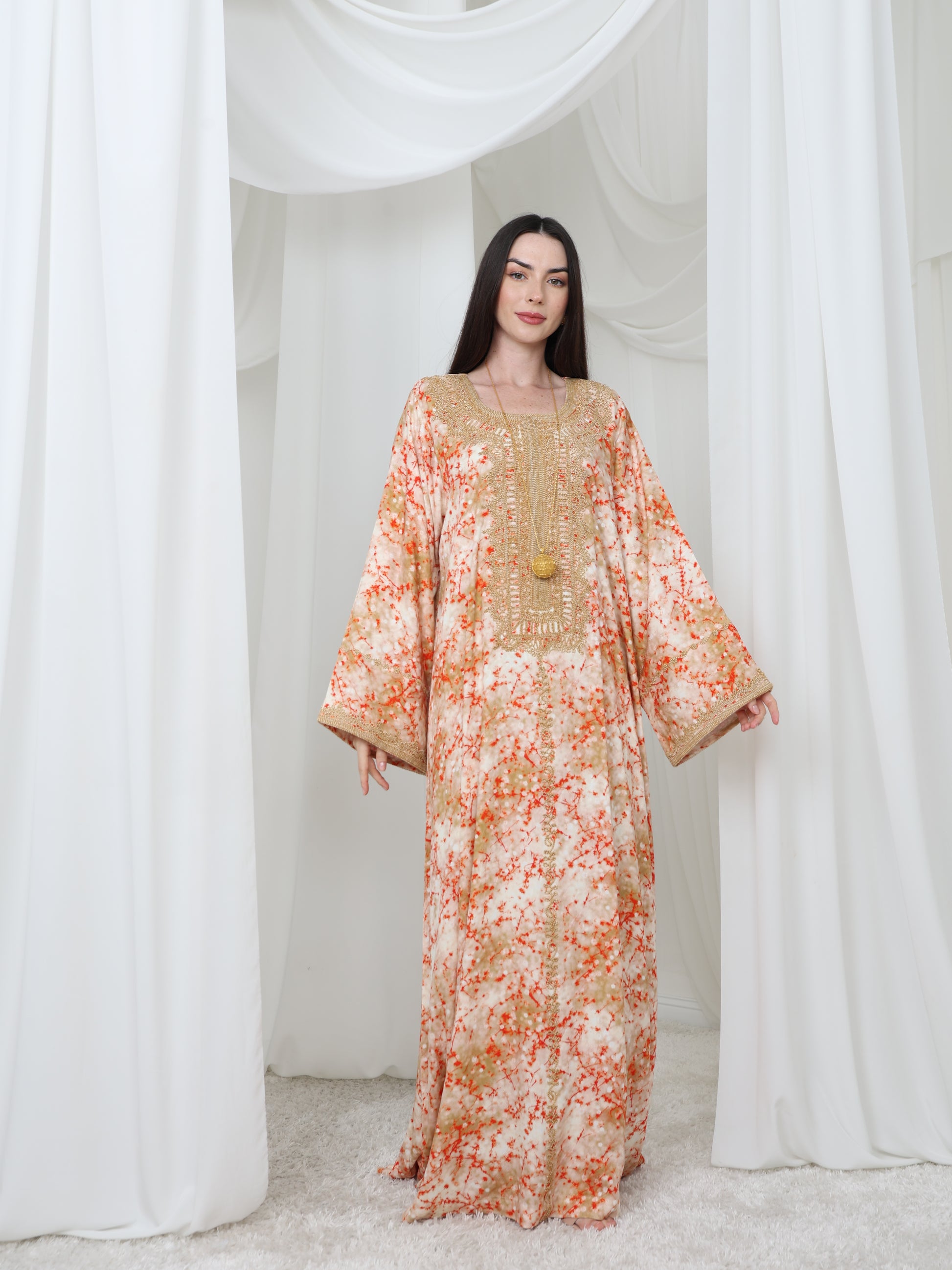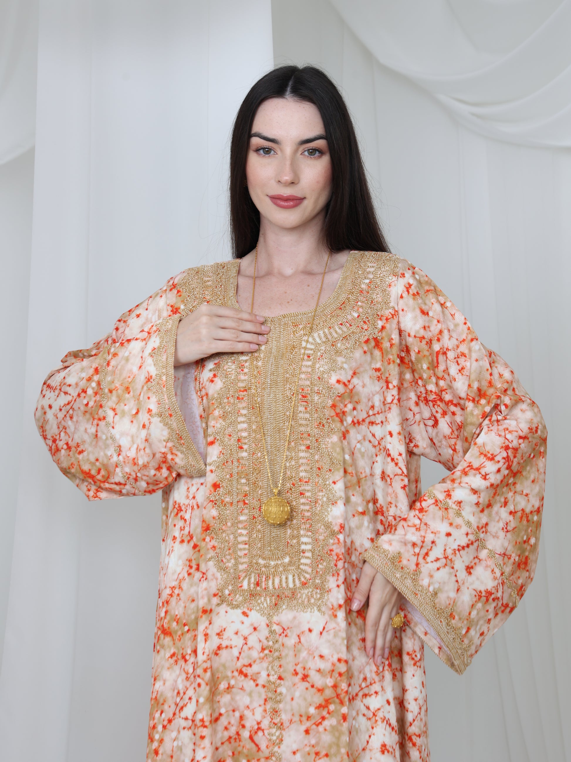 قفطان شروق الشمس المرجاني يشعّ بالدفء بفضل نقشه الزهري الرقيق بألوان المرجان الناعم والكريمي. مزين بتطريز ذهبي متقن على فتحة العنق على شكل حرف V، يجمع هذا القفطان بين الحرفية التقليدية والتصميم العصري. تصميمه الانسيابي وأكمامه الجرسية تُضفي لمسةً أنيقةً مع كل حركة. مع القلادة المتناسقة، يُضفي هذا القفطان إطلالةً متكاملةً مثاليةً لحفلات الحديقة، أو تجمعات الغداء، أو إطلالات المنتجعات الأنيقة. يبلغ عرض هذا القفطان 23 بوصة (68 سم) عند الصدر وطوله 58 بوصة (132 سم). التعديلات مجانية.
