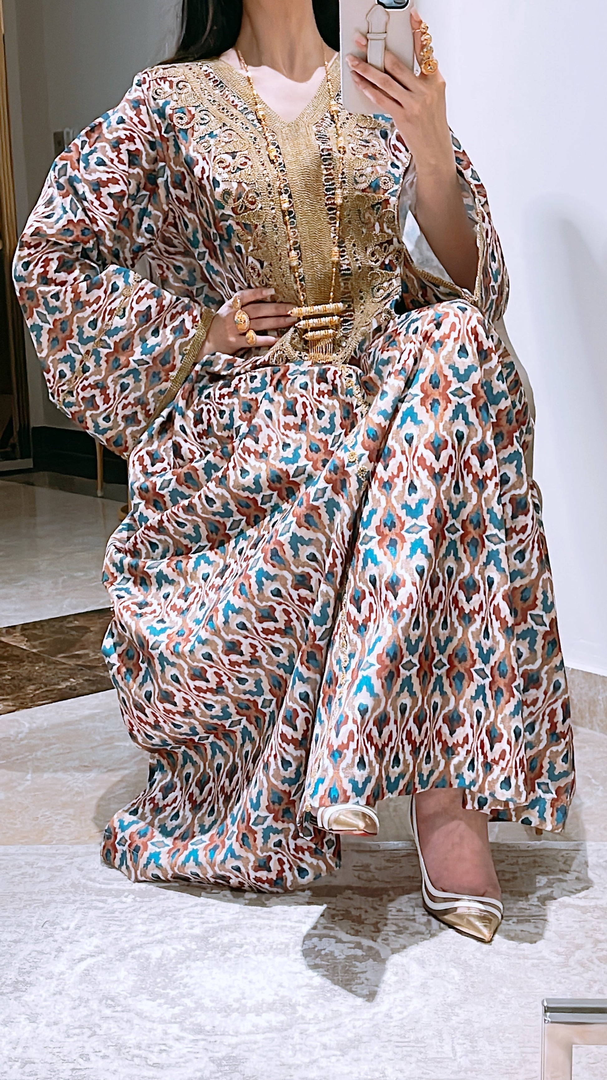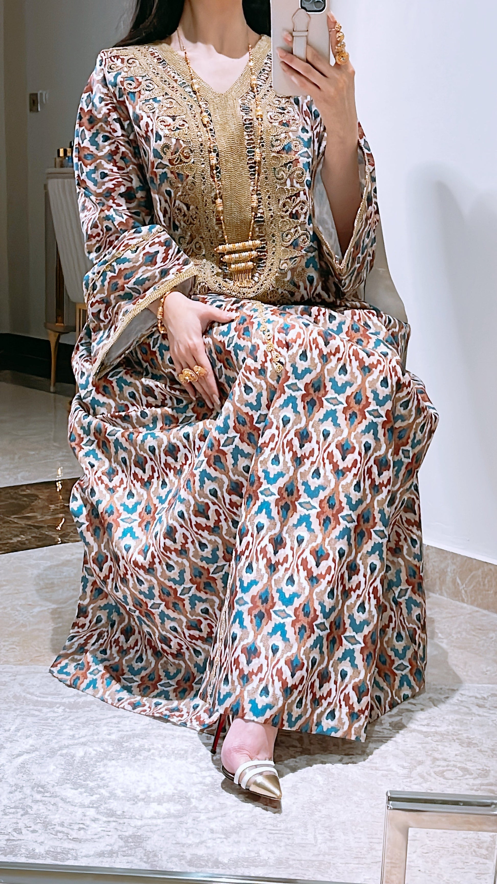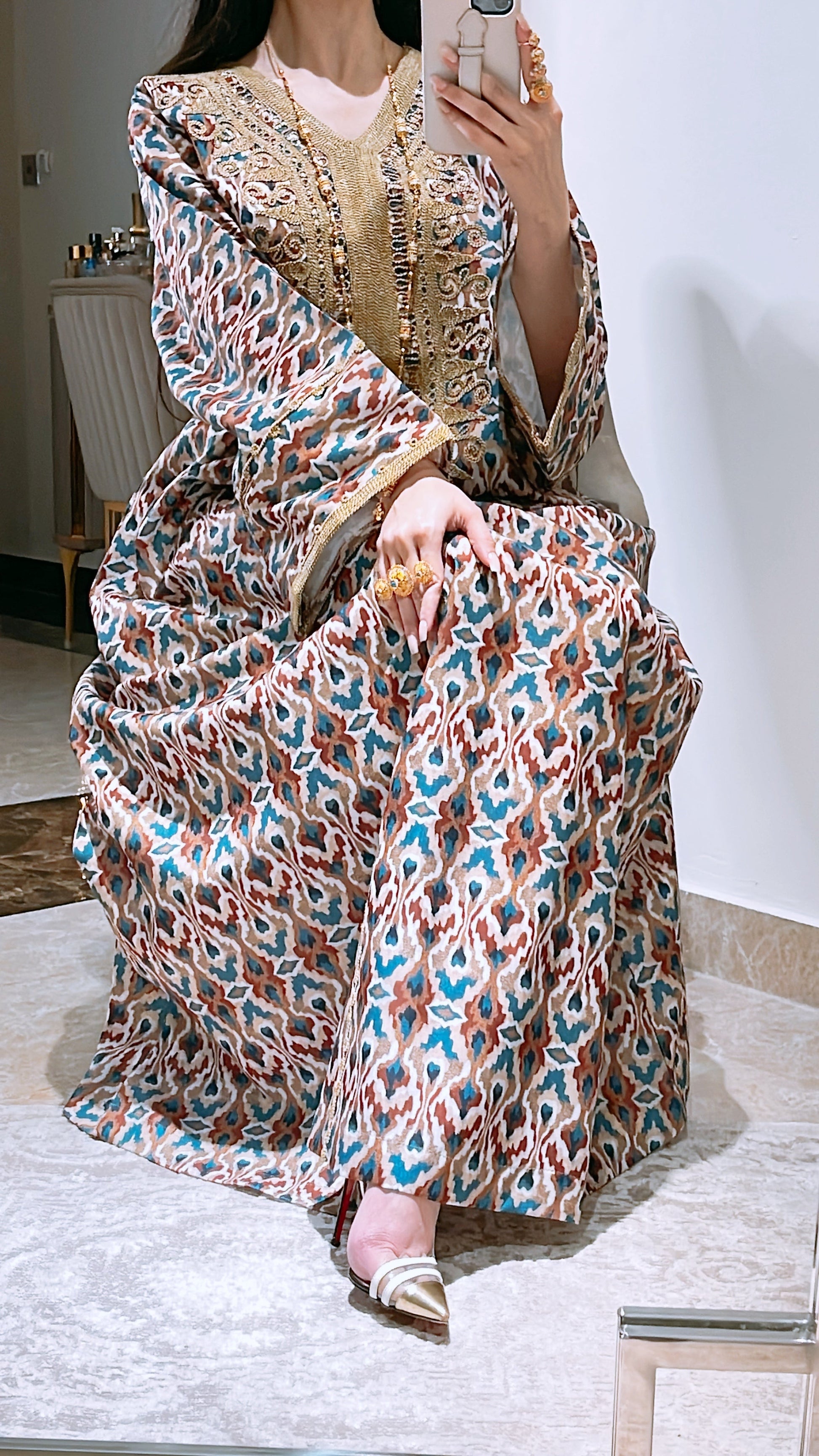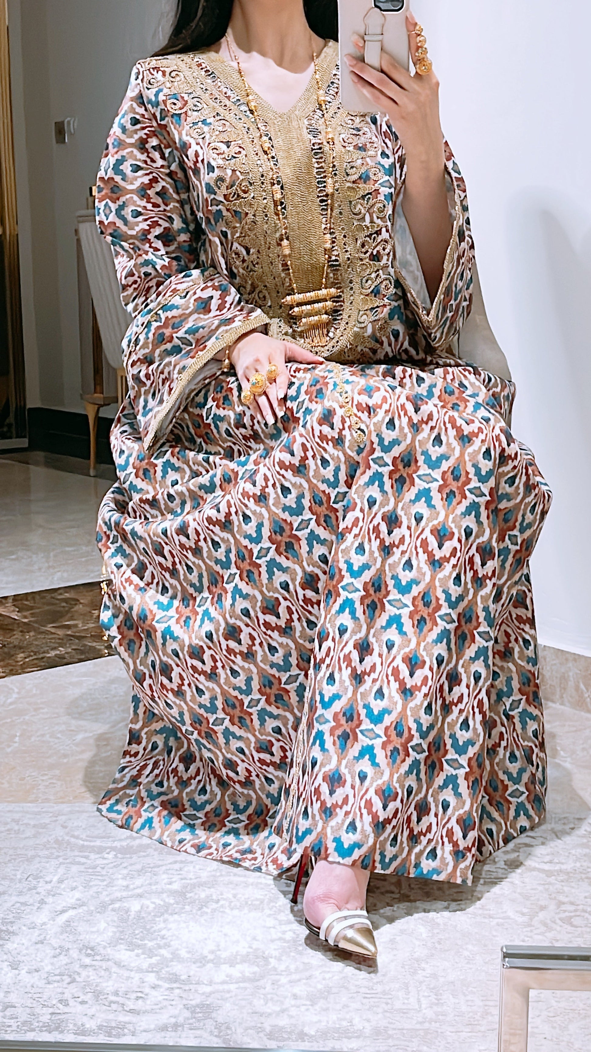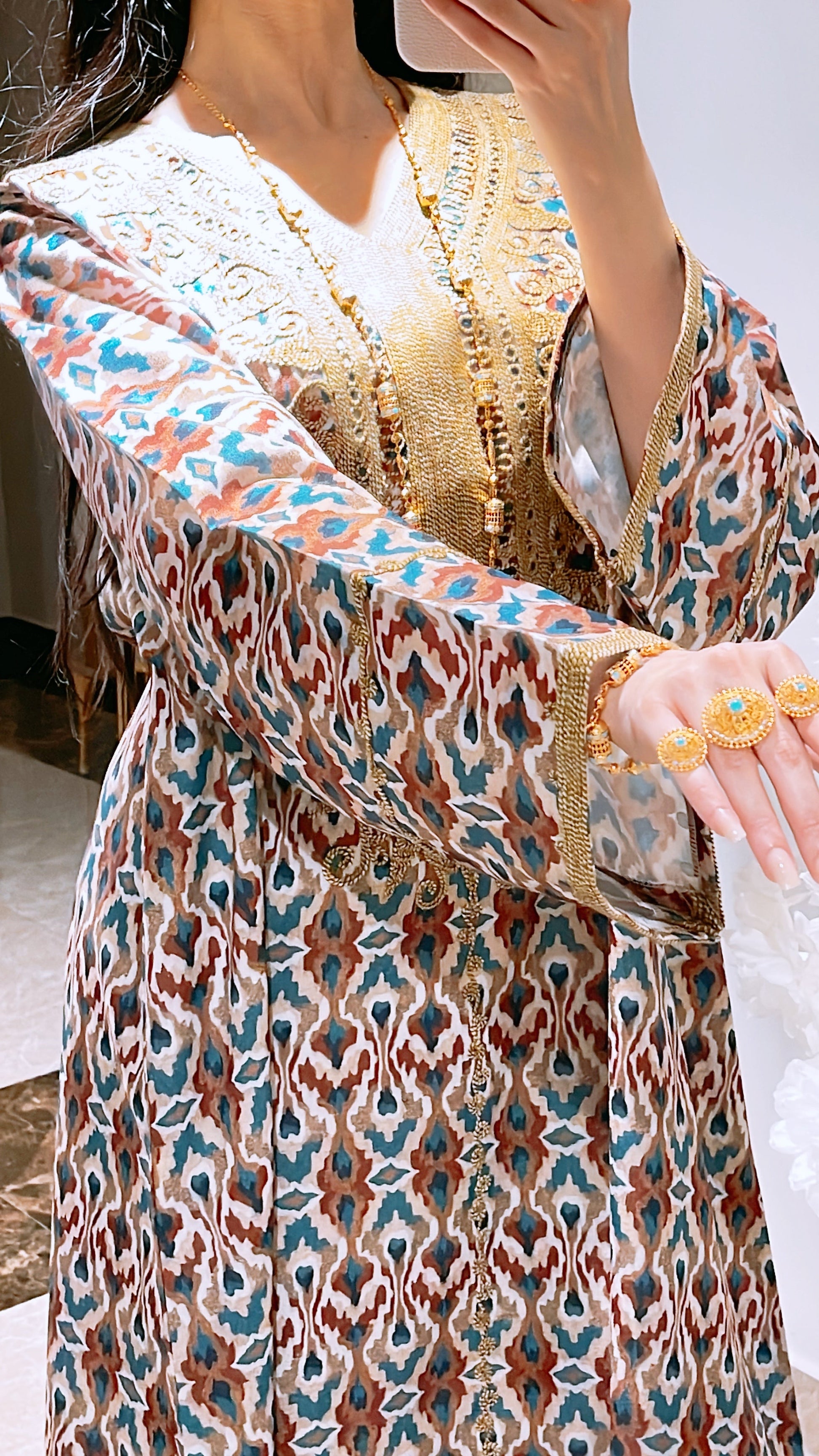 Description: Step into a world of playful whimsy with Cosmic Mosaic. This dress bursts with psychedelic geometric patterns in vibrant hues, evoking a sense of artistic flair and dynamic energy. The tan embroidery along the V-neckline and sleeves provides a grounding contrast, lending a touch of earthy elegance to its bold design. Perfect for casual outings, art events, or simply embracing your creative spirit, Cosmic Mosaic blends expressive style with effortless comfort. The breathable cotton fabric ensures you feel as good as you look, making it a standout addition to any wardrobe.