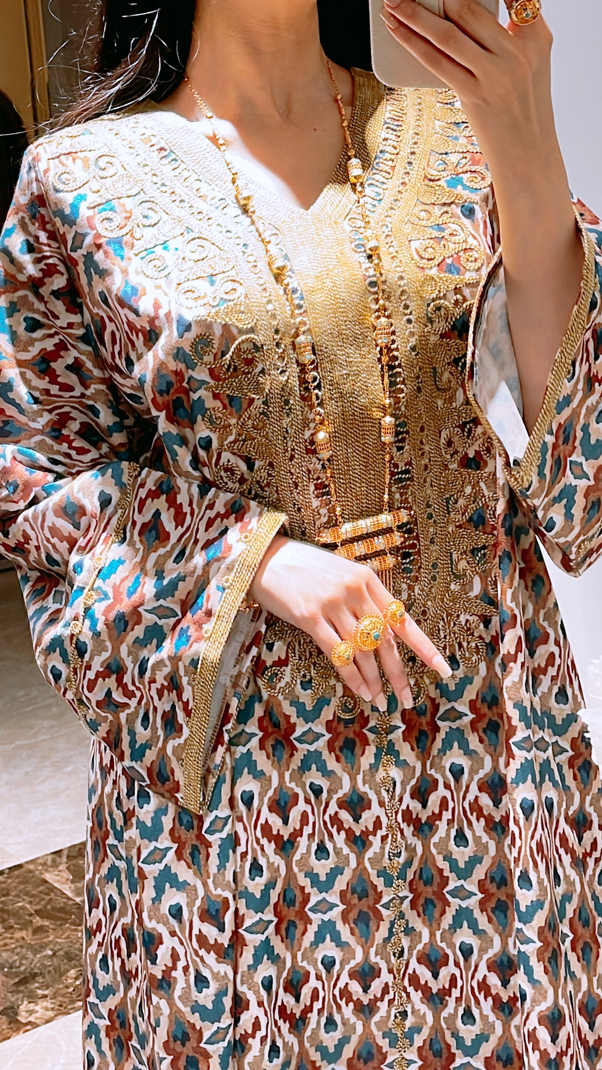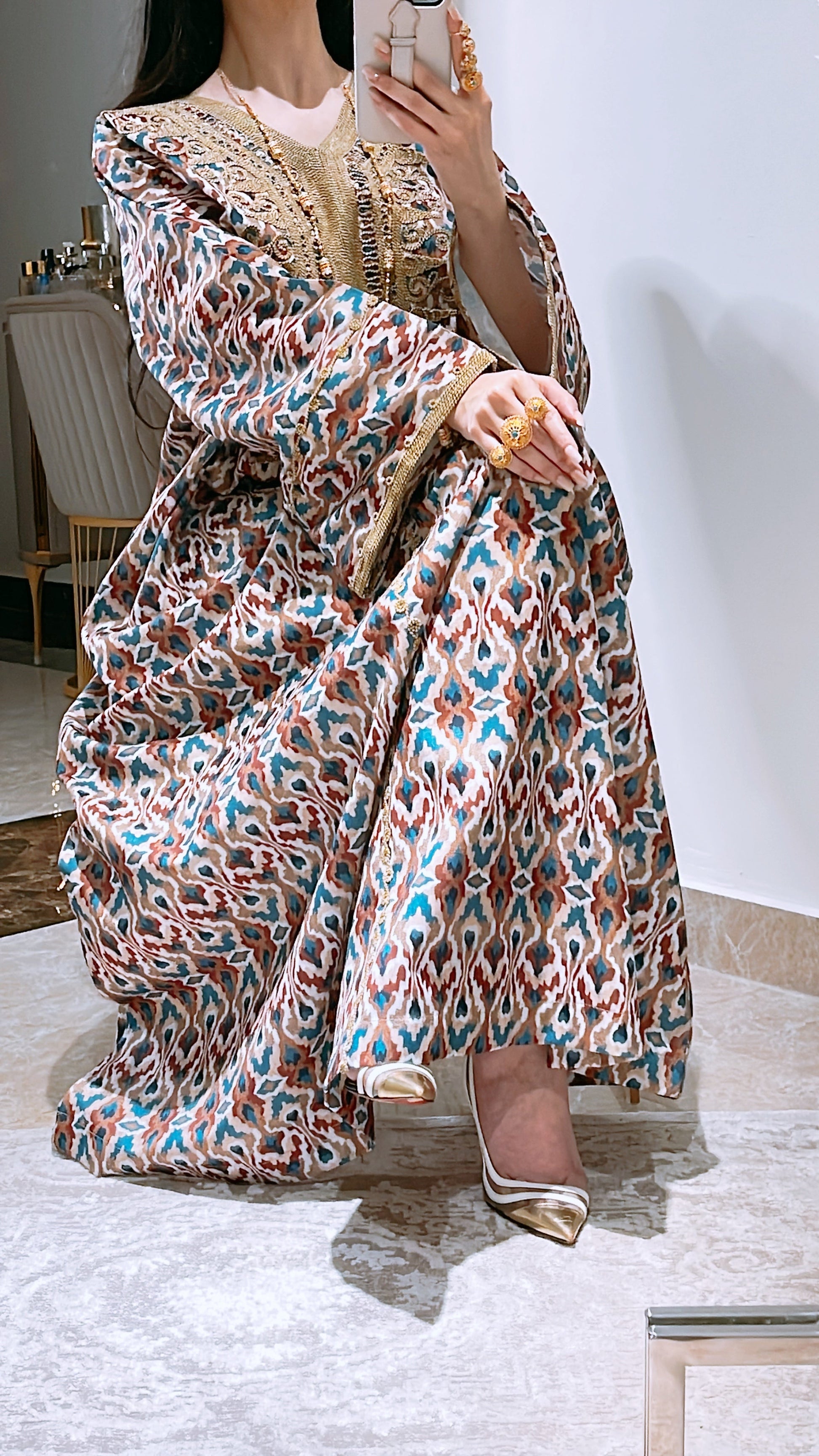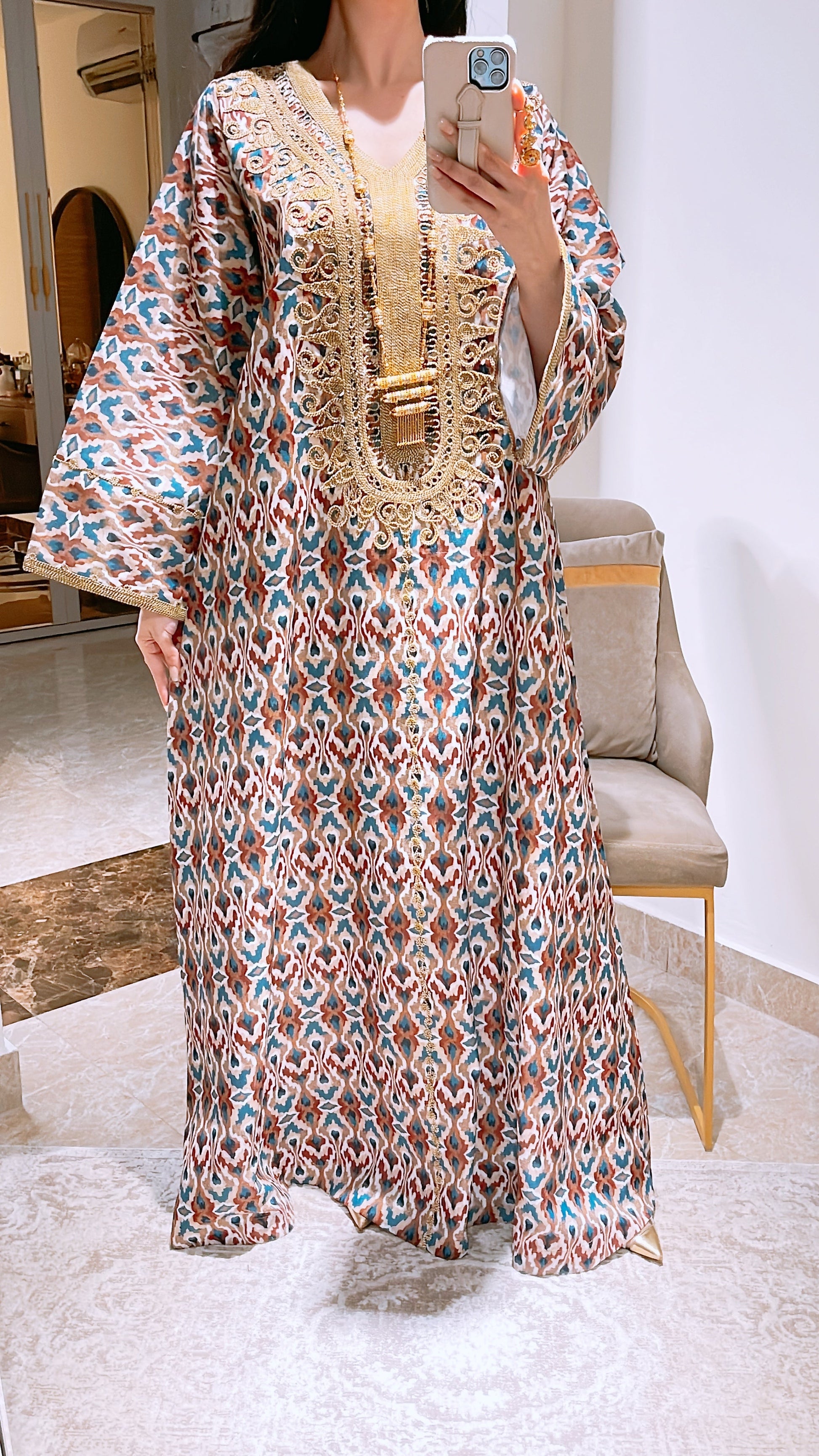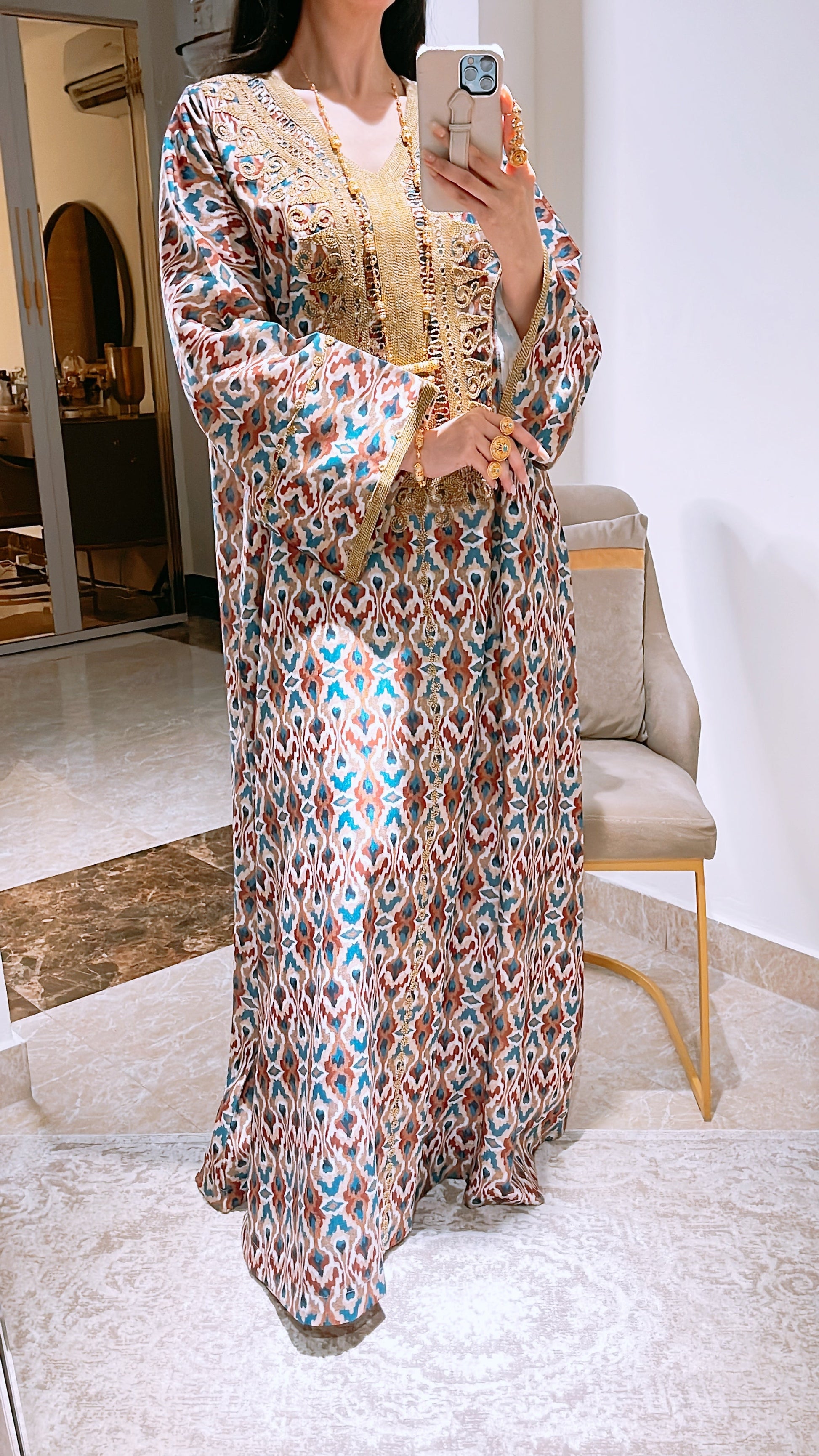 Description: Step into a world of playful whimsy with Cosmic Mosaic. This dress bursts with psychedelic geometric patterns in vibrant hues, evoking a sense of artistic flair and dynamic energy. The tan embroidery along the V-neckline and sleeves provides a grounding contrast, lending a touch of earthy elegance to its bold design. Perfect for casual outings, art events, or simply embracing your creative spirit, Cosmic Mosaic blends expressive style with effortless comfort. The breathable cotton fabric ensures you feel as good as you look, making it a standout addition to any wardrobe.