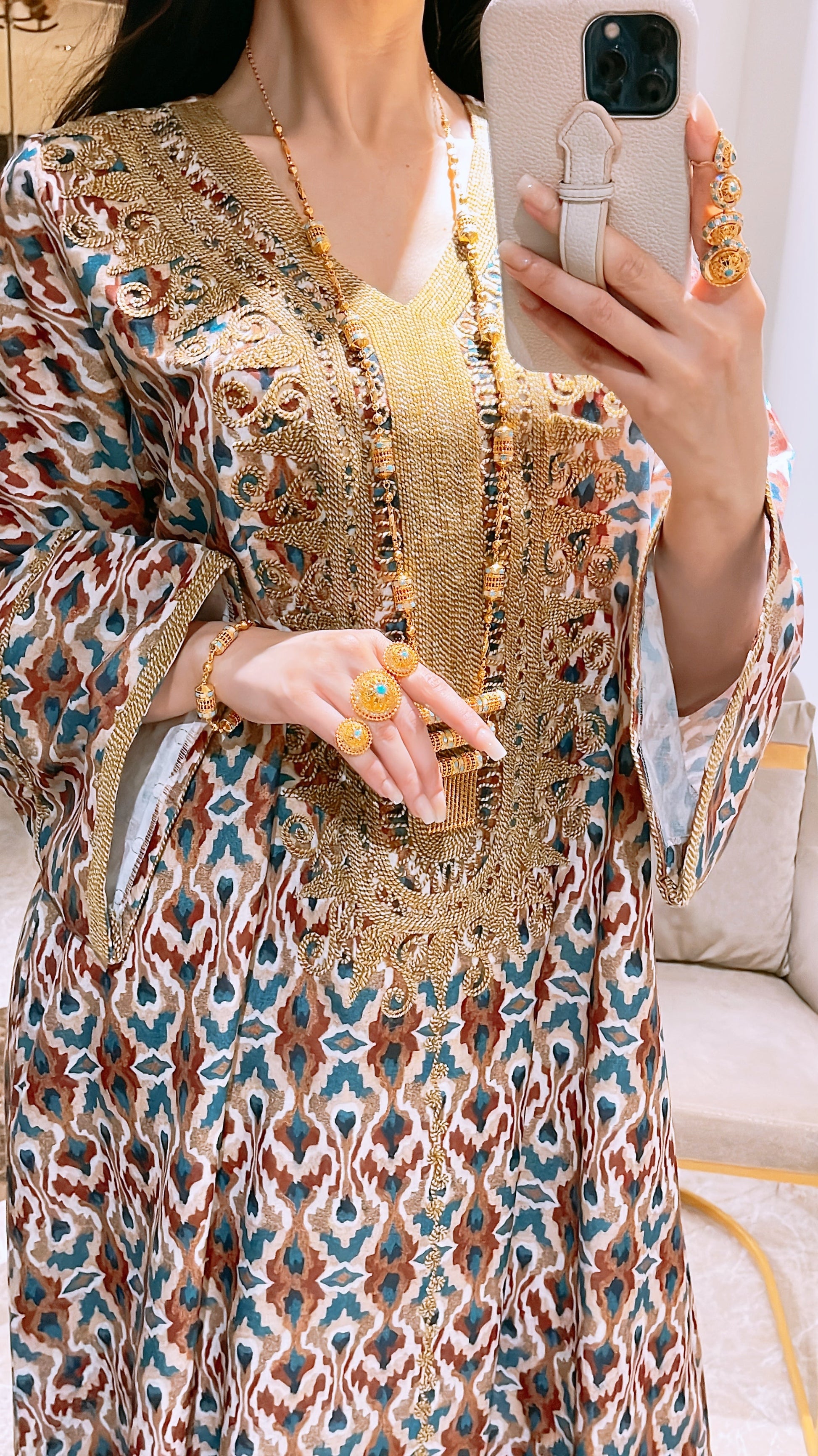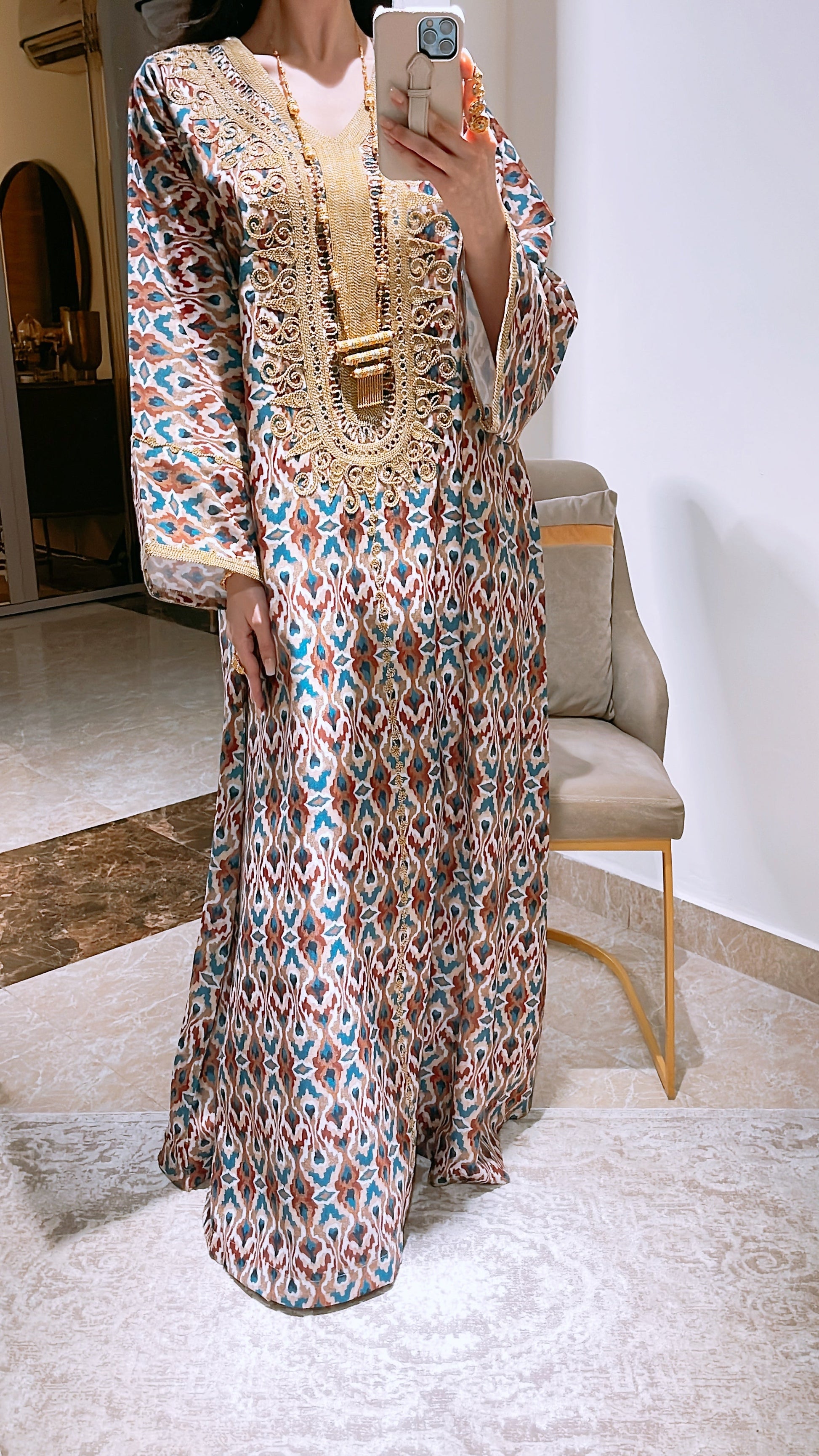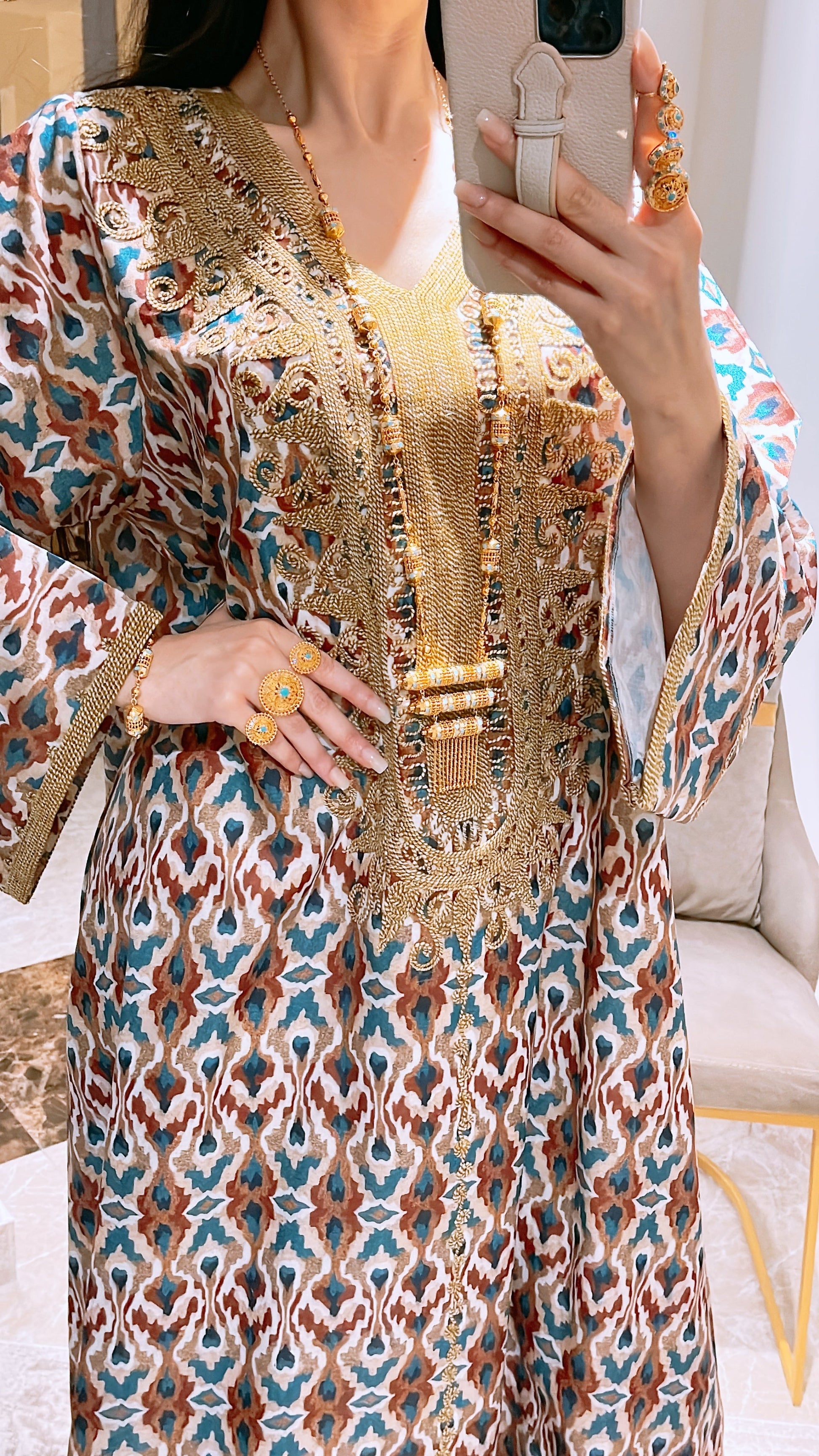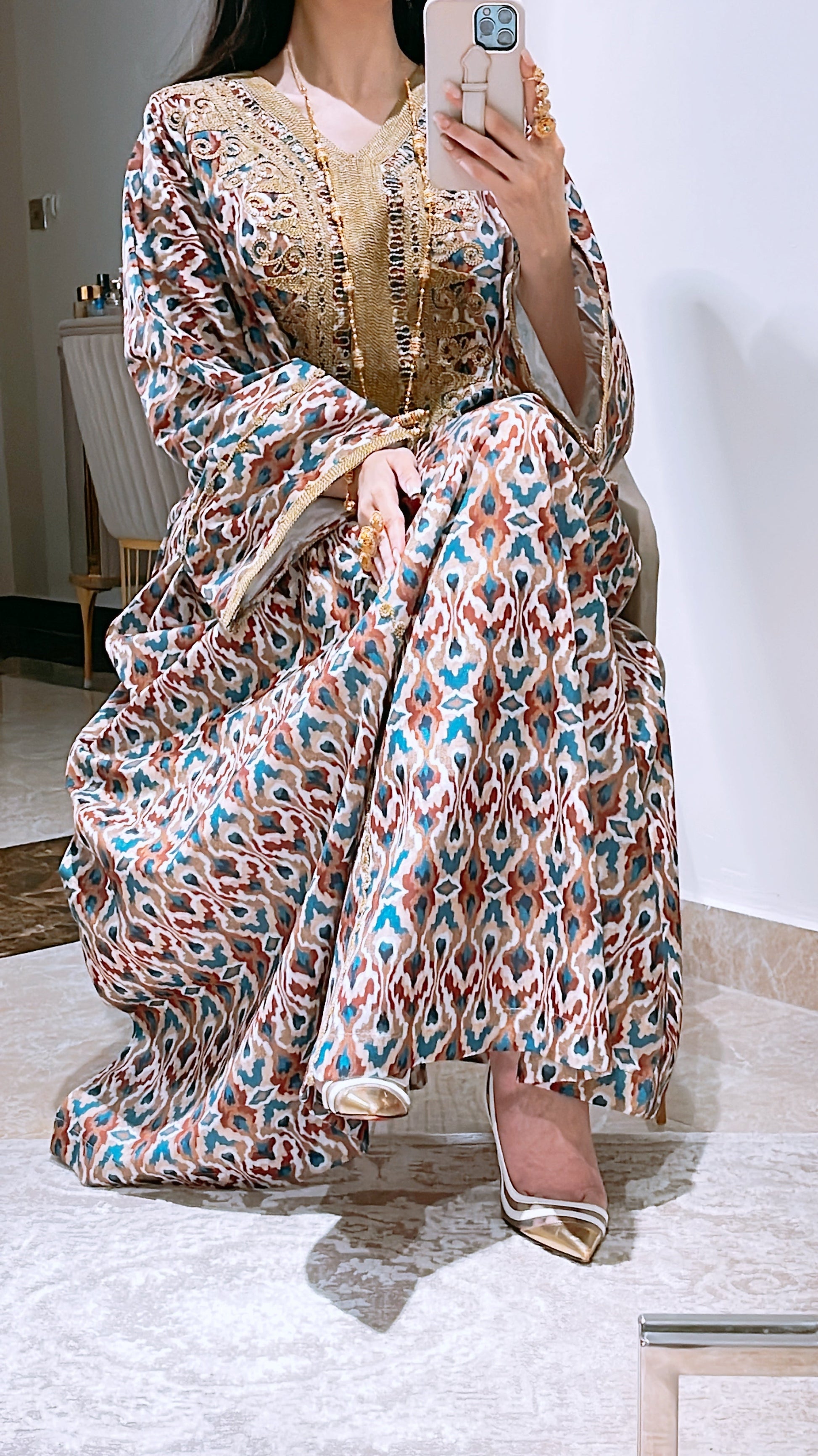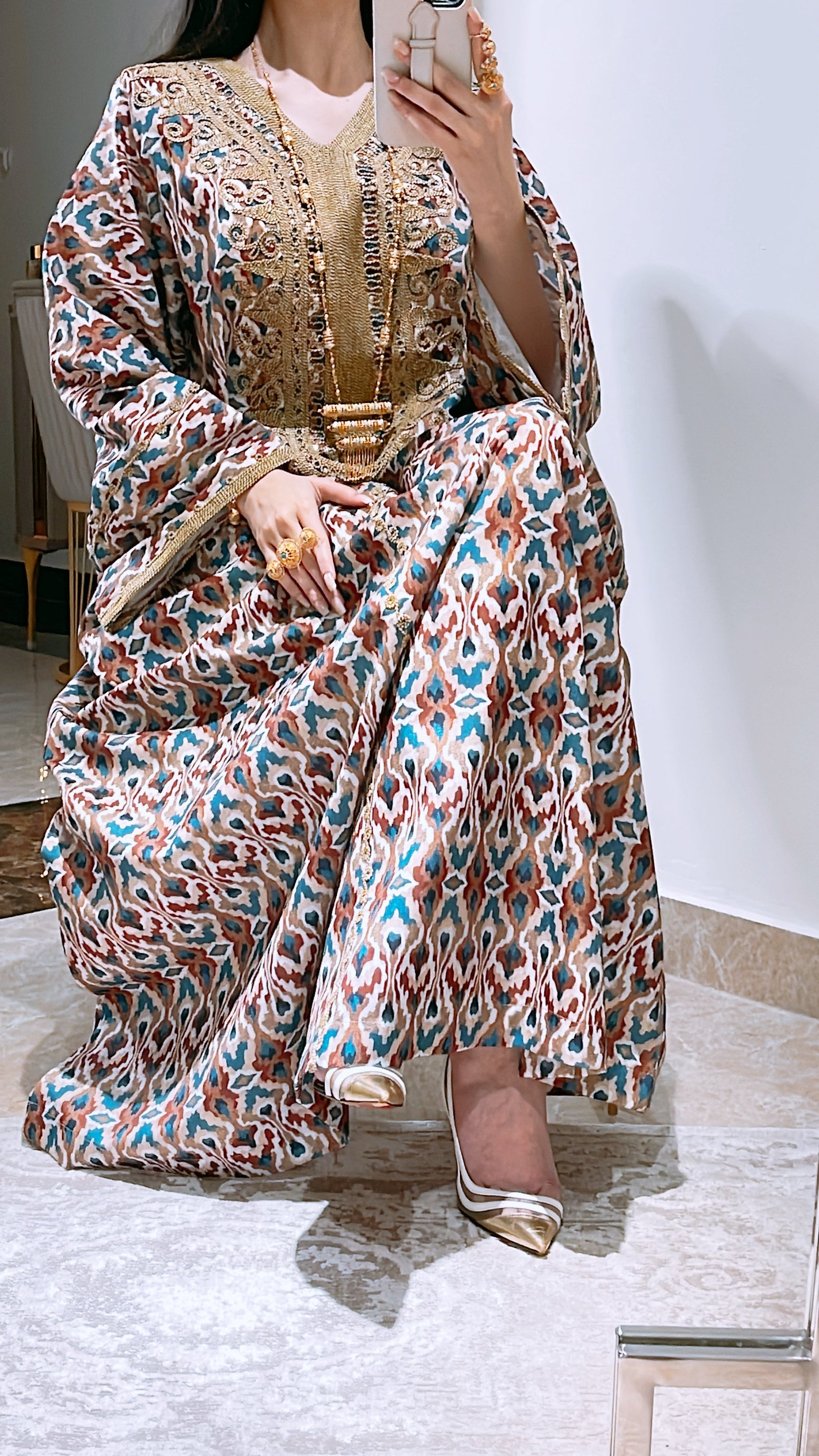 Description: Step into a world of playful whimsy with Cosmic Mosaic. This dress bursts with psychedelic geometric patterns in vibrant hues, evoking a sense of artistic flair and dynamic energy. The tan embroidery along the V-neckline and sleeves provides a grounding contrast, lending a touch of earthy elegance to its bold design. Perfect for casual outings, art events, or simply embracing your creative spirit, Cosmic Mosaic blends expressive style with effortless comfort. The breathable cotton fabric ensures you feel as good as you look, making it a standout addition to any wardrobe.
