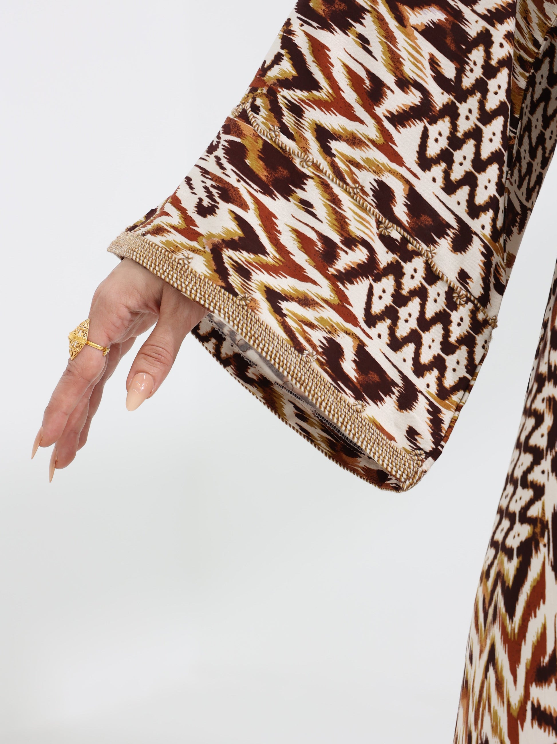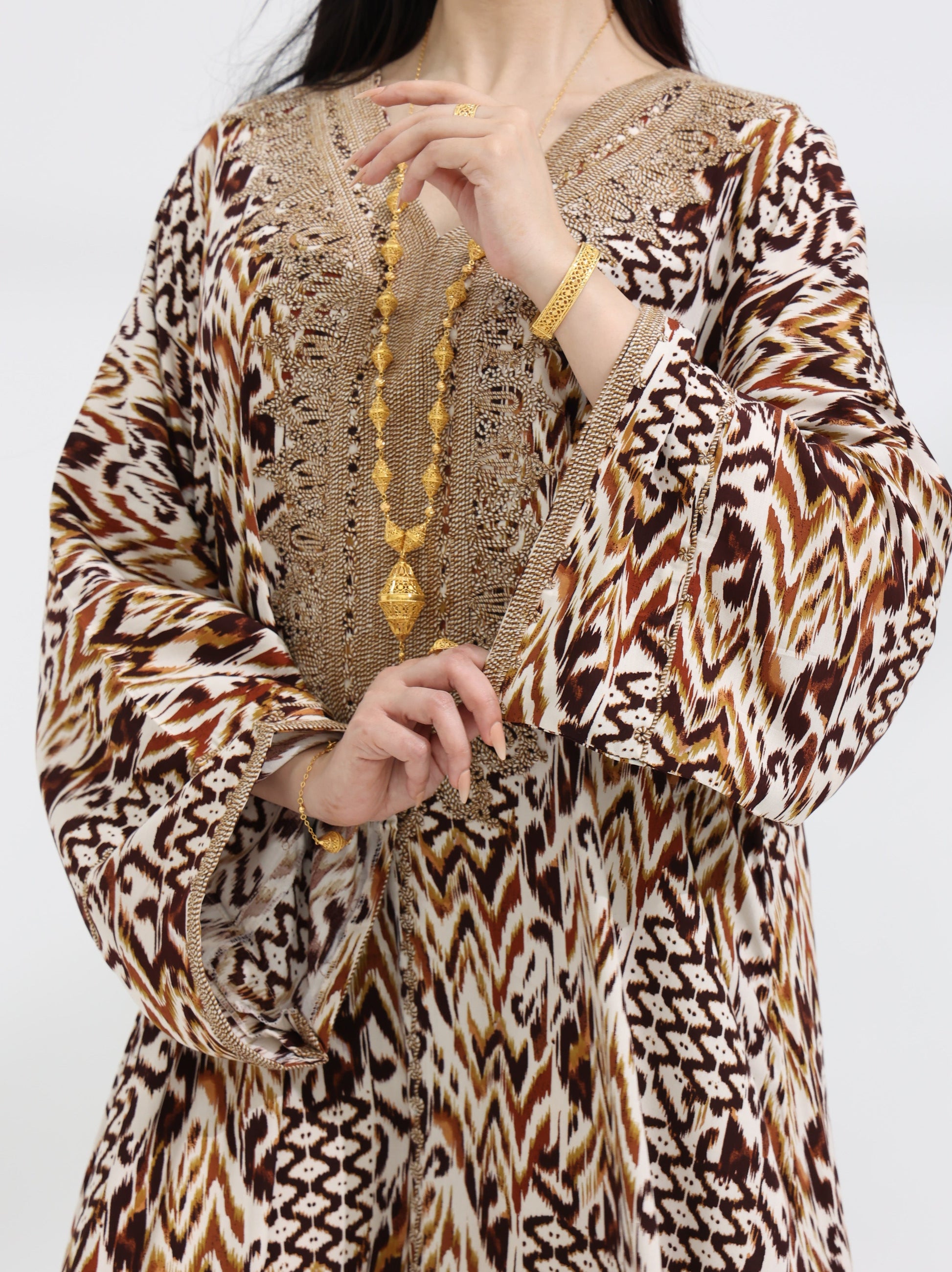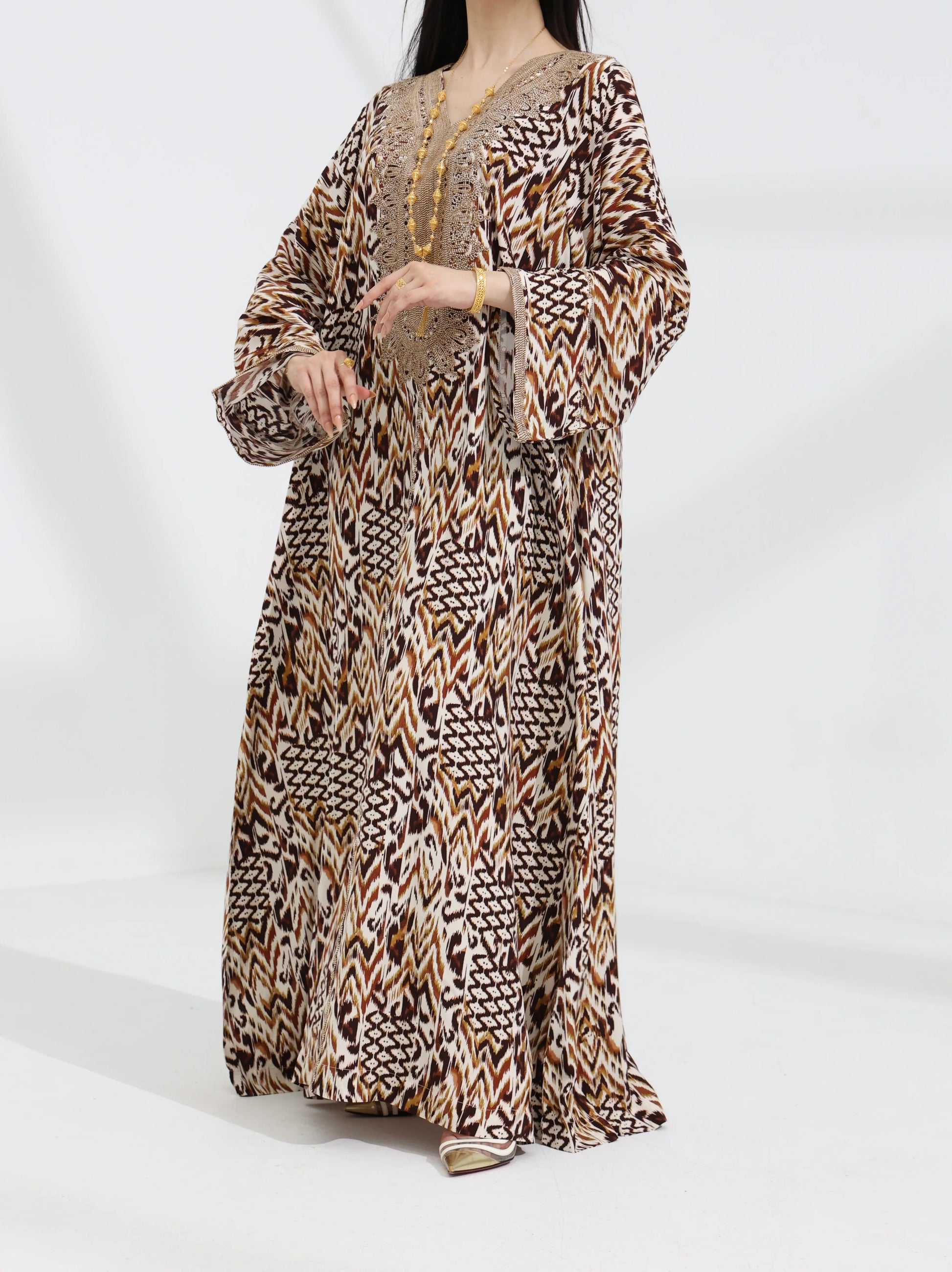 Description: The Earth Harmony dress features a sophisticated geometric pattern in varying shades of brown against a classic white backdrop. Light brown embroidery highlights the design, adding a subtle yet stylish detail. The simple yet striking pattern and color scheme make it a versatile piece for various occasions, blending effortlessly with both casual and dressier outfits.