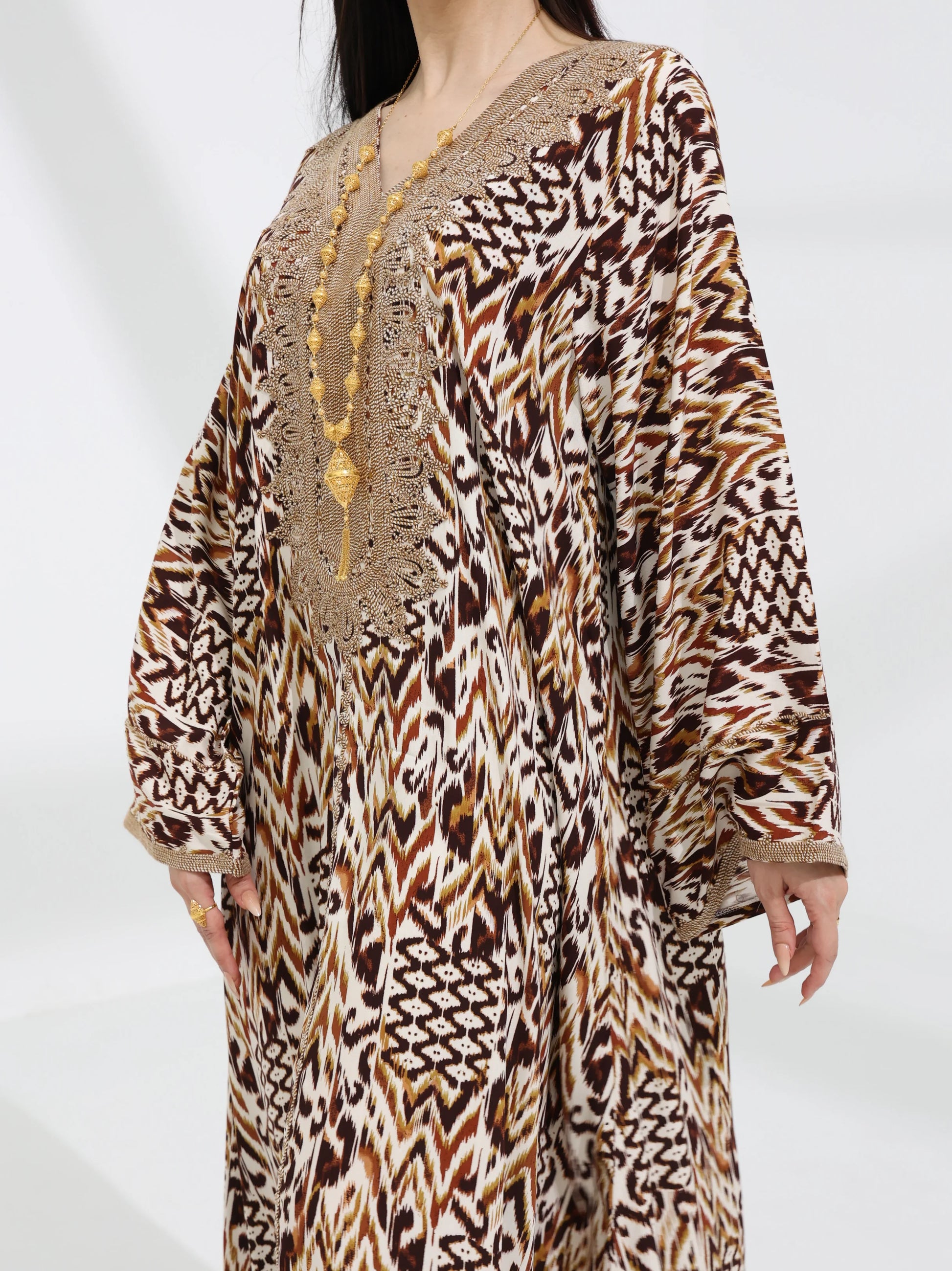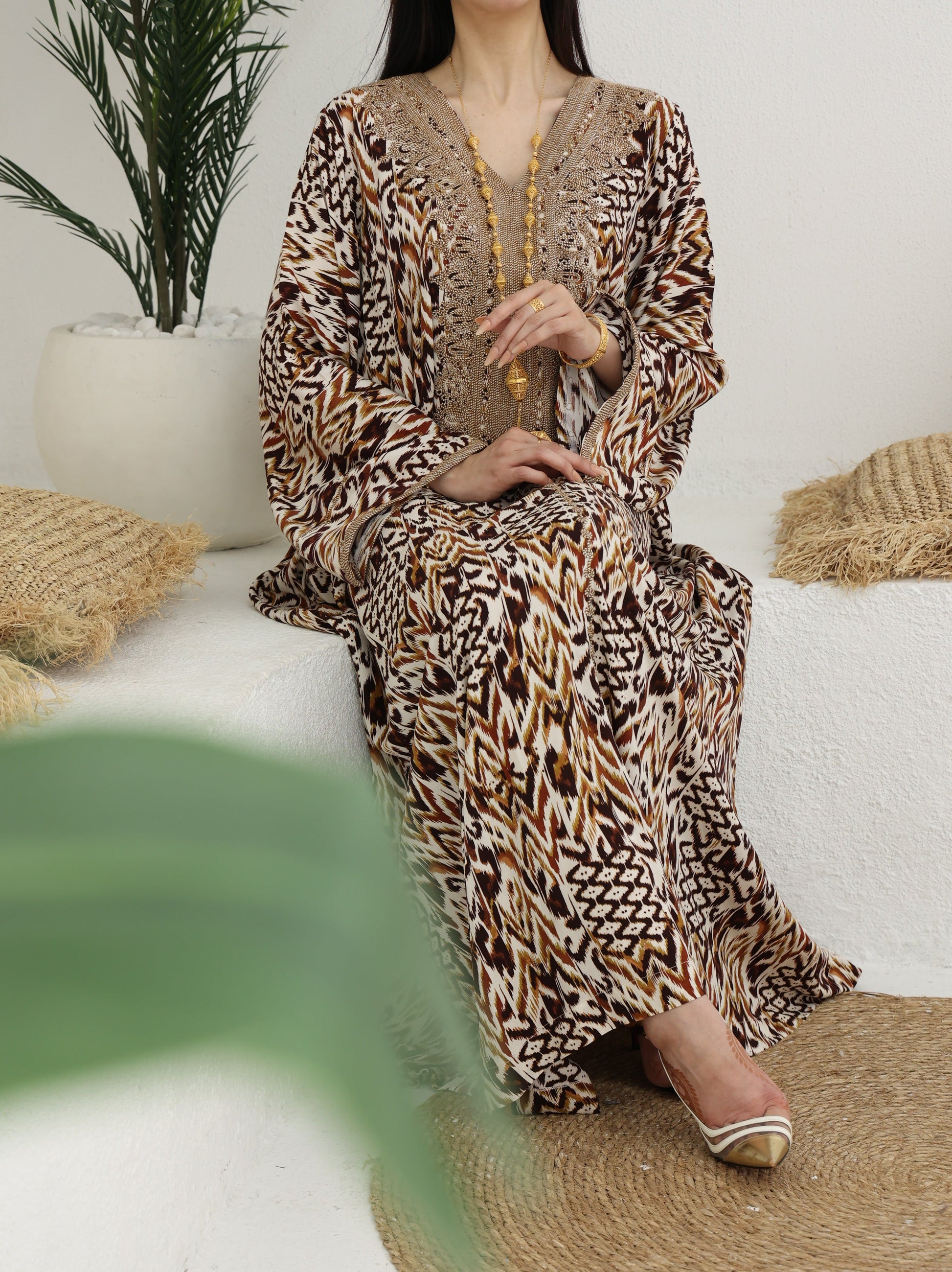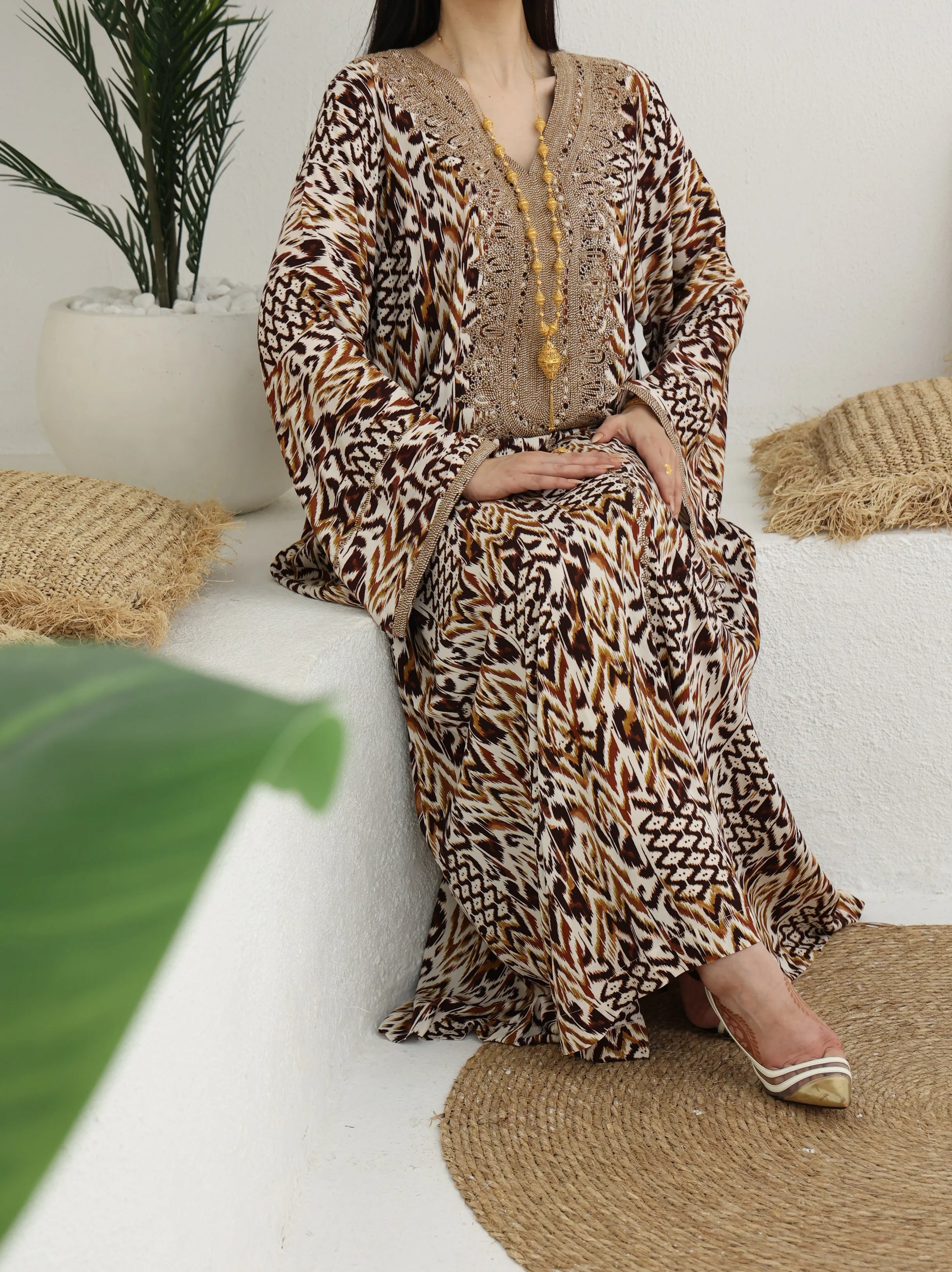 Description: The Earth Harmony dress features a sophisticated geometric pattern in varying shades of brown against a classic white backdrop. Light brown embroidery highlights the design, adding a subtle yet stylish detail. The simple yet striking pattern and color scheme make it a versatile piece for various occasions, blending effortlessly with both casual and dressier outfits.