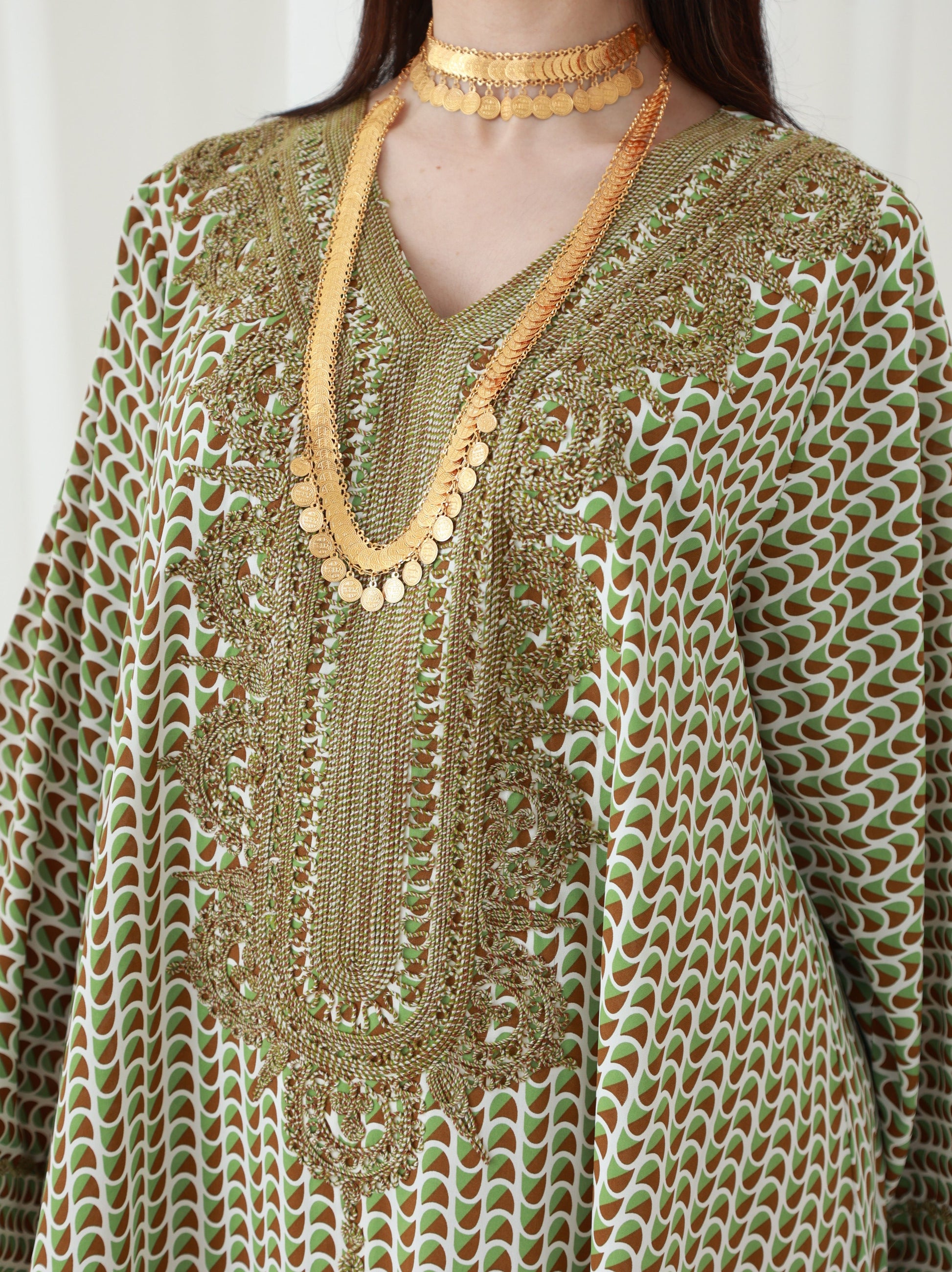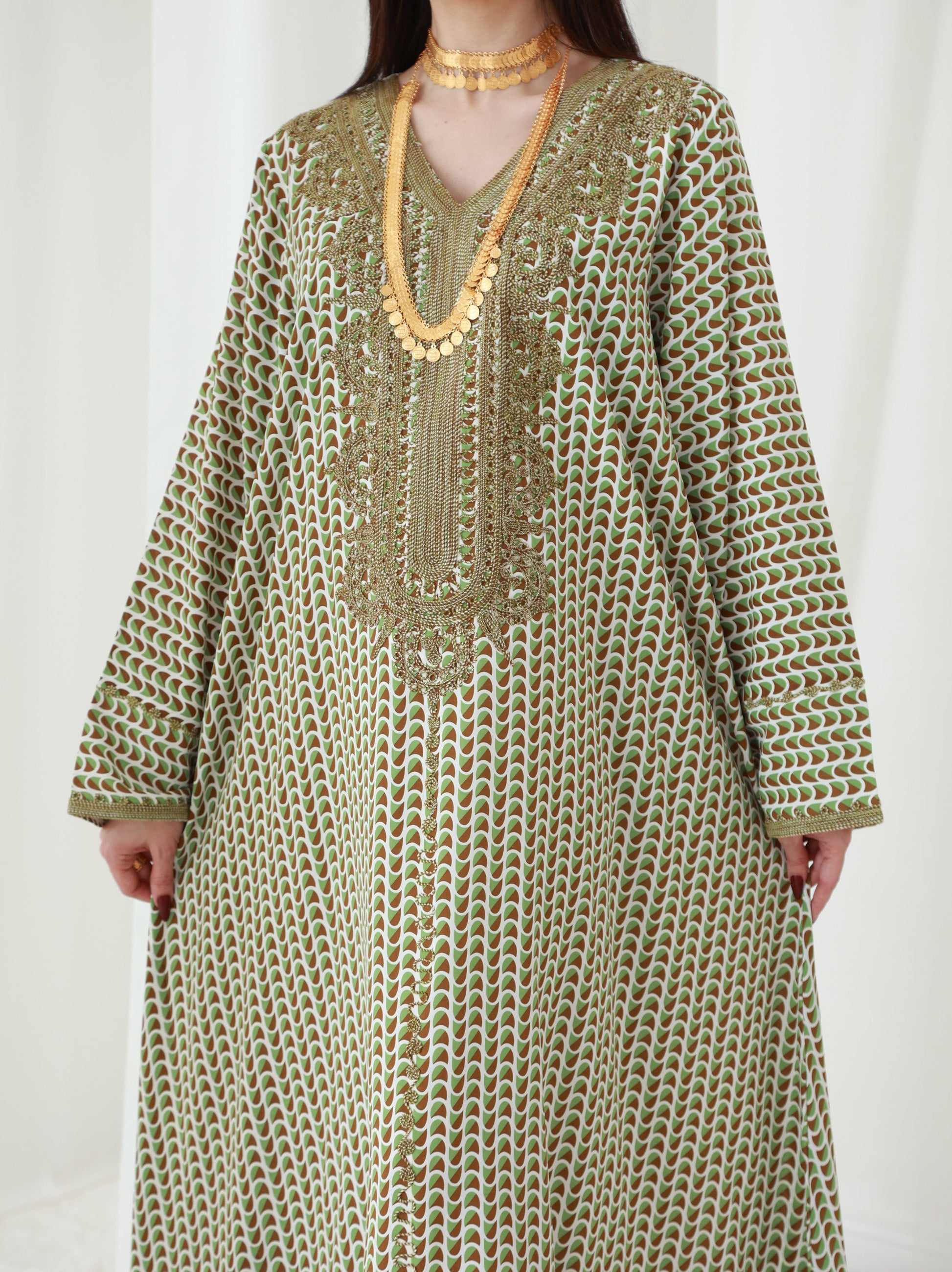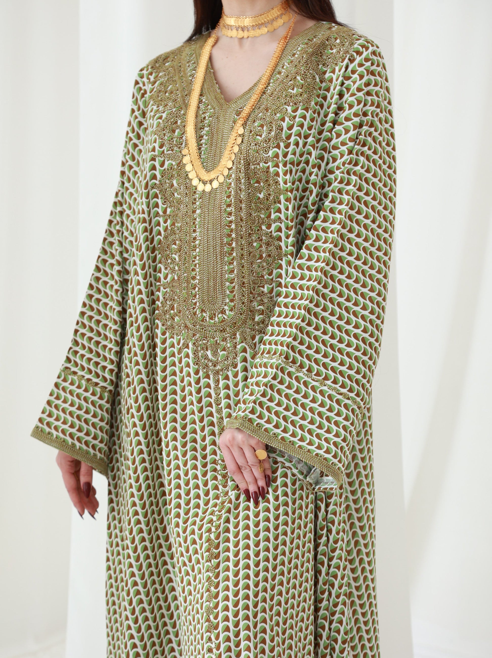 Elevate your wardrobe with this mesmerizing kaftan in Forest Fern Green, a stunning mix of olive and emerald hues. The intricate golden embroidery accentuates the neckline and cascades down the bodice, while the flowing bell sleeves add a dramatic flair. Crafted from premium, breathable fabric, this outfit is perfect for day-to-night transitions, ensuring comfort and elegance. Measuring 58 inches in length and 23 inches at the chest, this versatile piece includes free alterations for a personalized fit. Ideal for both formal occasions and laid-back evenings, this kaftan is a statement of effortless style.