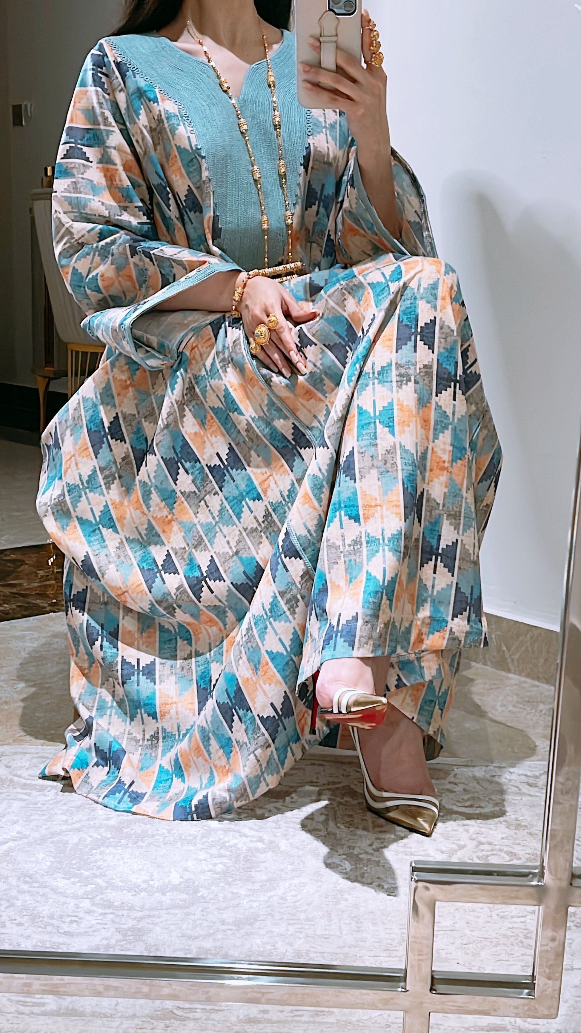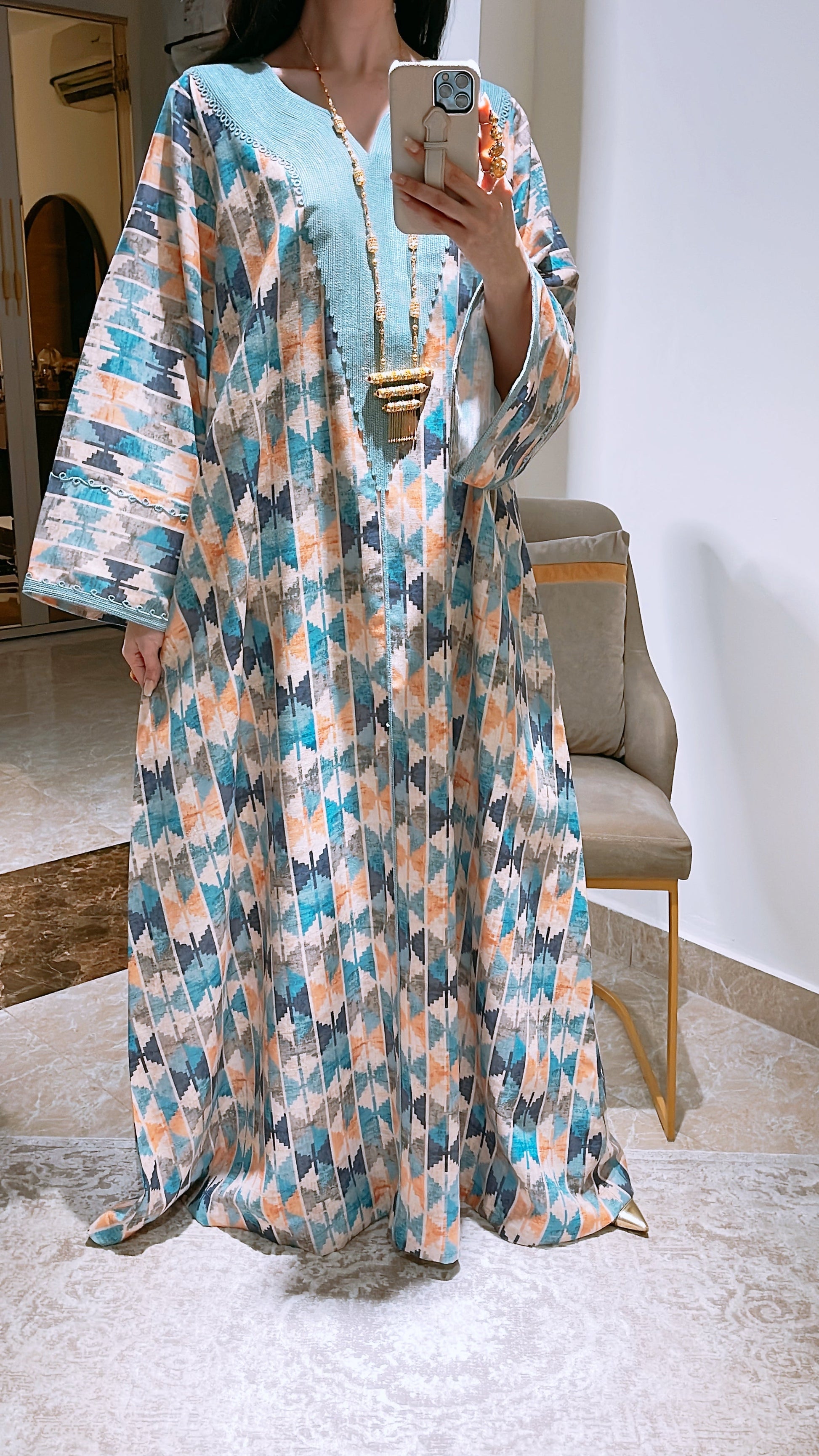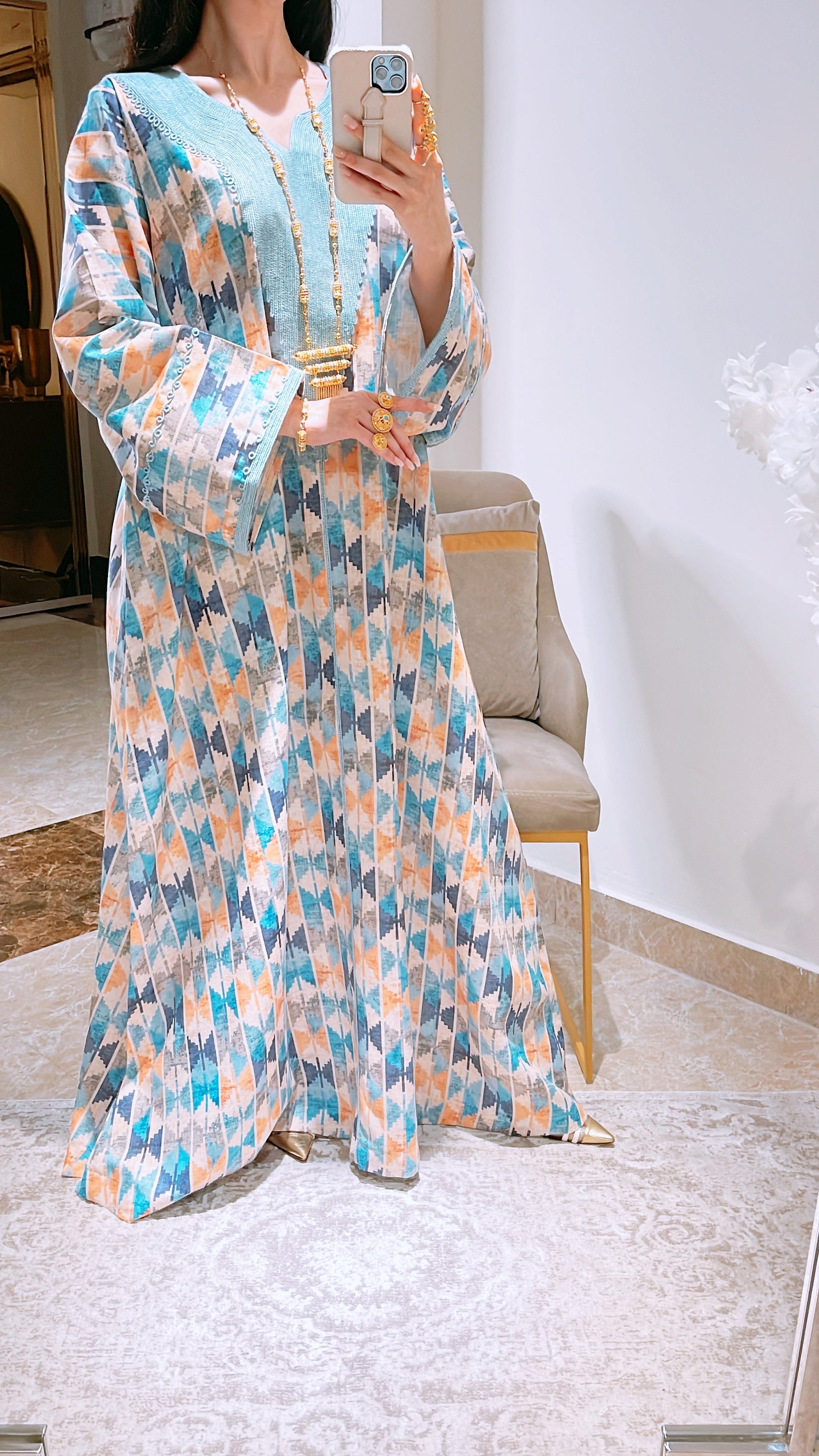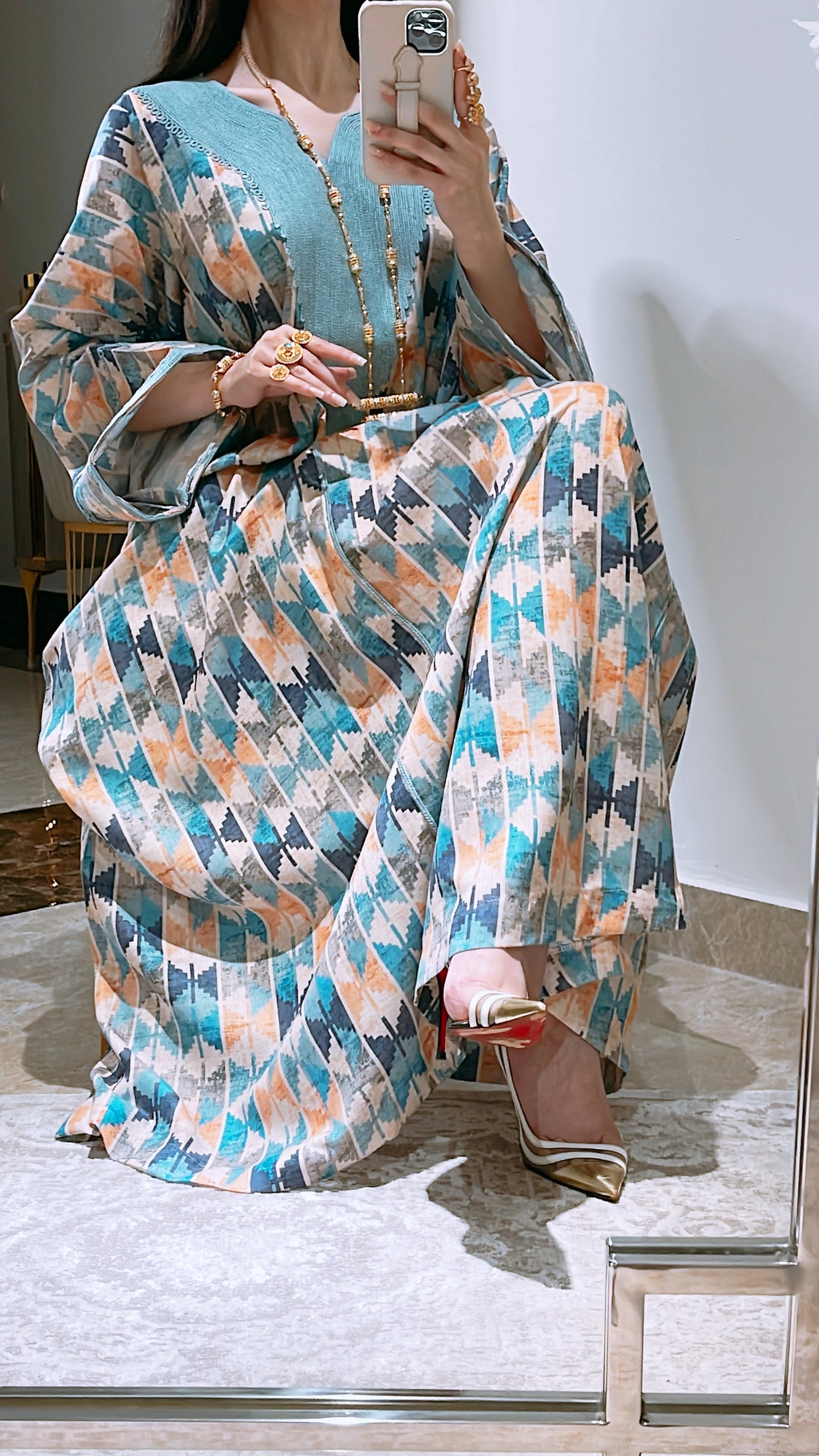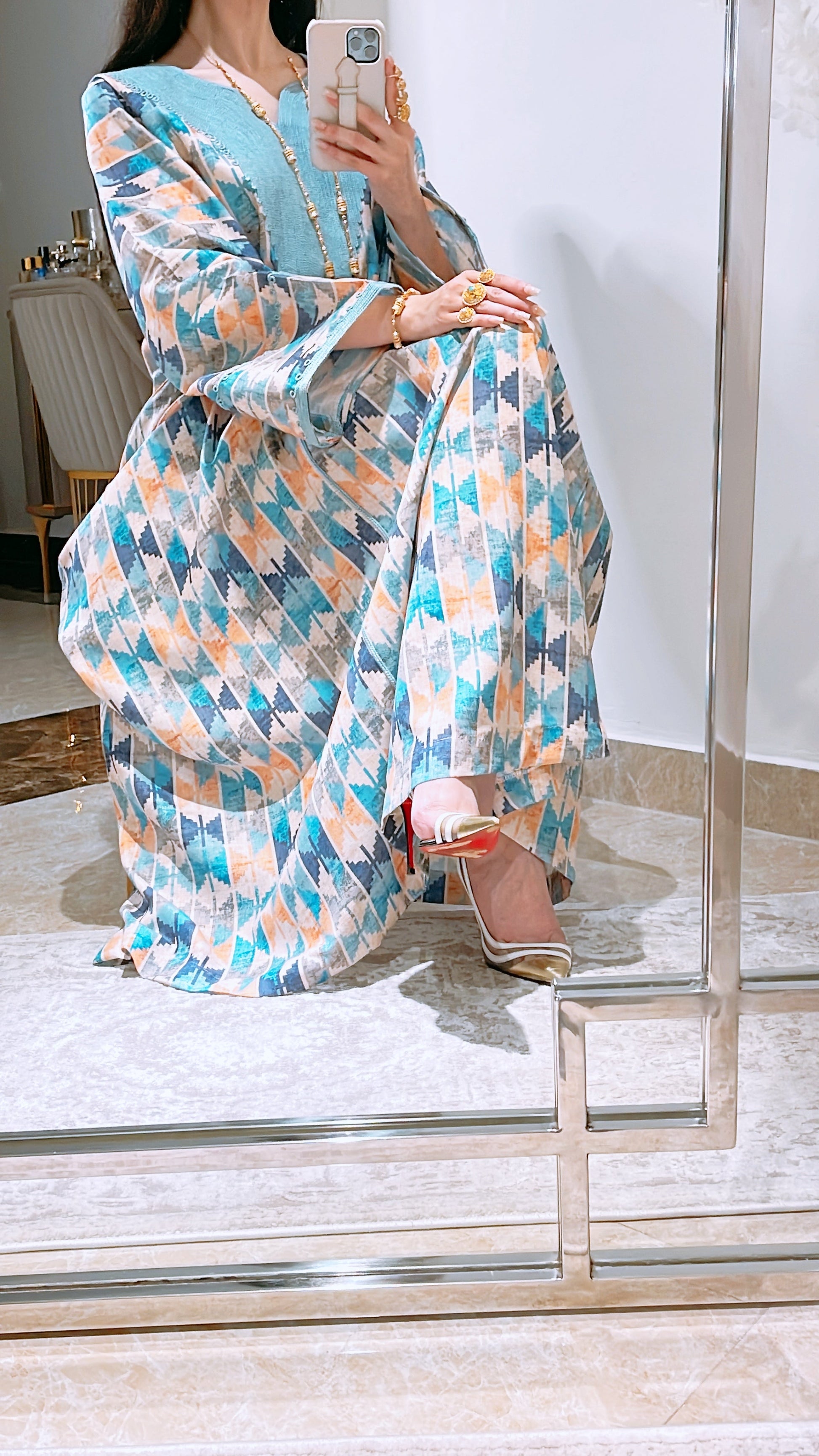 Description: Skyline Prism is a delightful blend of modern design and soft elegance. The crisp white base is adorned with a dynamic arrangement of navy, baby blue, orange, and grey triangular patterns, creating a playful yet balanced aesthetic. Baby blue embroidery accents the notched neckline and sleeves, adding a subtle touch of refinement. Ideal for casual outings or laid-back gatherings, this dress combines vibrant geometric motifs with understated details. The breathable cotton fabric ensures comfort, making Skyline Prism a versatile and stylish choice for your wardrobe.